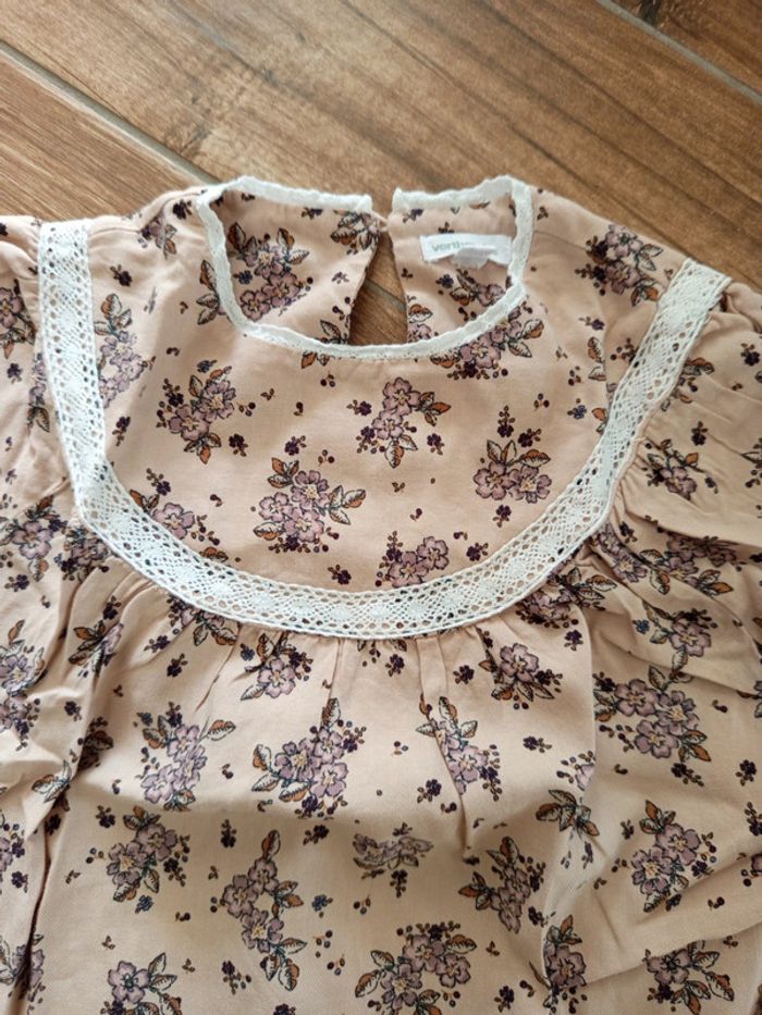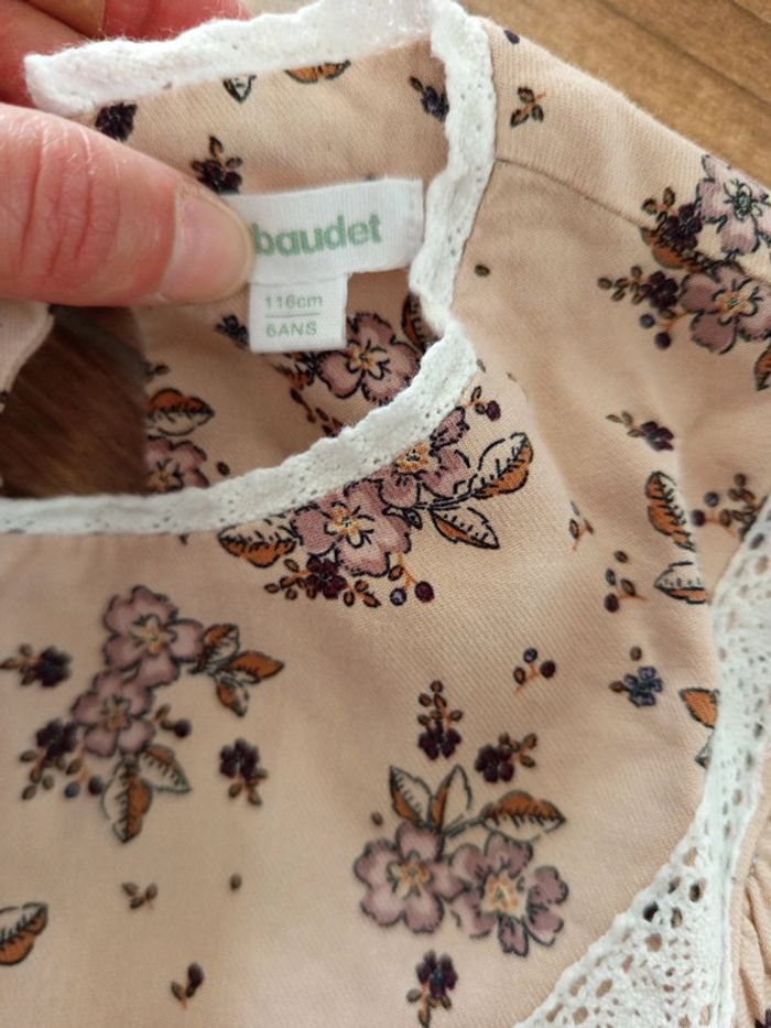 Robe style rétro vintage beige avec motif liberty parme, détail dentelle encolure et manches 6 ans Vertbaudet Très peu portée