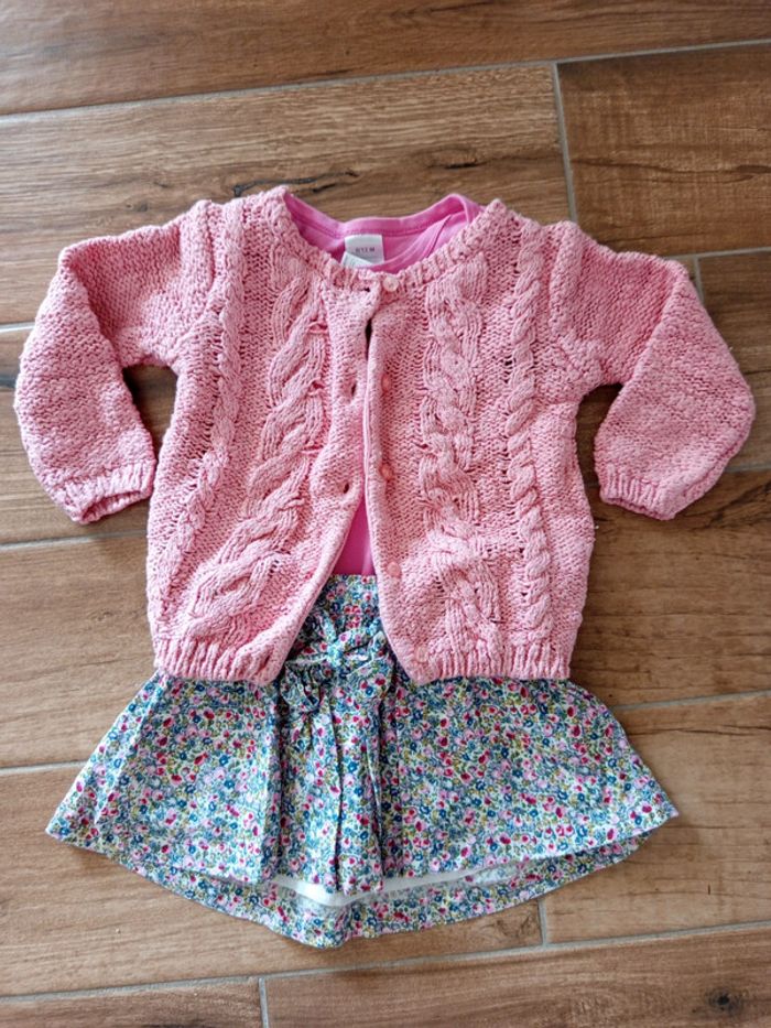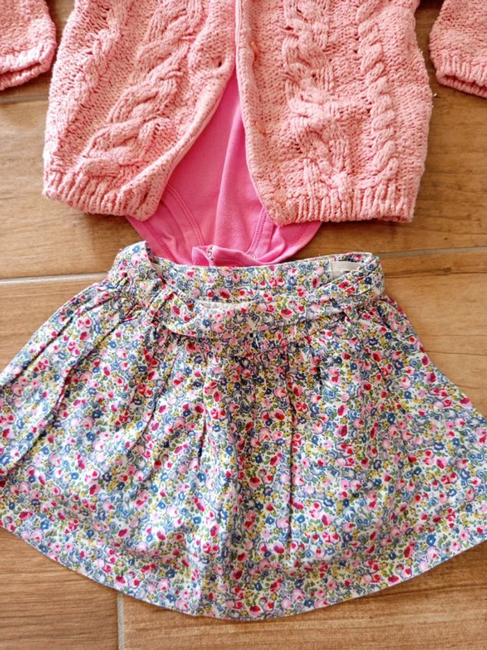 Ensemble 12 mois. Jupe liberty+ body rose+ gilet torsadé - photo numéro 1