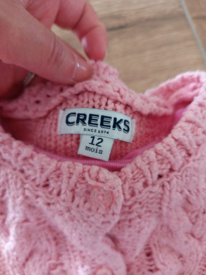 Ensemble 12 mois Jupe liberty bleu rose avec ceinture nouée, Tape a l'oeil Bodies manche courte rose Gilet maille torsadée rose , Creeks