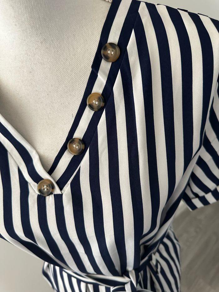 Robe - Excellent état - Taille 36/38 équivalent S/M Dimensions en bas de l’annonce - Bleue marine et blanche - Marinière, à rayures - Col en V - Boutons décoratifs - Ceinture et passants à la taille - Manches courtes - Pas d’étiquette de taille ni de matière - Style pin-up, vintage, rockabilly Dimensions: - 55cm niveau aisselles - 92cm de long