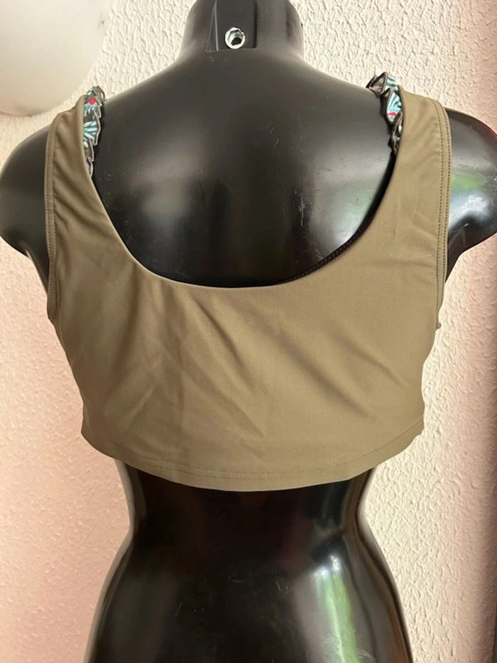 Haut de maillot de bain zippée post opératoire. Matière UV 50 conçue pour protéger activement la peau des rayons du soleil  Forme brassière avec doublure toute douce et coques moulées intégrées bien souples  Poches intégrées de chaque côté pour y insérer facilement vos prothèses en toute discrétion  Décolleté V bordé d'un volant imprimé "Graphique" devant et dans le haut du dos  Couvre la poitrine à la perfection même allongée sur le ventre  Entièrement zippé devant avec crochet à la base lichette imprimée et rabat intérieur : décolleté ajusté enfilage facile et aucun risque de blessure Elastique souple sous poitrine pour assurer un joli galbe et le maintien des prothèses  Composition : 80% polyamide 20% élasthanne protection UV 50  Doublure 90% polyester 10% élasthanne Taille : 100D Coloris : bronze Prix : 8€ Neuf jamais porté #sisterkayasvfemme100D #sisterkayamaillotdebain Réf : à.ai +1