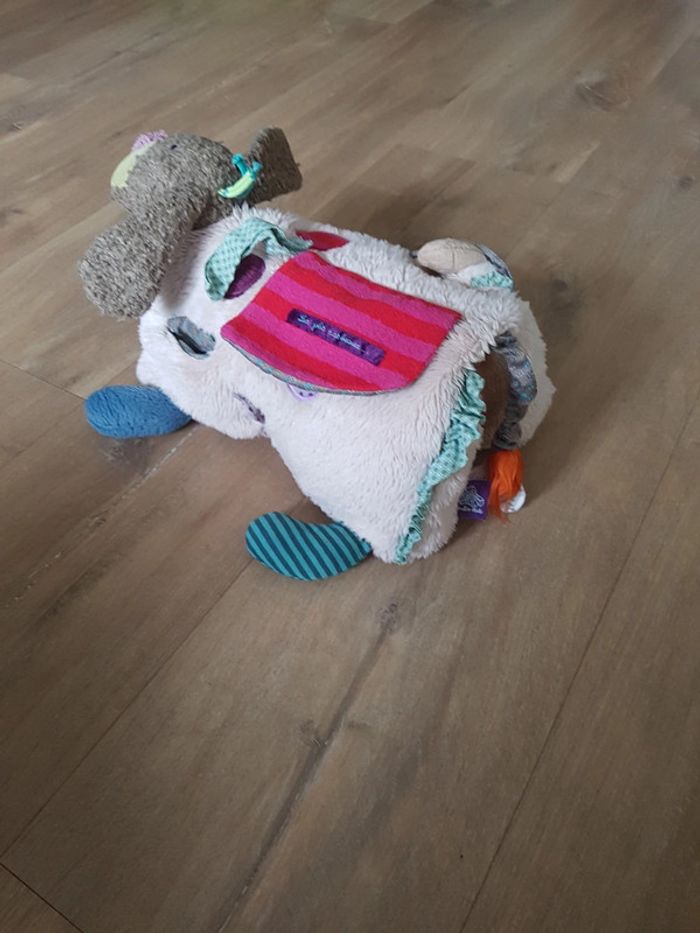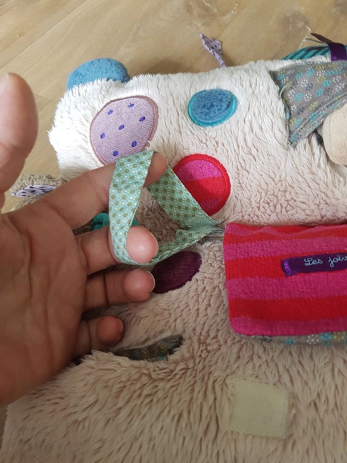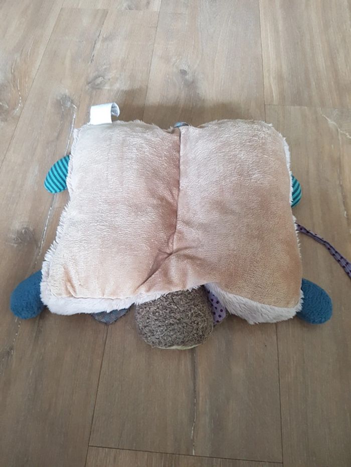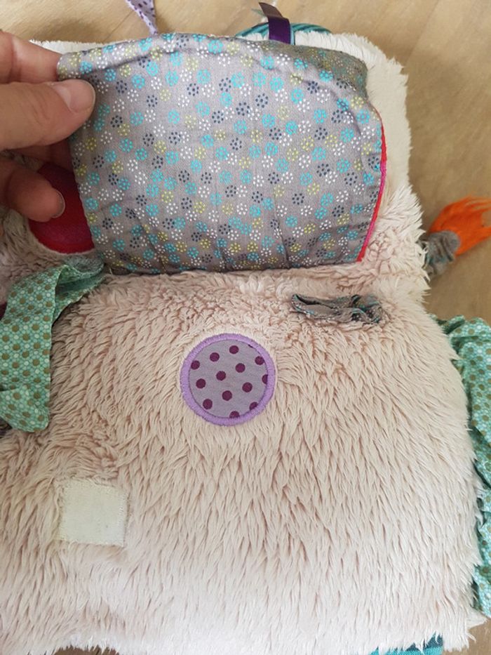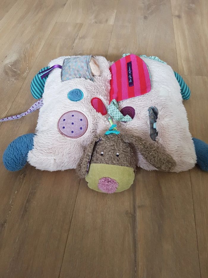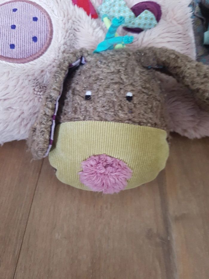 Adorable coussin chien Moulin Roty, idéal pour l'éveil avec différentes matières à toucher, différents sons : les oreilles font bruit de papier froissé, pouet-pouet, le miroir n'a plus de reflet mais brille! Il a une sangle à scratch pour pouvoir l'attacher. #aline_38_peluche