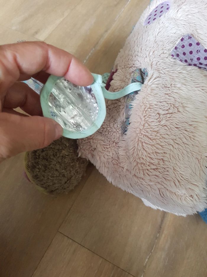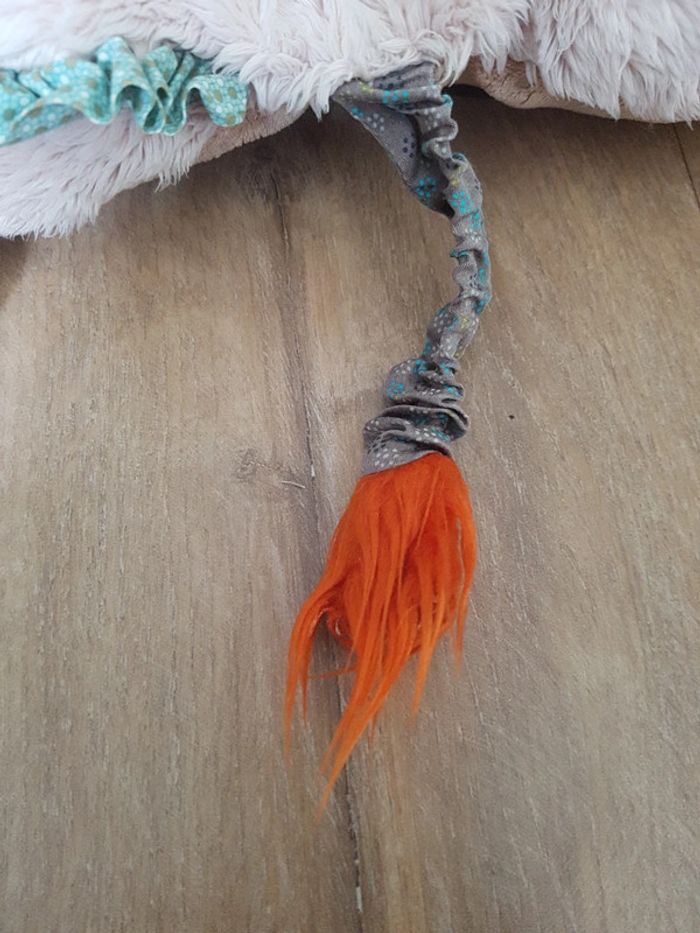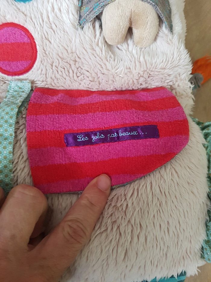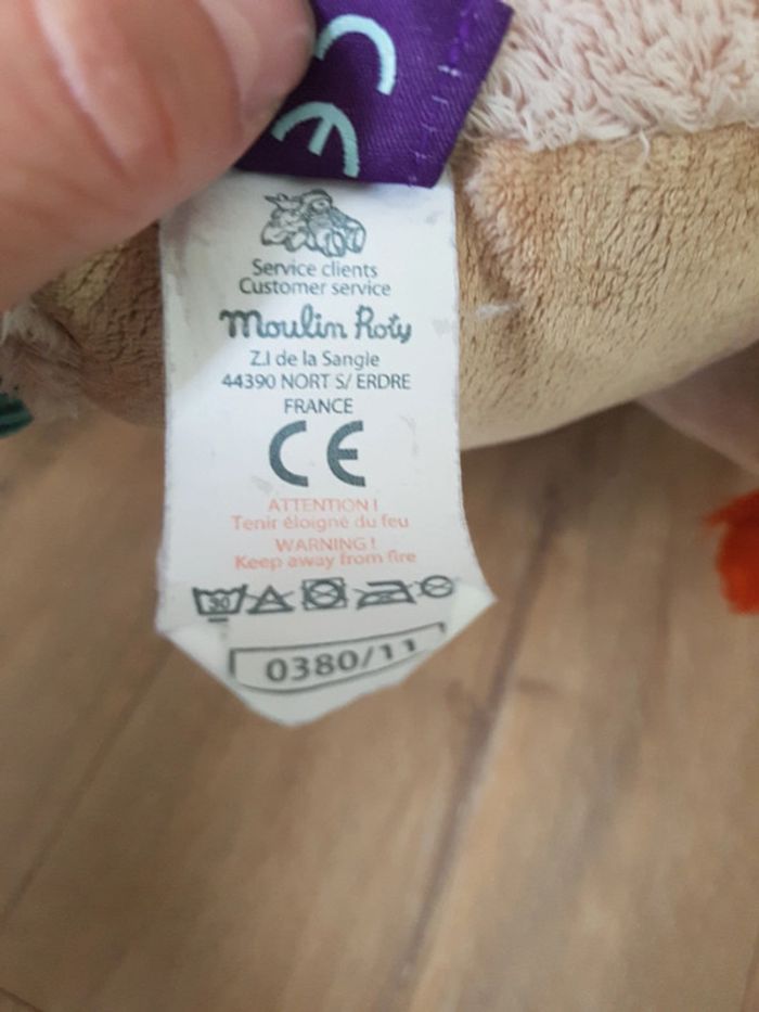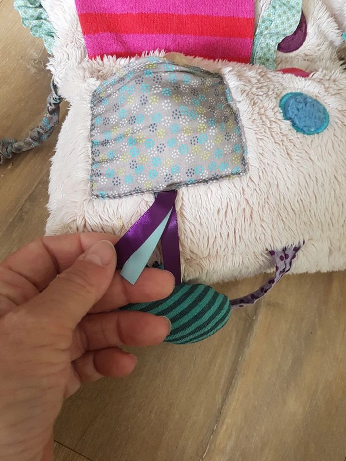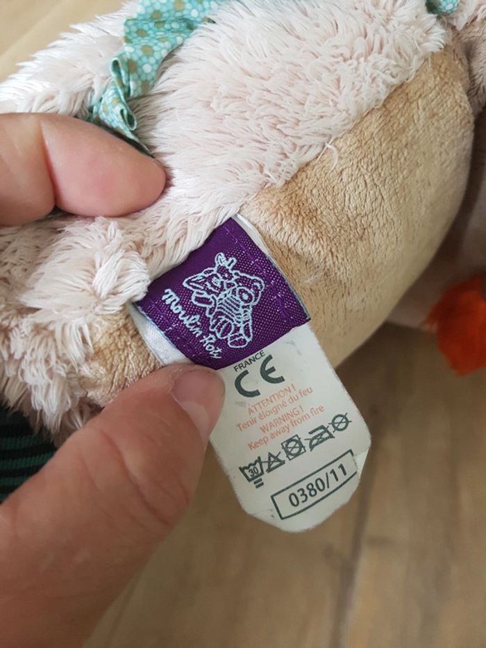 Adorable coussin chien Moulin Roty, idéal pour l'éveil avec différentes matières à toucher, différents sons : les oreilles font bruit de papier froissé, pouet-pouet, le miroir n'a plus de reflet mais brille! Il a une sangle à scratch pour pouvoir l'attacher. #aline_38_peluche