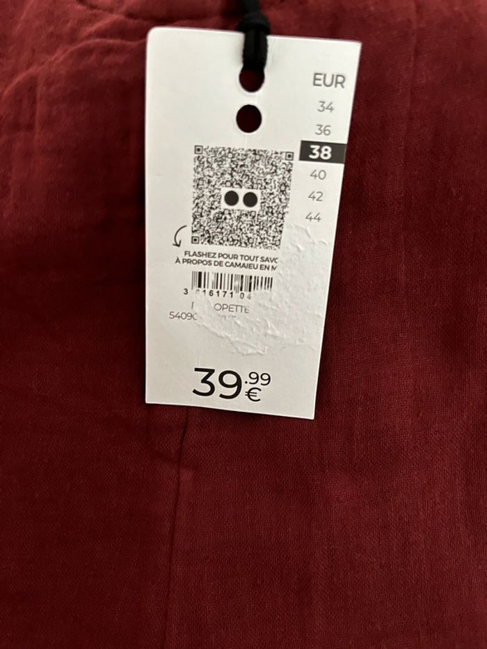 Combi short bordeaux taille 38, 100 % coton T-shirt noir non fourni