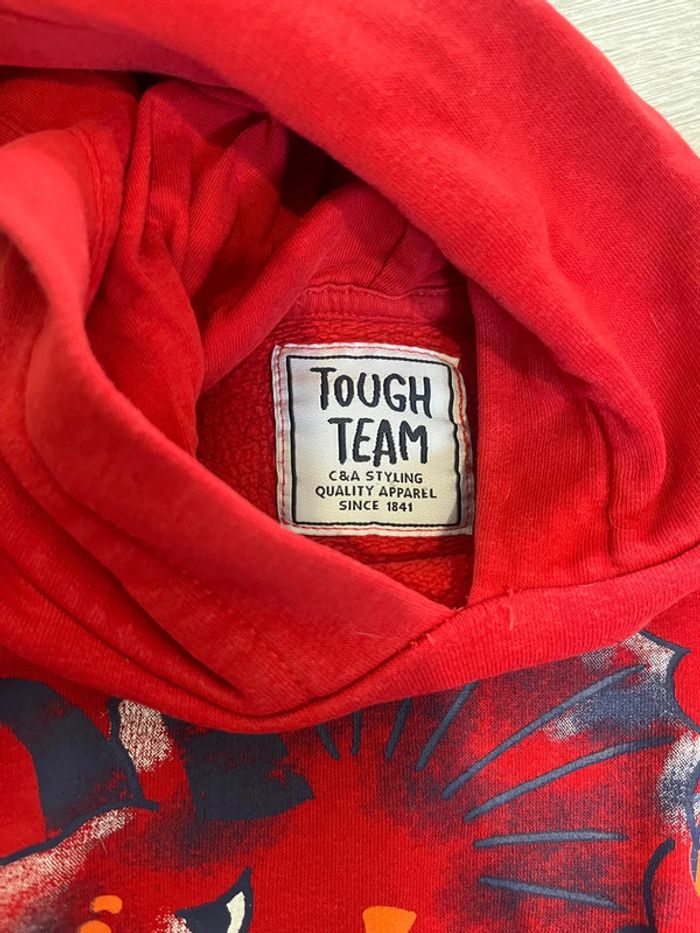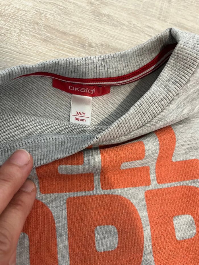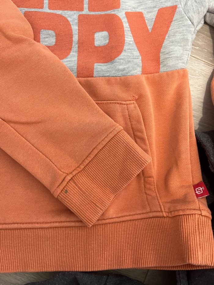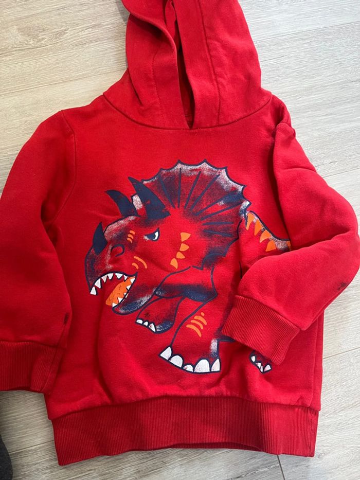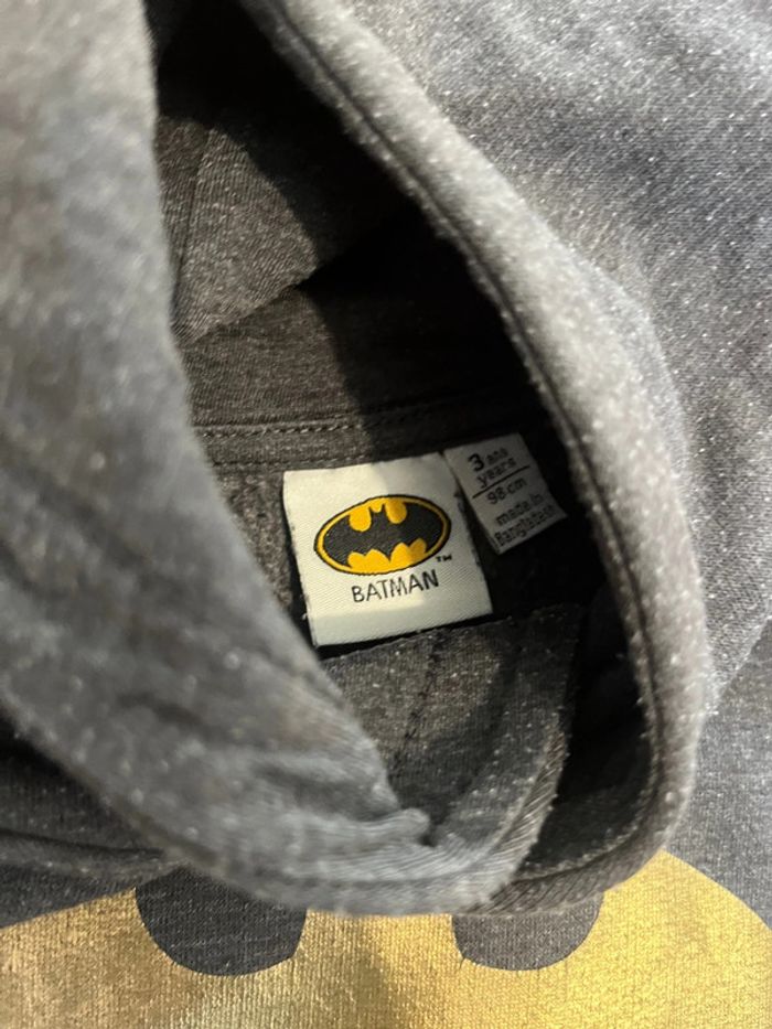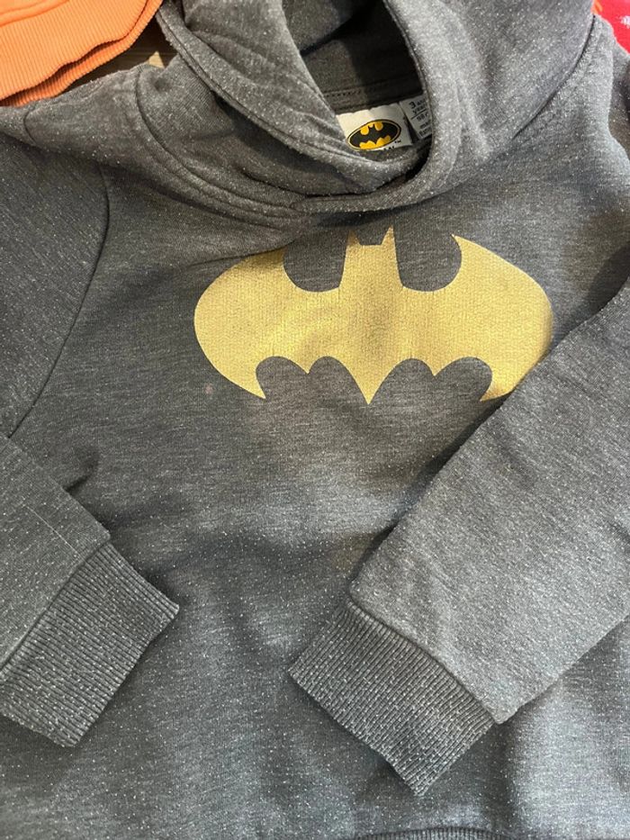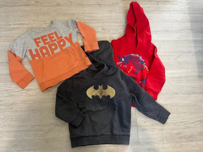 2 sweats à capuche et un pull, chacun présente un petit défaut mais peuvent largement avoir une nouvelle vie - Batman : tache en-dessous du logo - le rouge tache sur les manches - le okaidi point de couture Taille 3 ans - 98cm 2€ à l’unité