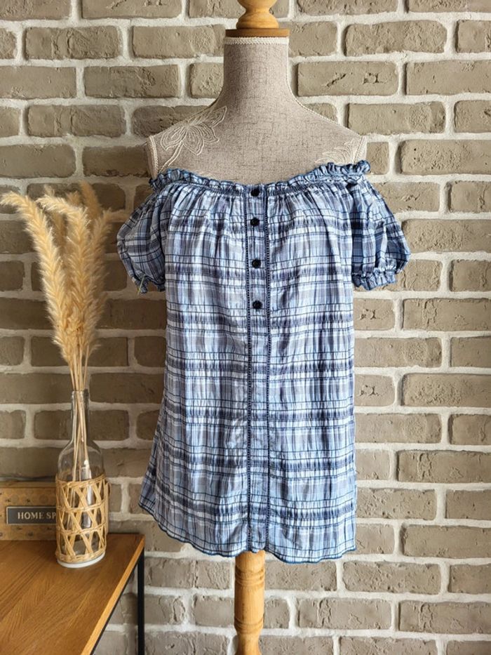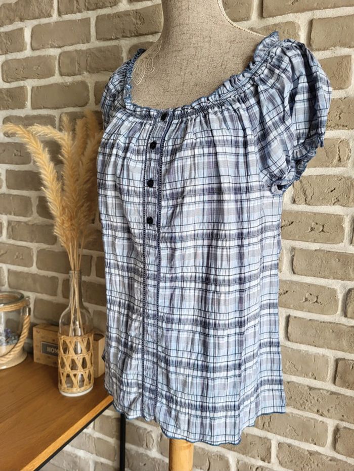 💝 Bénéficiez d'une réduction en créant lot dans mon dressing 🛍️ 🌸 Blouse à manches courte Burton of London en parfait état 🎀 Tissu avec un effet gaufré imprimé carreaux bleu Quelques fils métallisés argentés apportent un peu de brillance 🪷 Coupe ample, encolure élastique qui peut être portée sur les épaules Boutonnée sur le haut avec un liseré ajouré Manches courtes légèrement bouffantes 🍥 Taille L 40 🩷 Idéale pour un look cottagecore, bohème ou champêtre ! Associez-la à un jean taille haute ou un short en lin selon la saison pour une allure douce et naturelle
