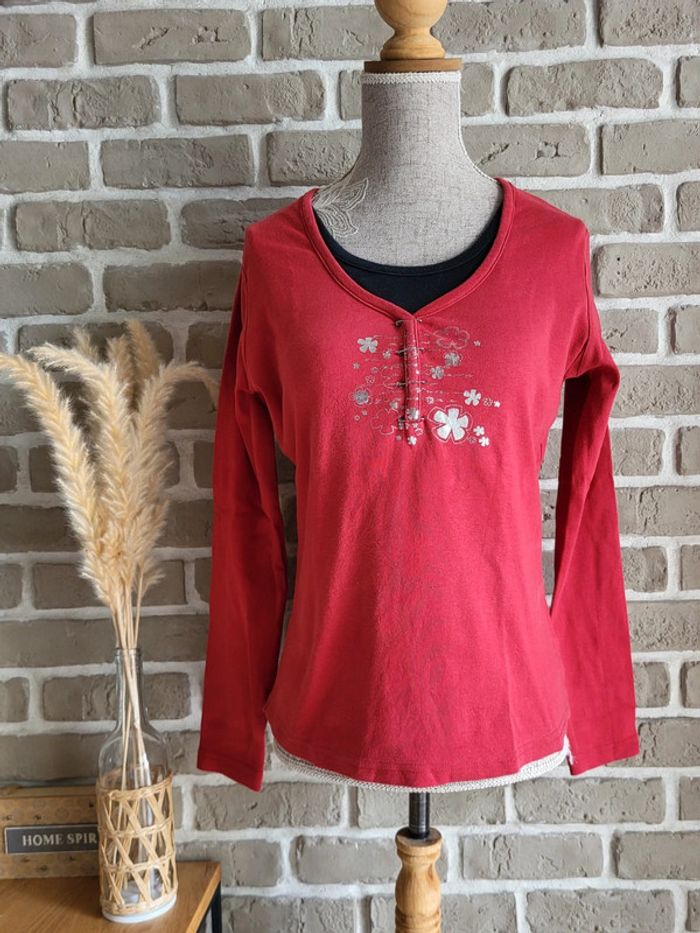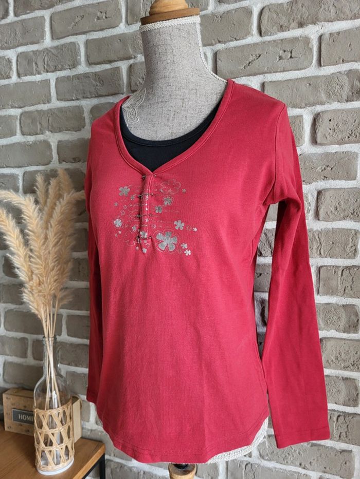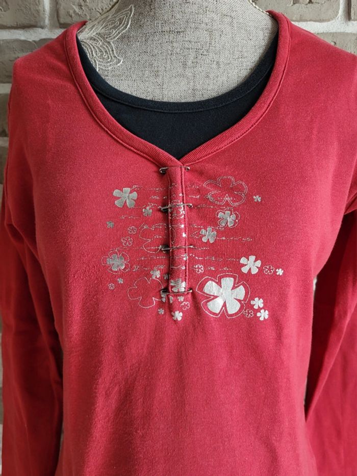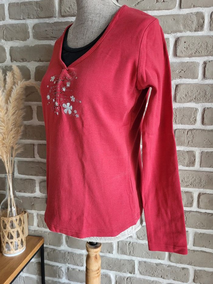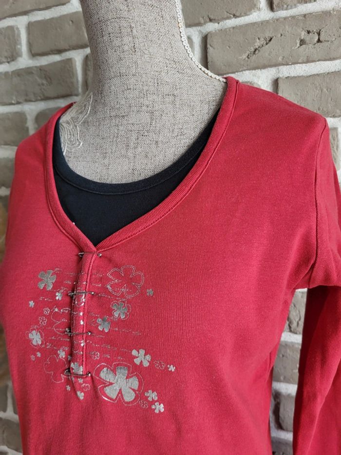 💝 Bénéficiez d'une réduction en créant lot dans mon dressing 🛍️ 🌸 T-shirt à manches longues vintage provenant d'une ancienne collection Cache Cache Bon état, sans défaut à signaler 🎀 En coton rouge avec détails fleuris argentés 🪷 Coupe confortable Col V avec épingles à nourrice décorative et effet de superposition noir intégré 🍥 Taille 3 qui correspond à du M 38 🩷 Un esprit très années 80 "En rouge et noir" à affirmer avec un legging en similicuir noir, des bottes à talons et une ceinture large