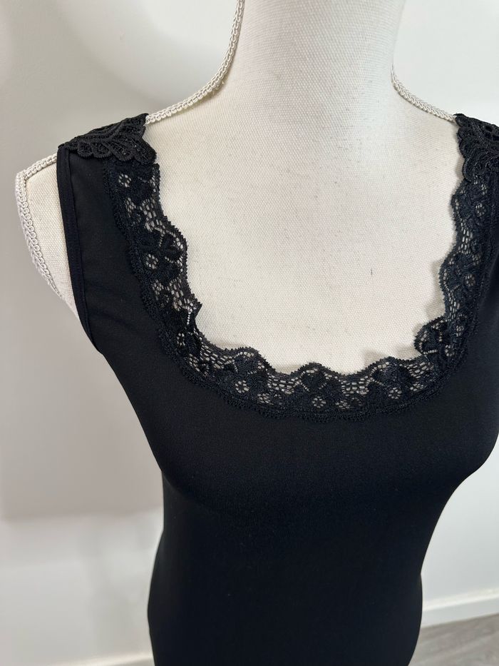 Débardeur - Excellent état - Taille 42 équivalent XL Dimensions en bas de l’annonce - Marque Rodier - Couleur noire - Dentelle au niveau du col - Dentelle et broderies dans le dos - Tissus stretch - Polyamide et élastane - Prix d’achat: 120€ Dimensions: - 40 à 55cm niveau aisselles - 64cm de long