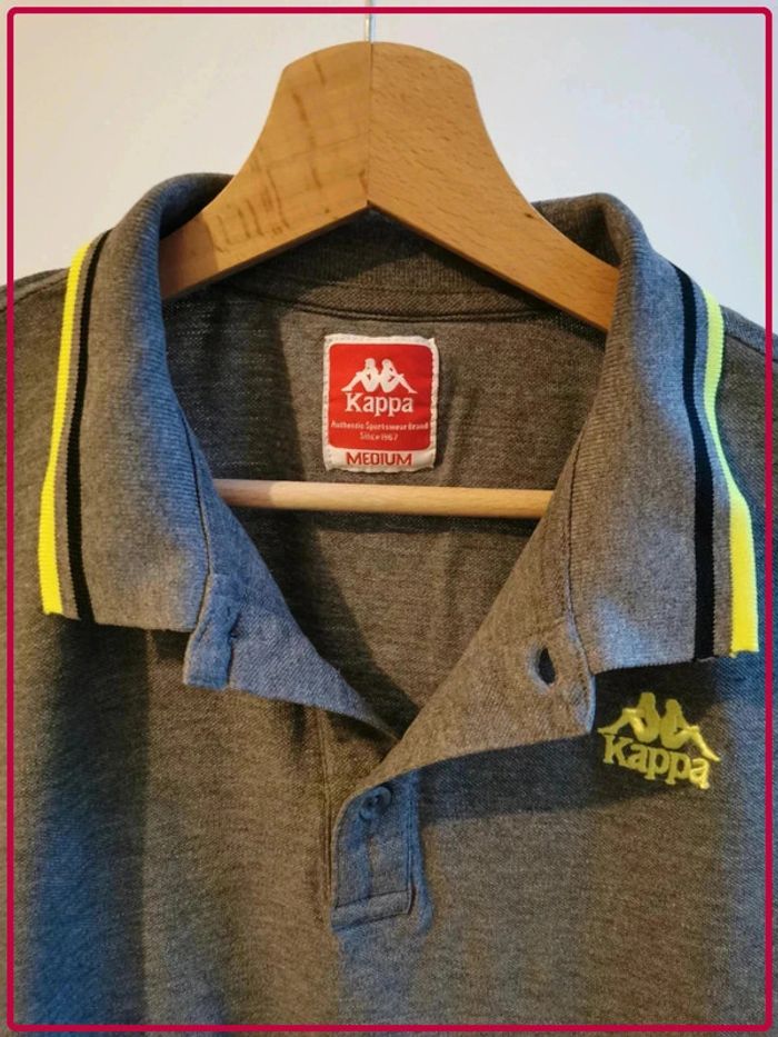 Polo homme gris avec liseré noir et jaune au niveau du col et des manches. Marque Kappa, taille M. #giulia9516hommeM #kappa #polo #gris