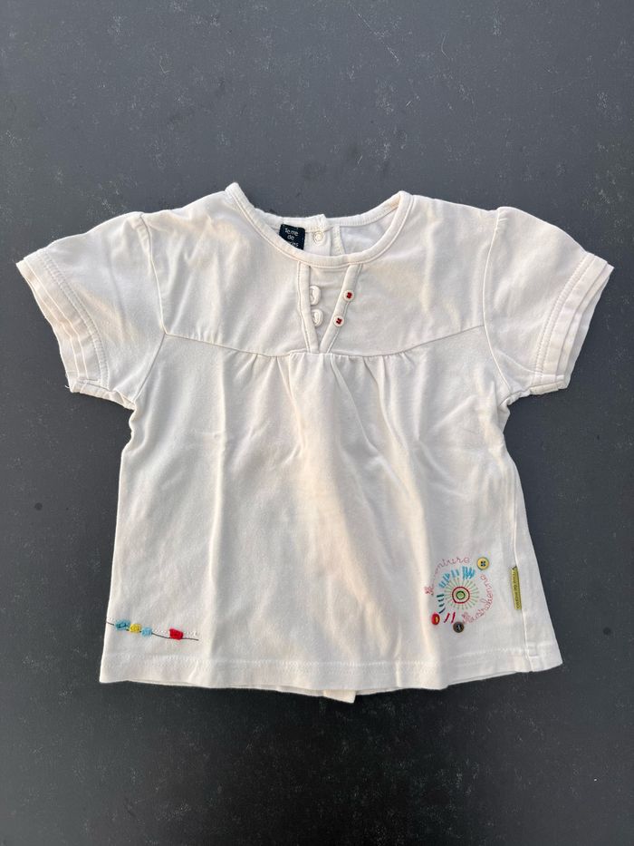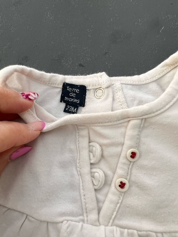 Tee-shirt à manches courtes de couleur blanc, fermeture par boutons pressions au dos. Petites broderies sur le devant. En parfait état, aucune tâche ni trou. Très peu porté. En coton et elasthanne. Taille 23 mois, marque Terre de Marins. Envoi rapide et soigné, réduction automatique dès 2 articles sélectionnés. Mes autres ventes ici: #24moisfilleugolola #24moisfille #fille24mois #2ansfille #terredemarins #terredemarins2ansfille