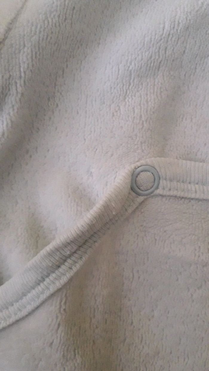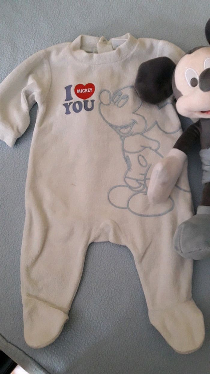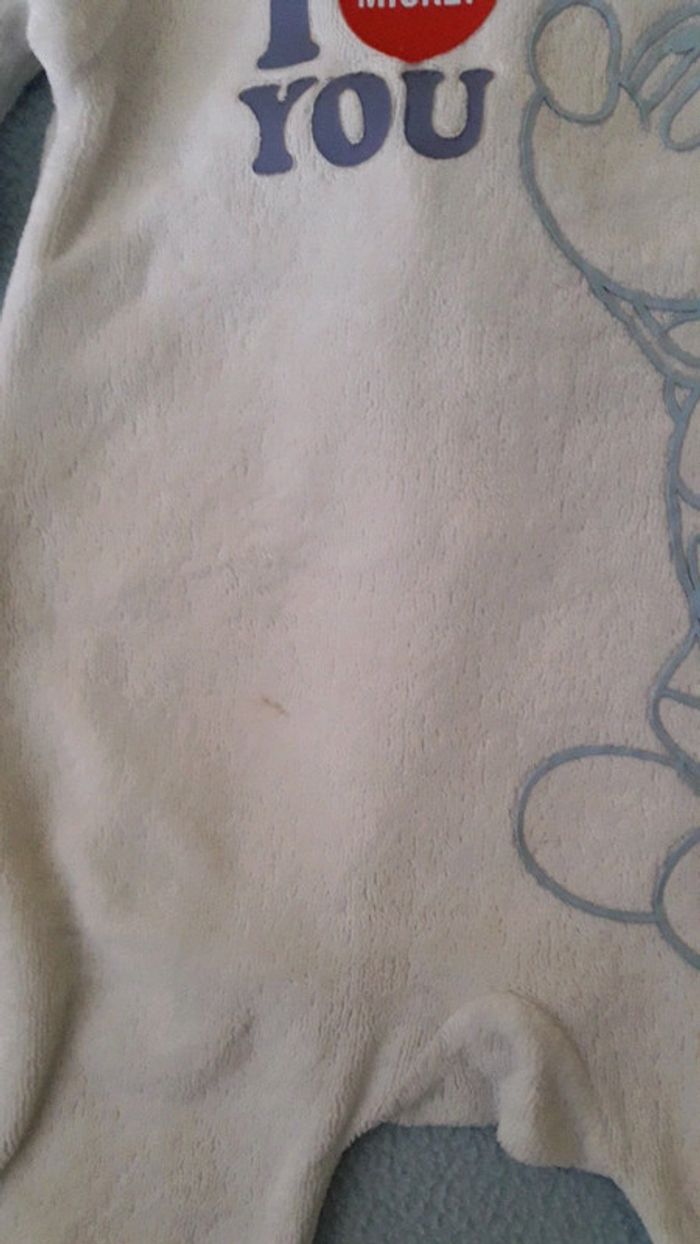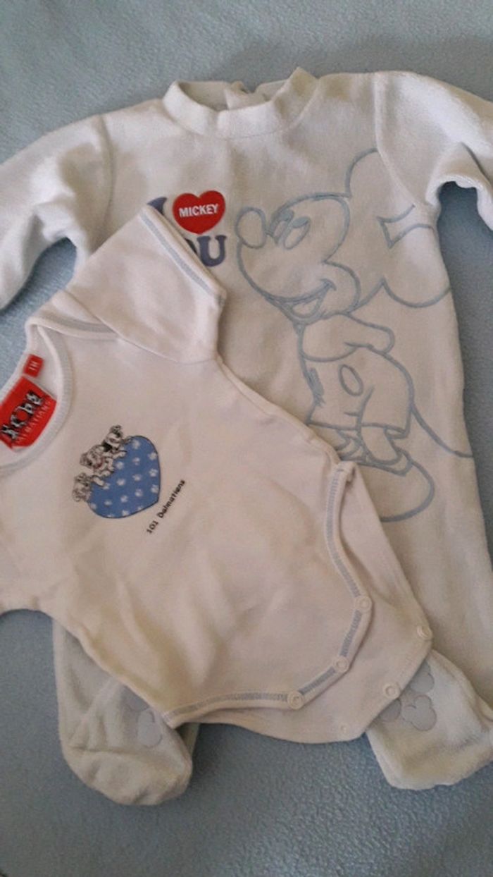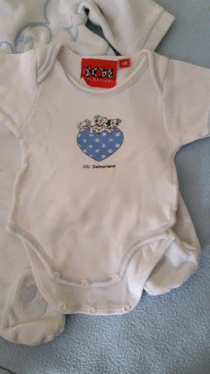 1 mois...Pyjama type velours, petite tâche devant et trou minuscule au dos, bodie manche courte, pressions plastiques
