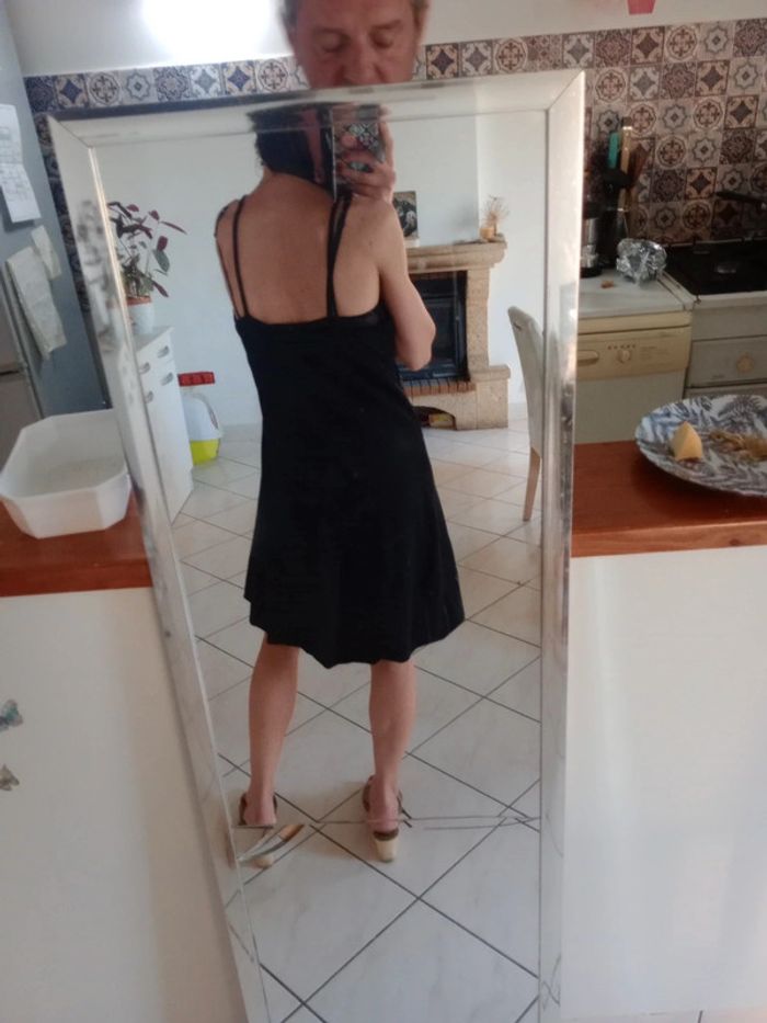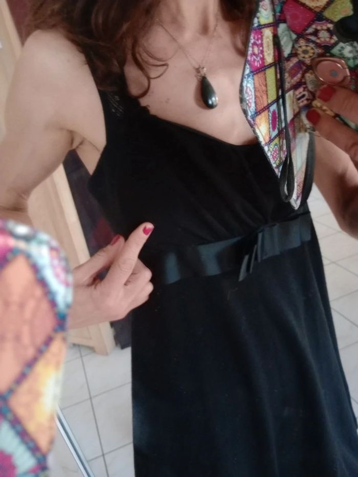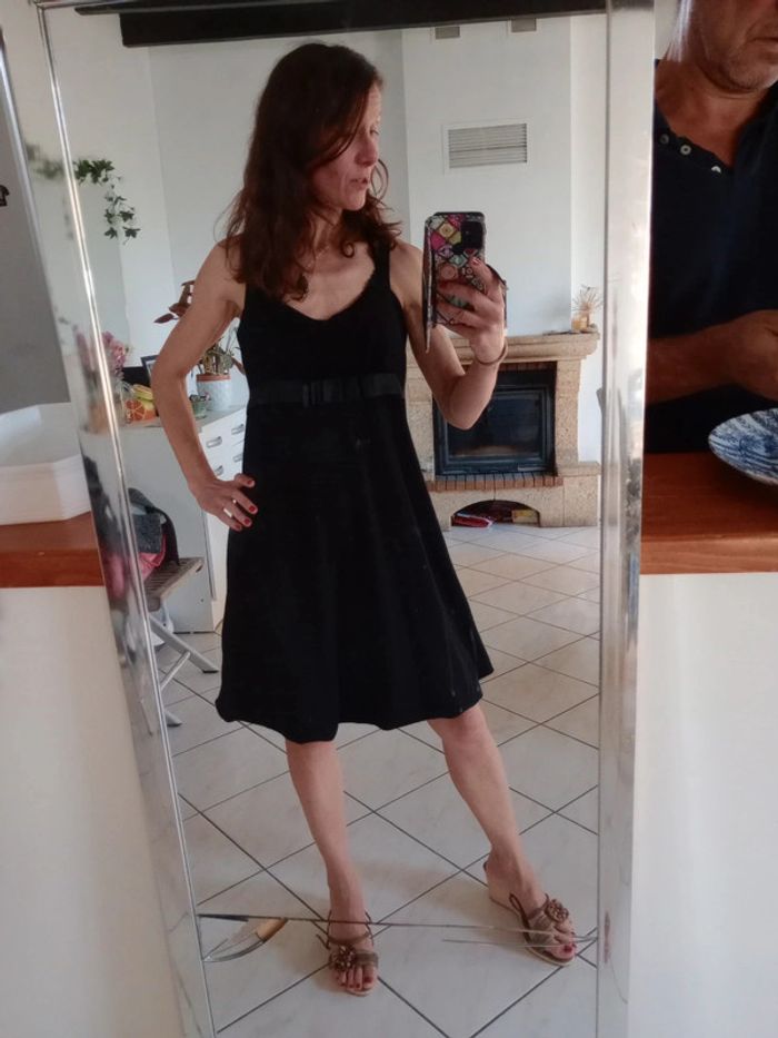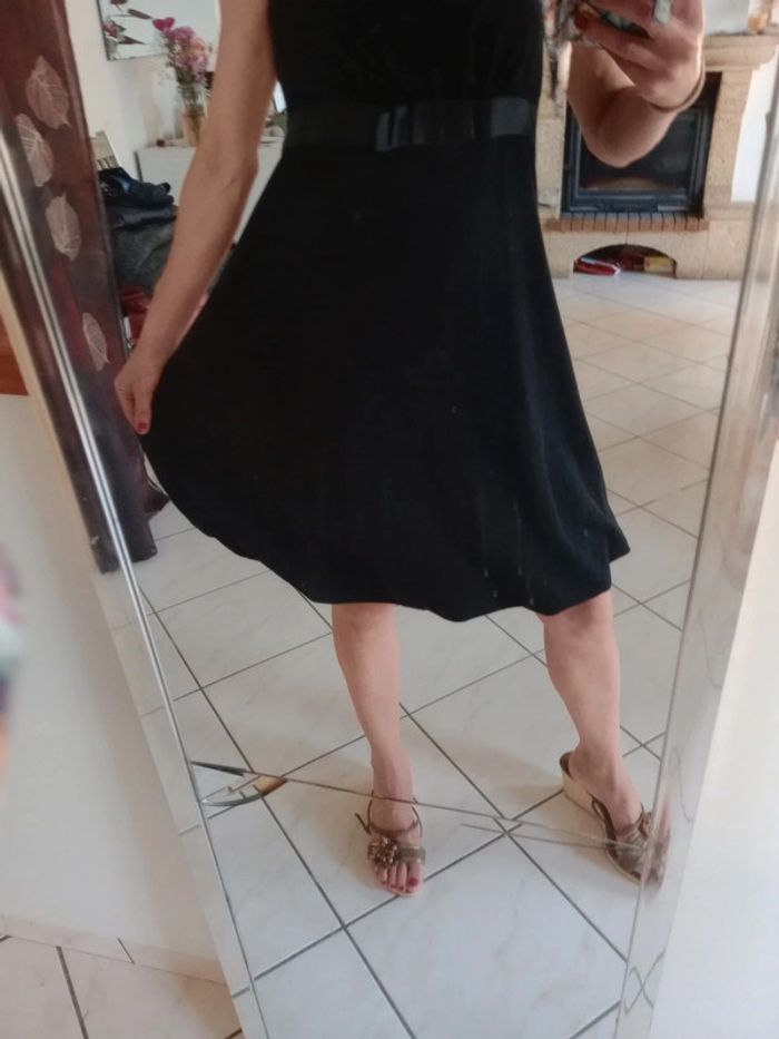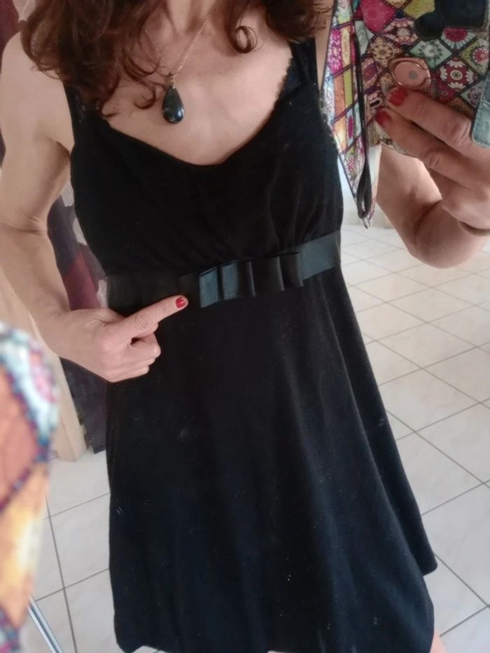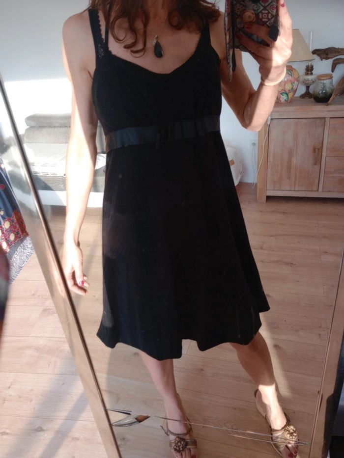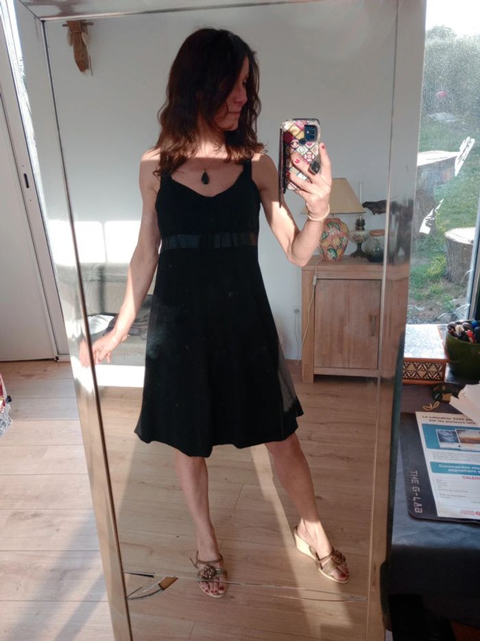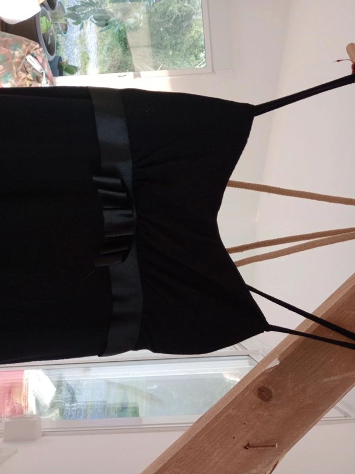 Intemporelle et indémodable, l'indispensable du dressing.... La petite robe noire 🥰 Fines bretelles Doublée, forme boule dans le bas Présence d'un ruban qui passe sous les aisselles et finit en noeud en dessous de la poitrine Aisselle 50 cm Longueur 80 cm du bas de la bretelle au bas de la robe Longueur du haut de la bretelle au bas de la robe 98 cm Présence d'un petit coussinet au niveau de la poitrine #carineleray_femme_40