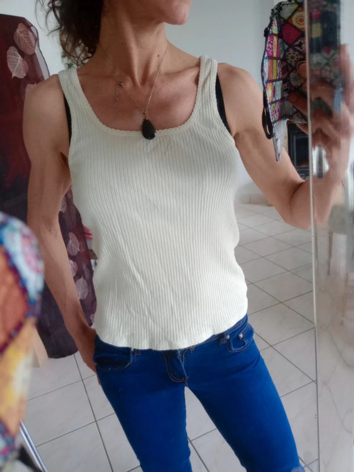 Simple et efficace, ce débardeur a une jolie couleur jaune tendre 🥰 Côtelé Le col est carré arrondi dans les angles Largeur des bretelles 3 cm Bretelles à bretelles 32cm longueur 56 cm #carineleray_femme_38