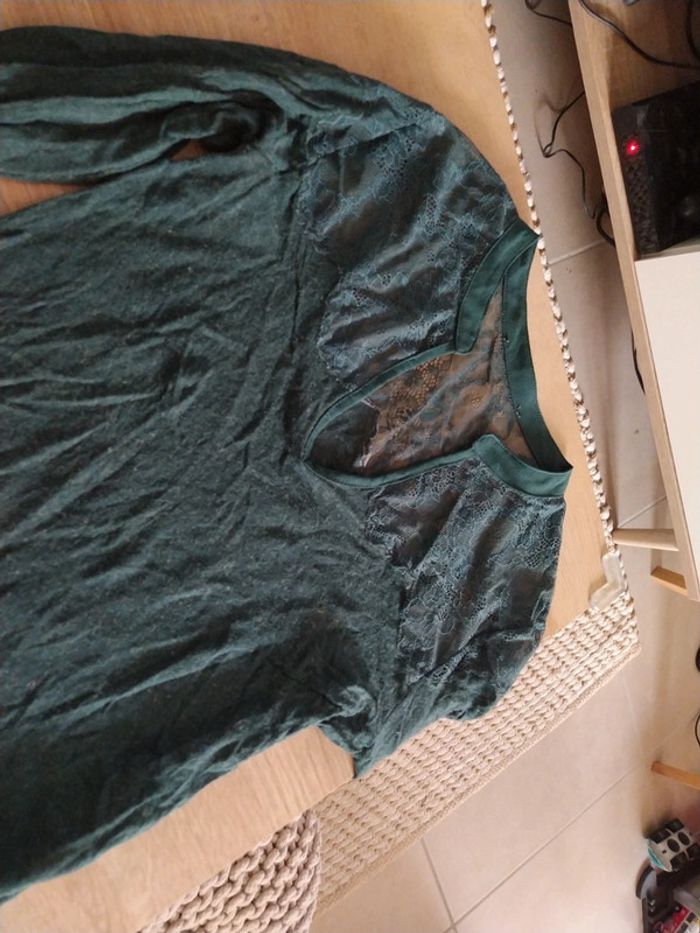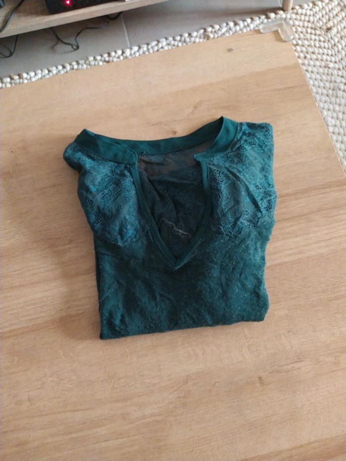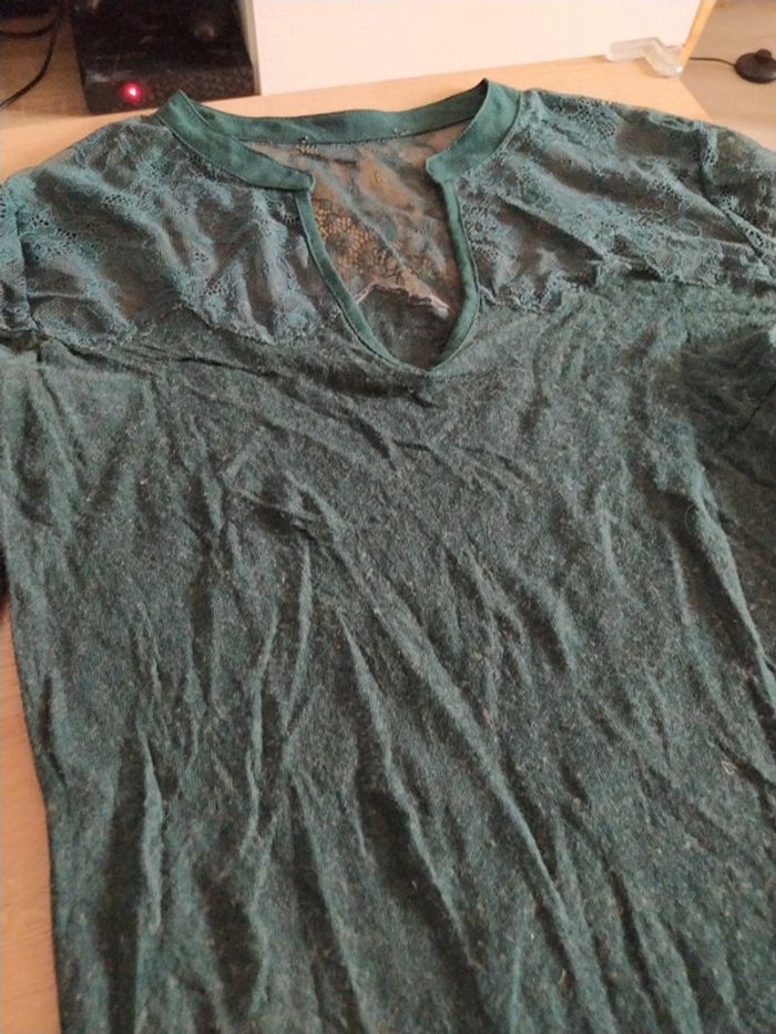 Pull tee shirt manche longue en dentelle Col V Couleur vert sapin Marque Etam Taille 38/40