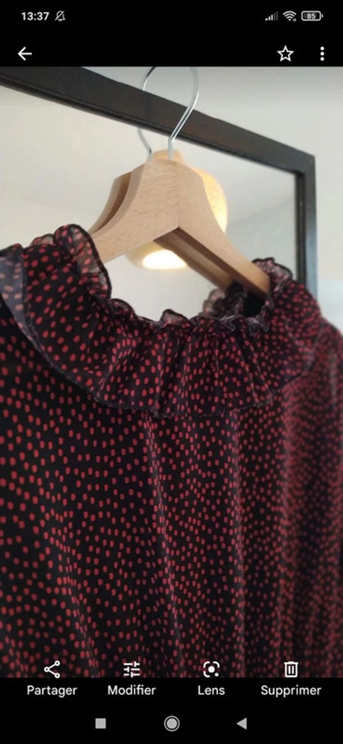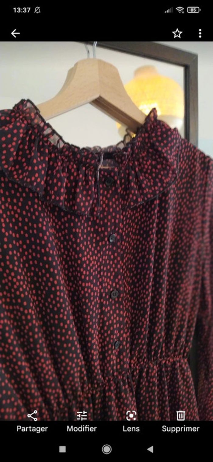 Robe noir avec des pois rouge Taille 38/40 Resserré par un élastique à la taille Col à volant comme sur le bas de la robe Doublée sur devant et avec un jupon