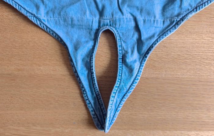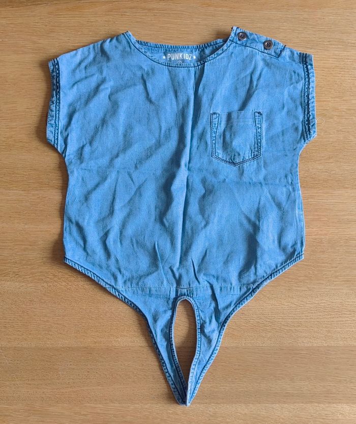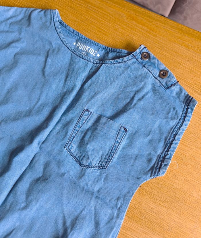 T-shirt en jean de la PUNKIDZ - Bleu - Lien à nouer sur le devant - Manches courtes - Taille : 5 ans ❌ Excellent état comme le montre les photos #kat02600fille5ans #fille5ans #tshirtfille5ans #punkidz