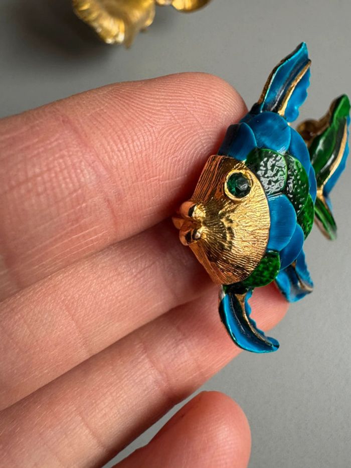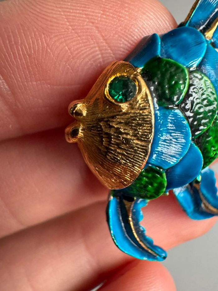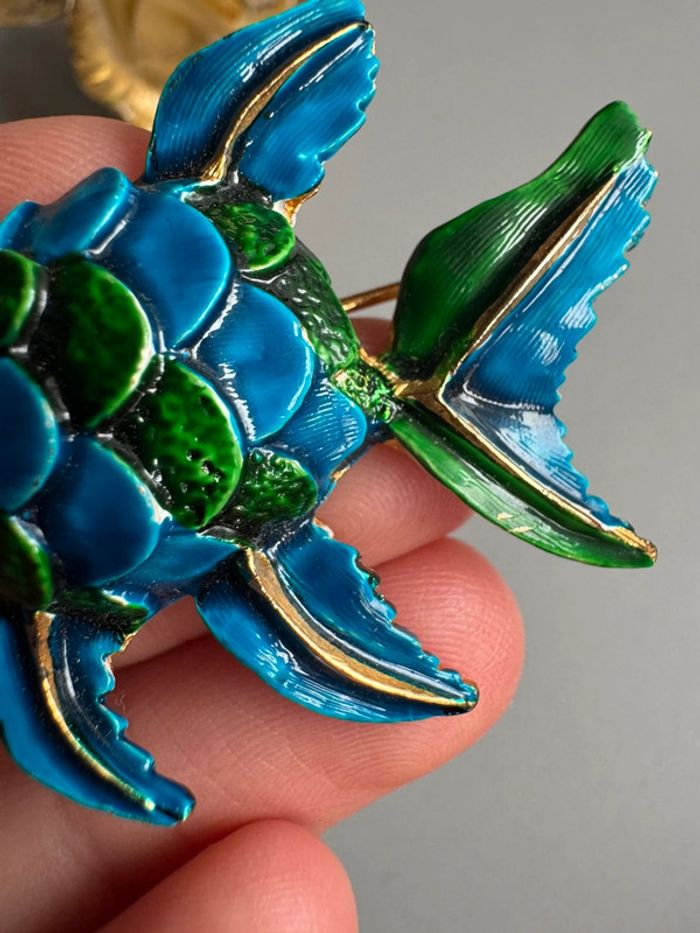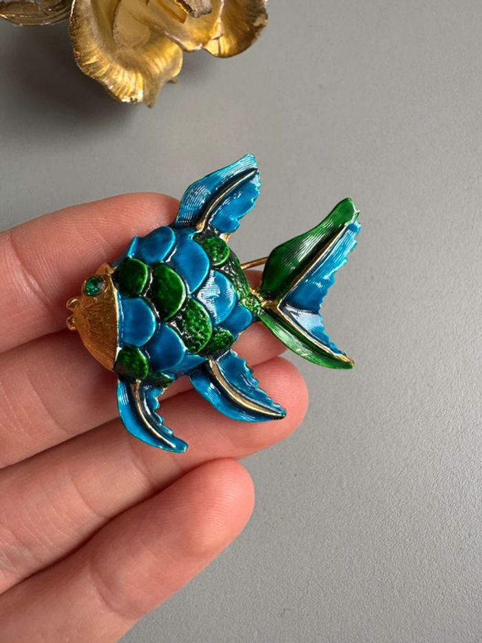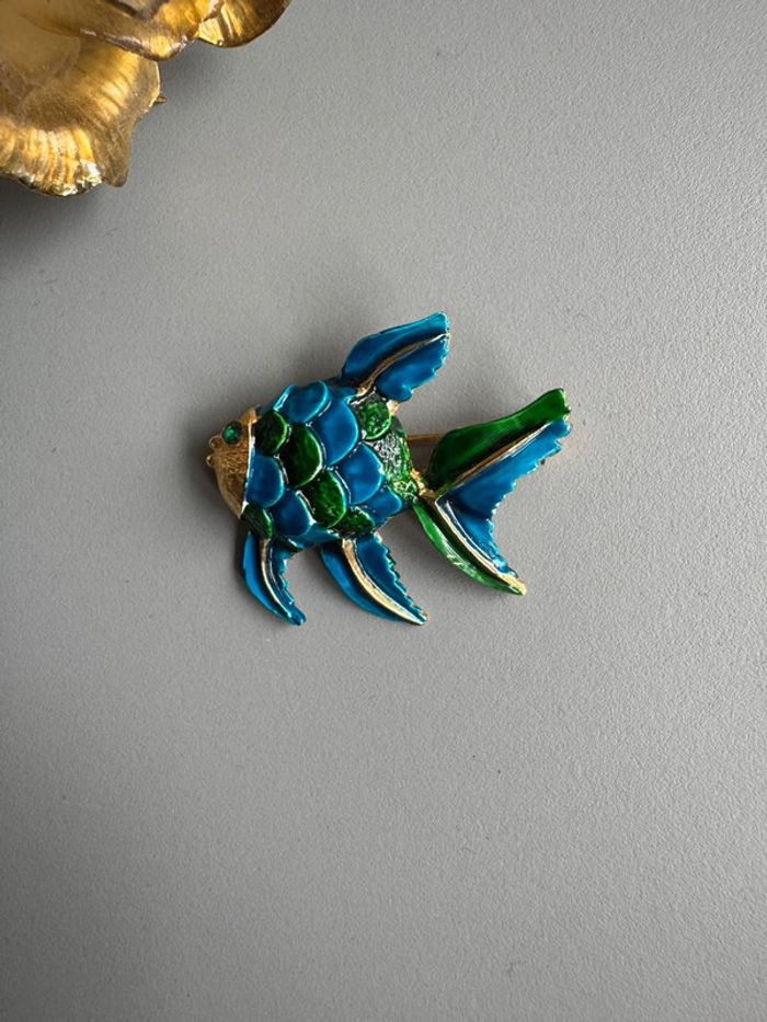 Cette broche vintage en forme de poisson est fabriquée en métal doré avec des détails émaillés en bleu et vert. Son œil est orné d’une pierre verte scintillante. Le dos de la broche révèle une attache à épingle classique, suggérant un design de bijou fantaisie ancien. Son style détaillé et coloré évoque un accessoire rétro, probablement inspiré des bijoux des années 1950-1970.