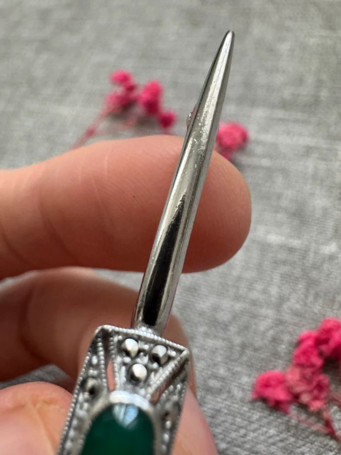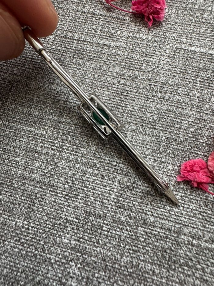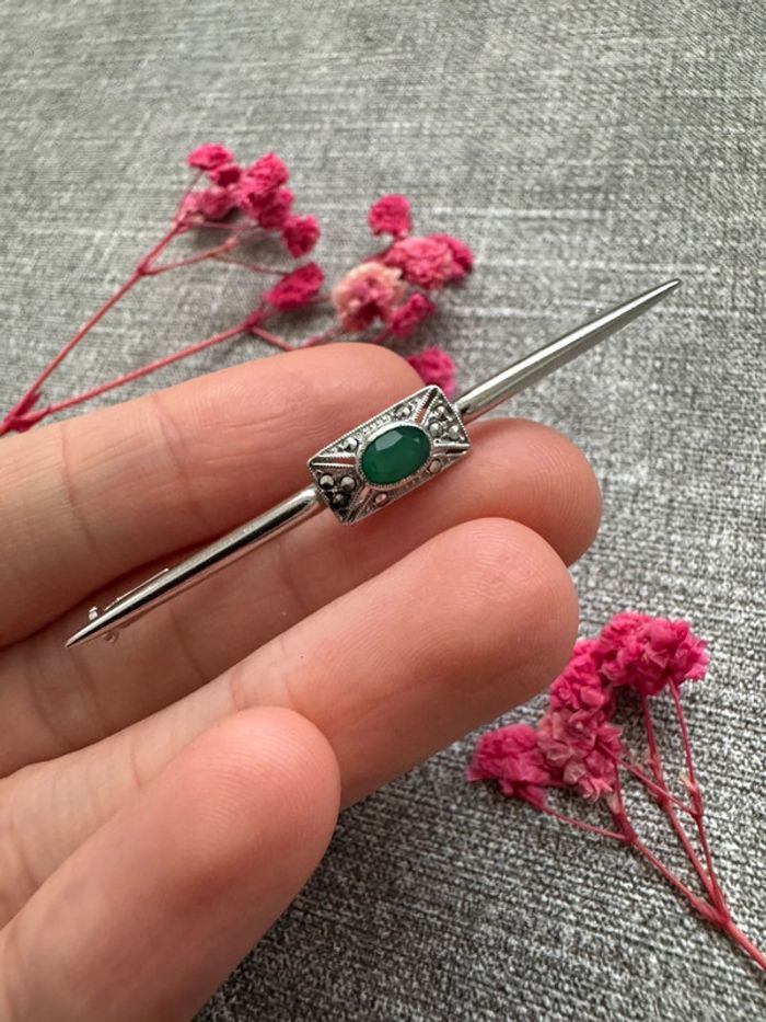 Élégante broche en argent ornée d’une pierre verte centrale et de délicats détails vintage. Un bijou raffiné et intemporel pour sublimer vos tenues avec une touche d’originalité et de charme.