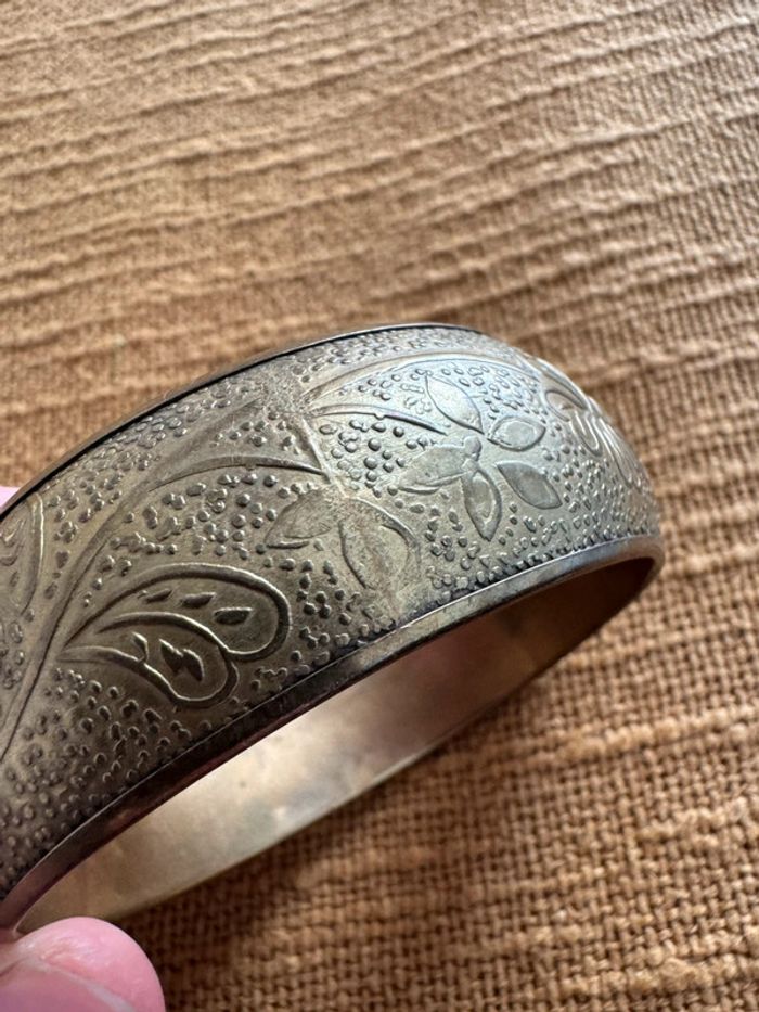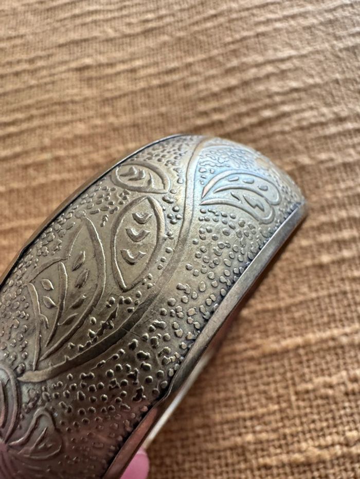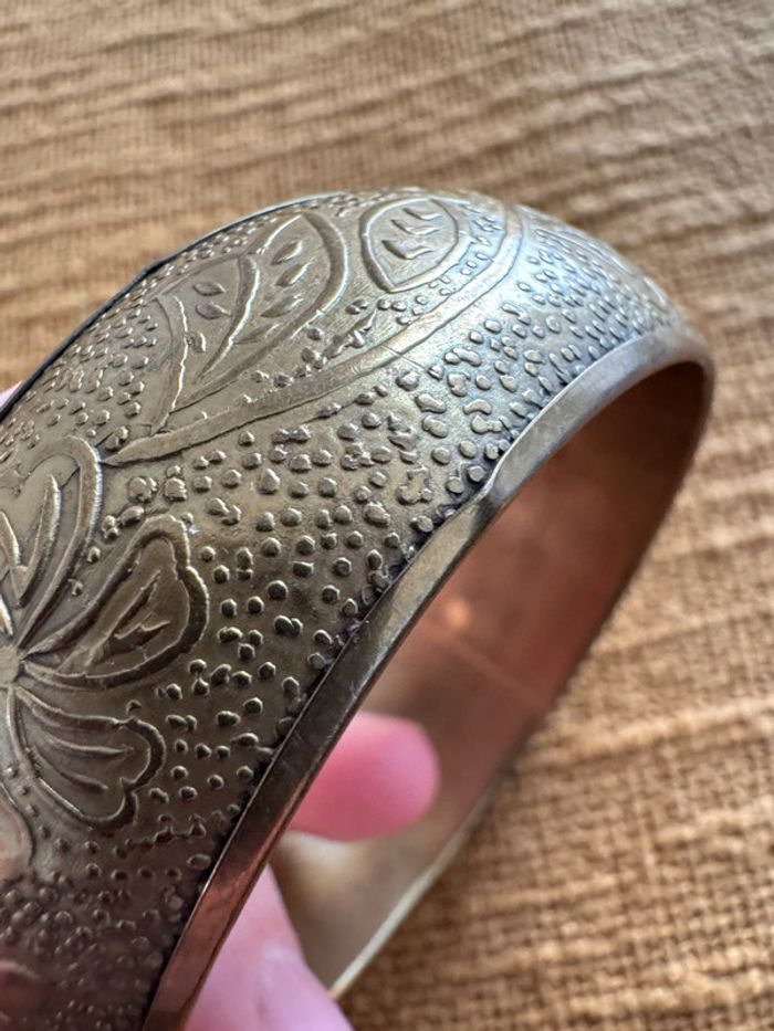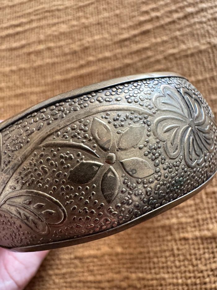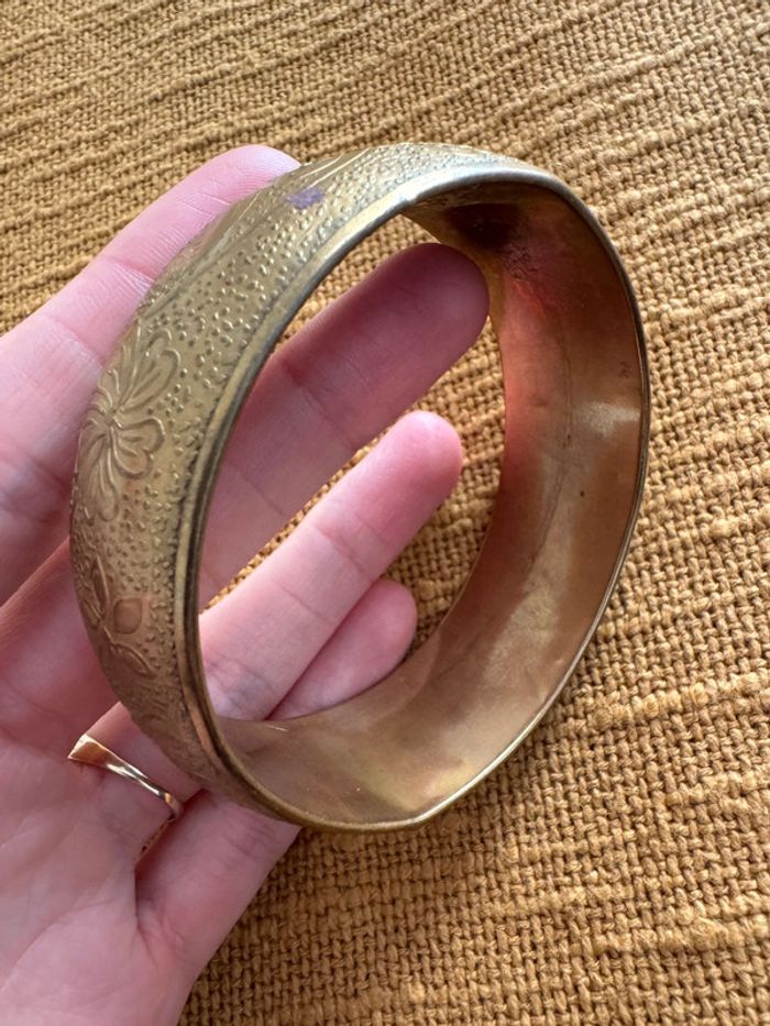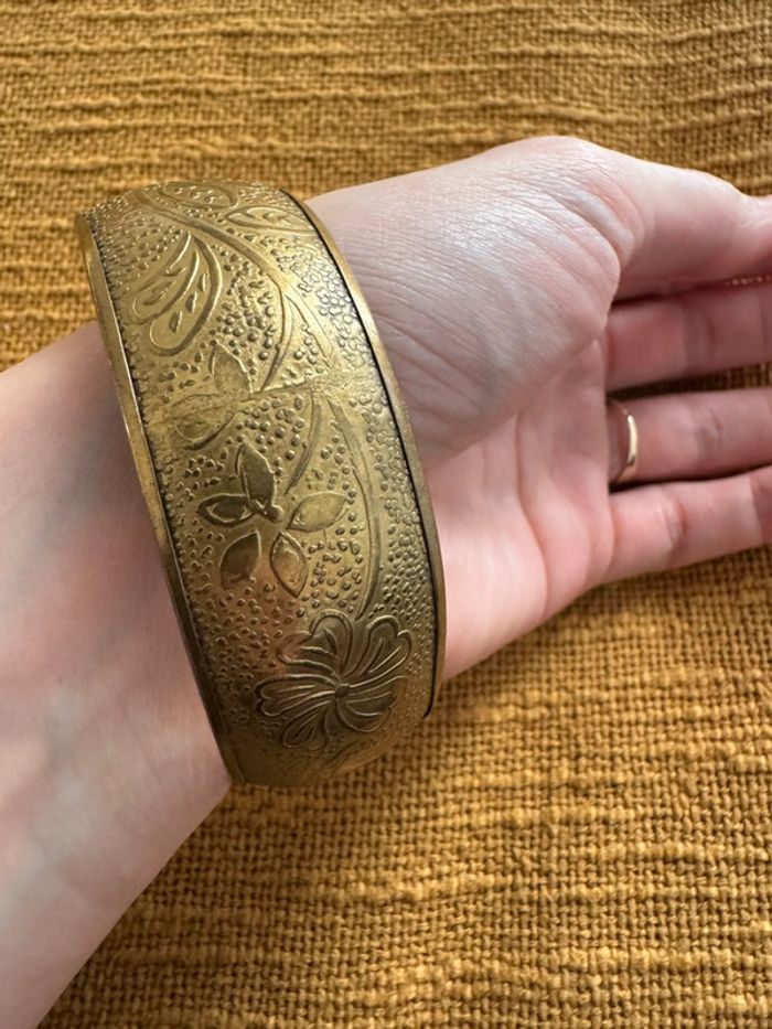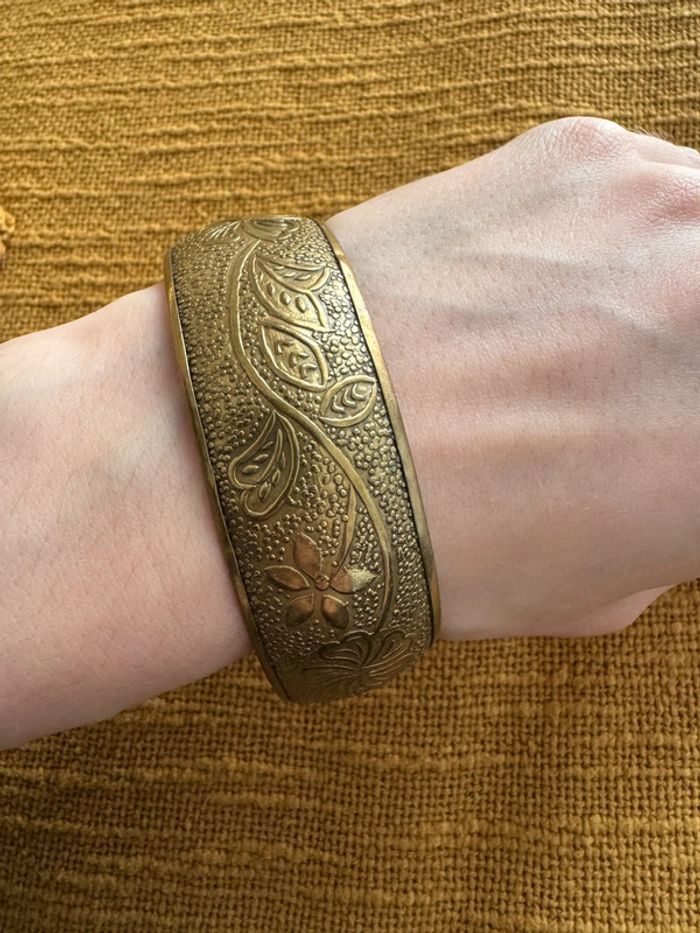 Superbe bracelet en laiton ou bronze, orné de motifs floraux gravés et d’un design vintage élégant. Pièce unique et intemporelle, parfaite pour sublimer n’importe quelle tenue !