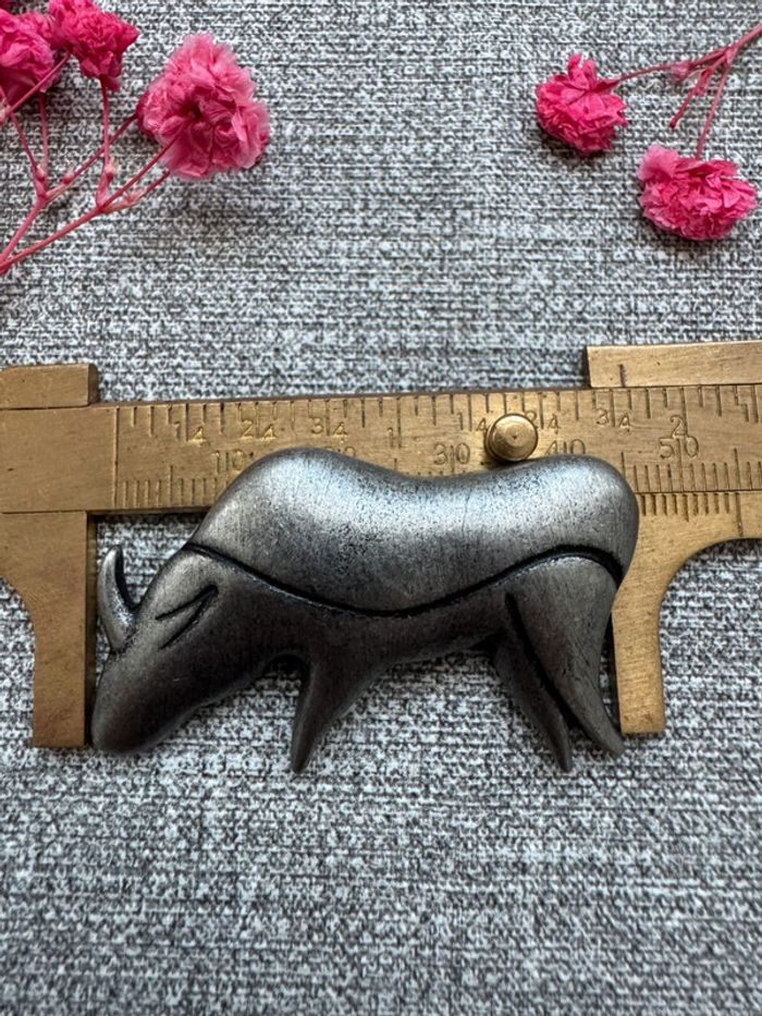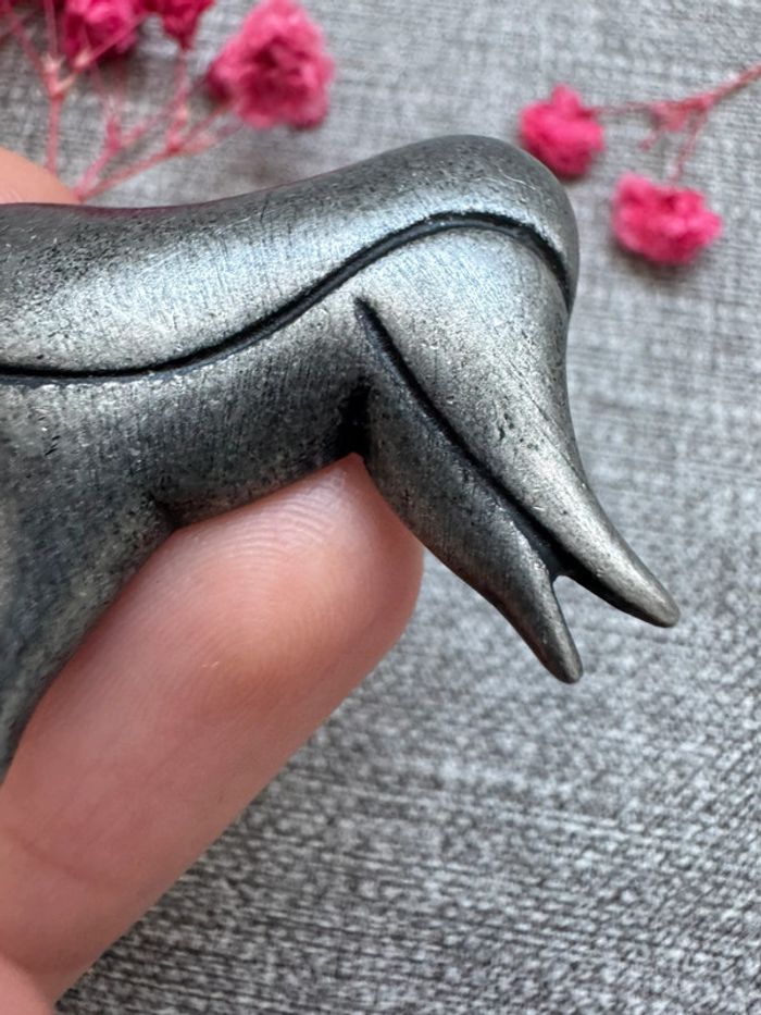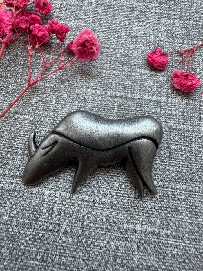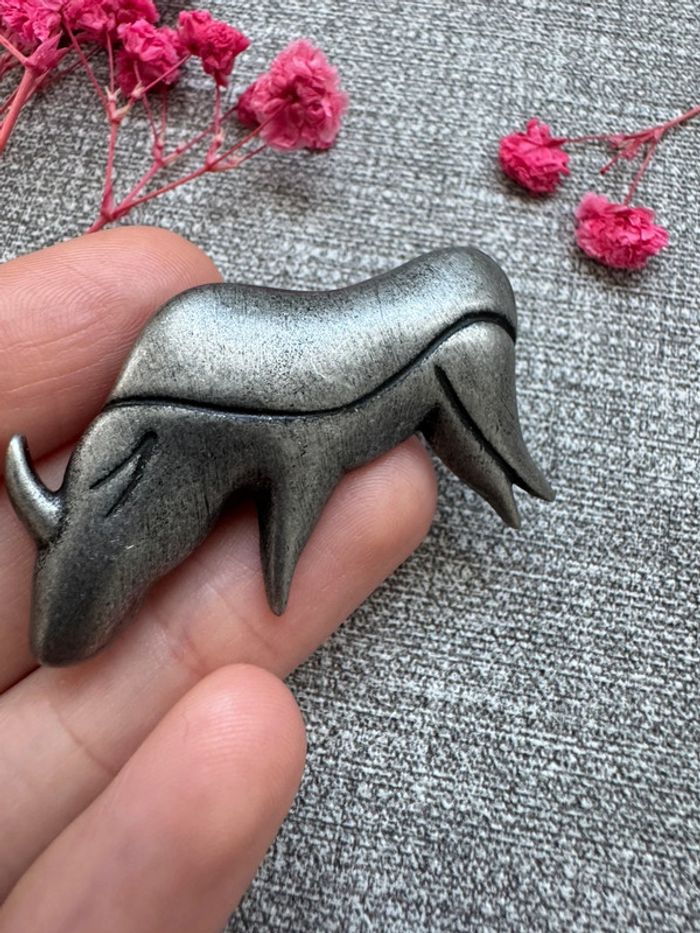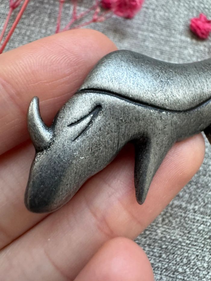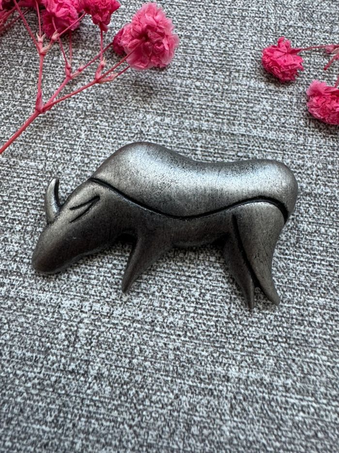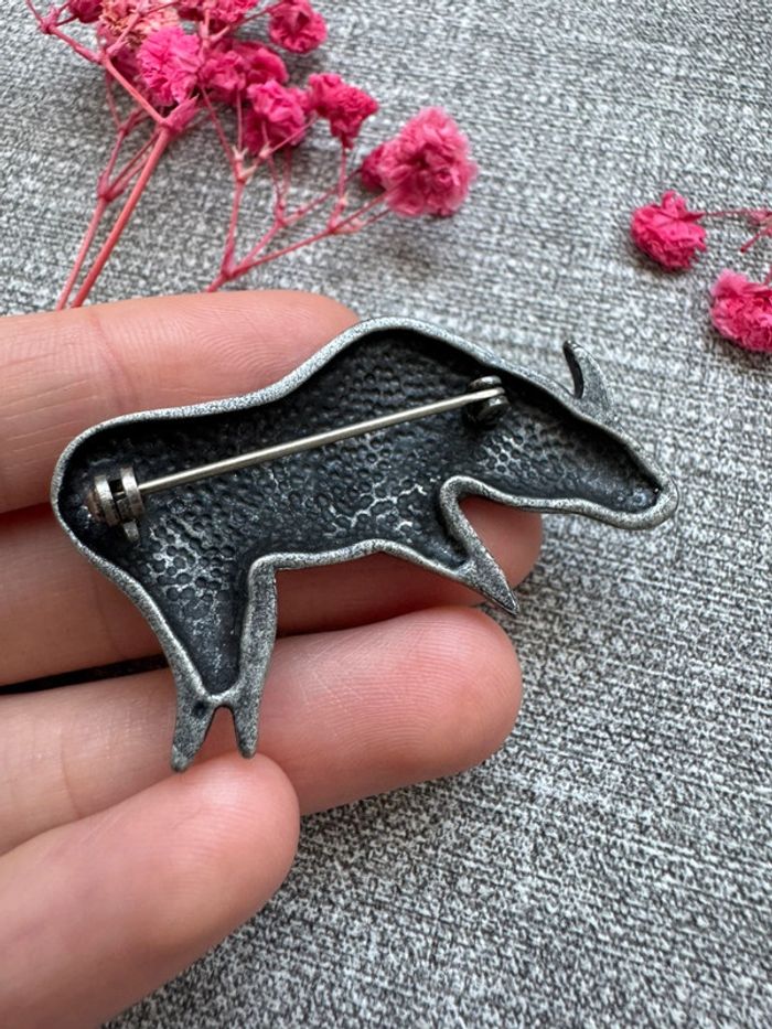 Broche en métal argenté en forme de taureau. Style minimaliste avec des lignes épurées et texturées. État bon avec légères traces d’usure liées au temps. Parfait pour les amateurs de pièces vintage.