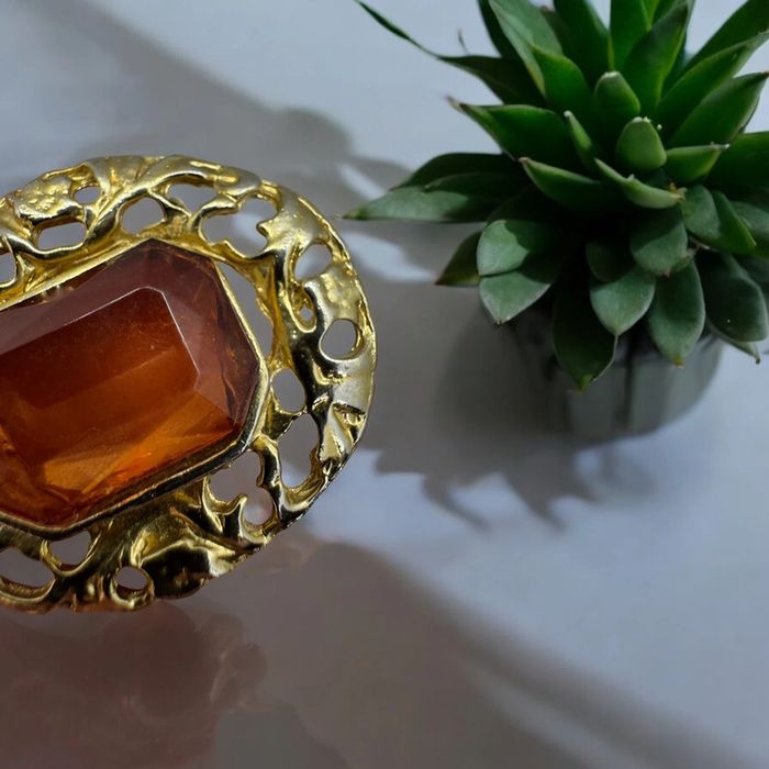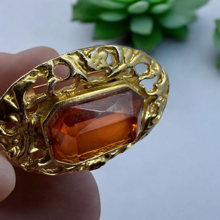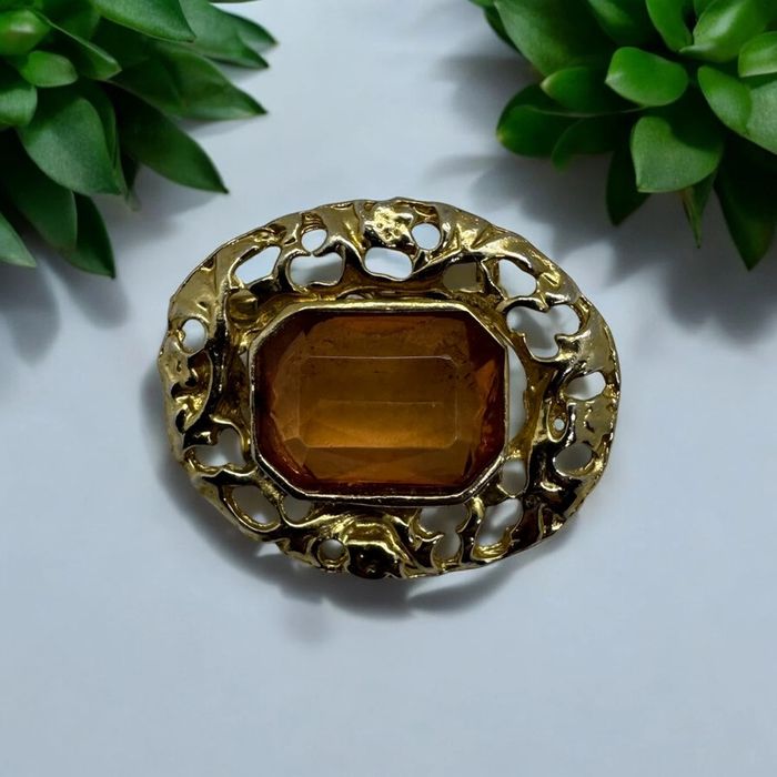 Élégante broche vintage avec une pierre facettée couleur ambre, sublimée par une monture dorée au design raffiné. Un accessoire unique et intemporel qui ajoutera une touche de charme à vos tenues. Offrez-vous cette pièce d’exception dès maintenant !