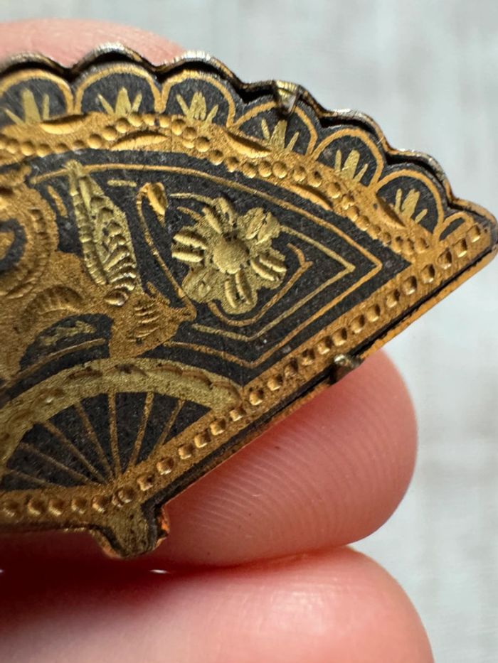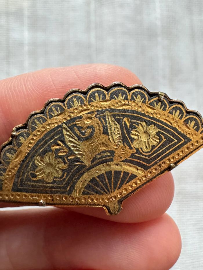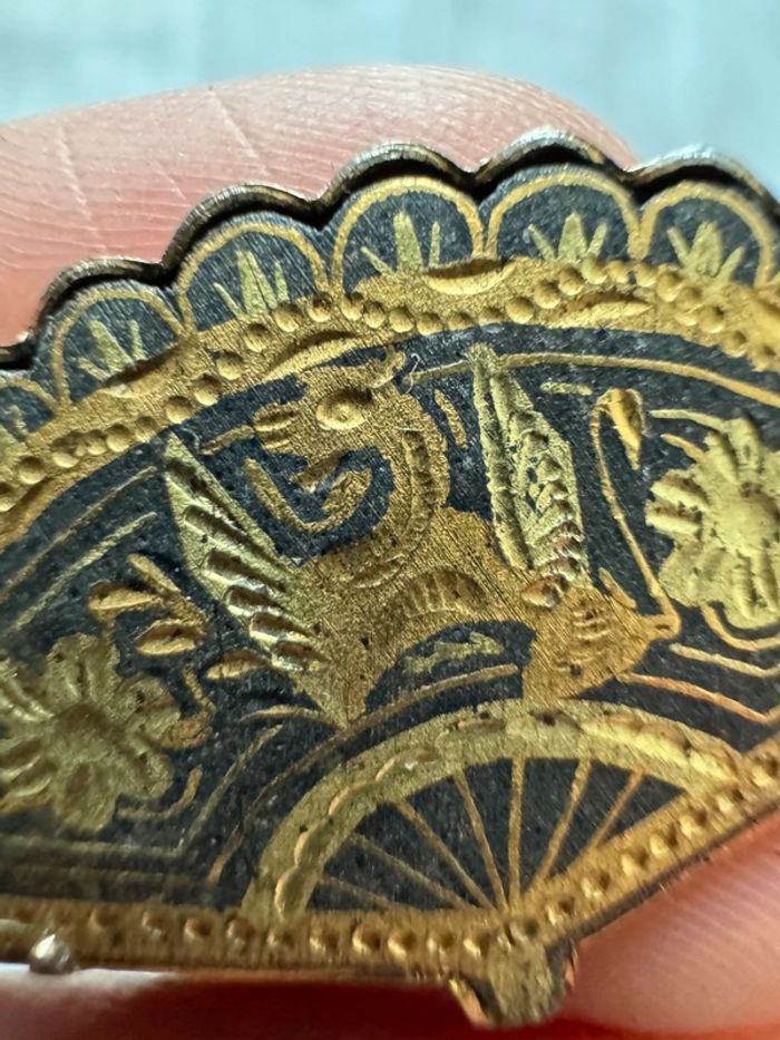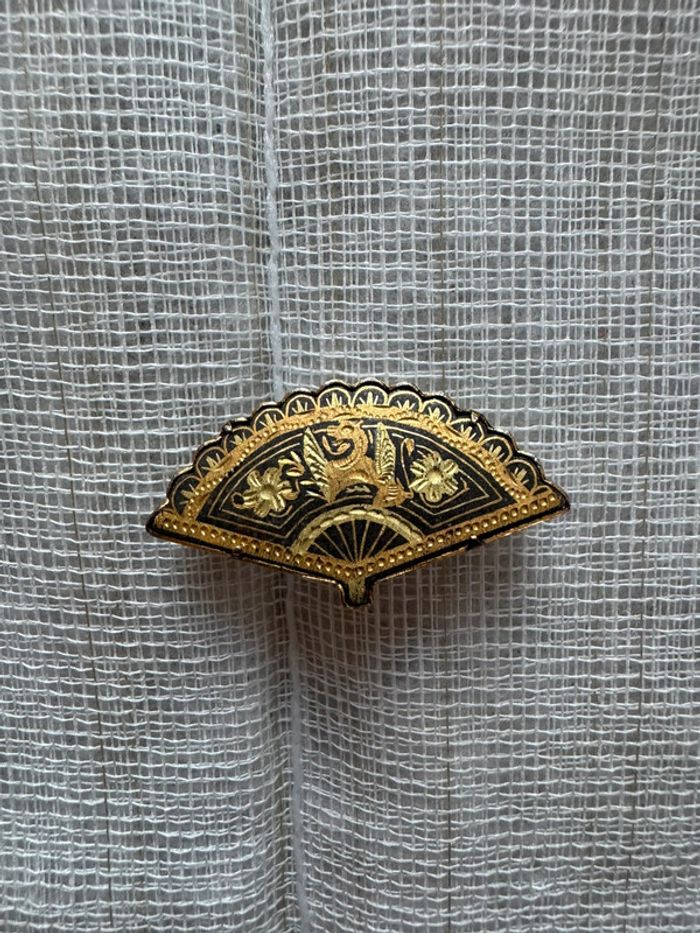 Ajoutez une touche d’élégance intemporelle à votre collection avec cette superbe broche en or de Tolède. En forme d’éventail, elle est ornée de magnifiques motifs floraux et d’une créature mythologique, réalisés avec la technique traditionnelle du damasquinage espagnol. Ce bijou artisanal, symbole du raffinement et du savoir-faire de Tolède, apportera une touche de charme vintage et sophistiqué à n’importe quelle tenue. Unique et riche en histoire, c’est un accessoire qui ne passe pas inaperçu. Ne laissez pas passer cette pièce rare et pleine de caractère !
