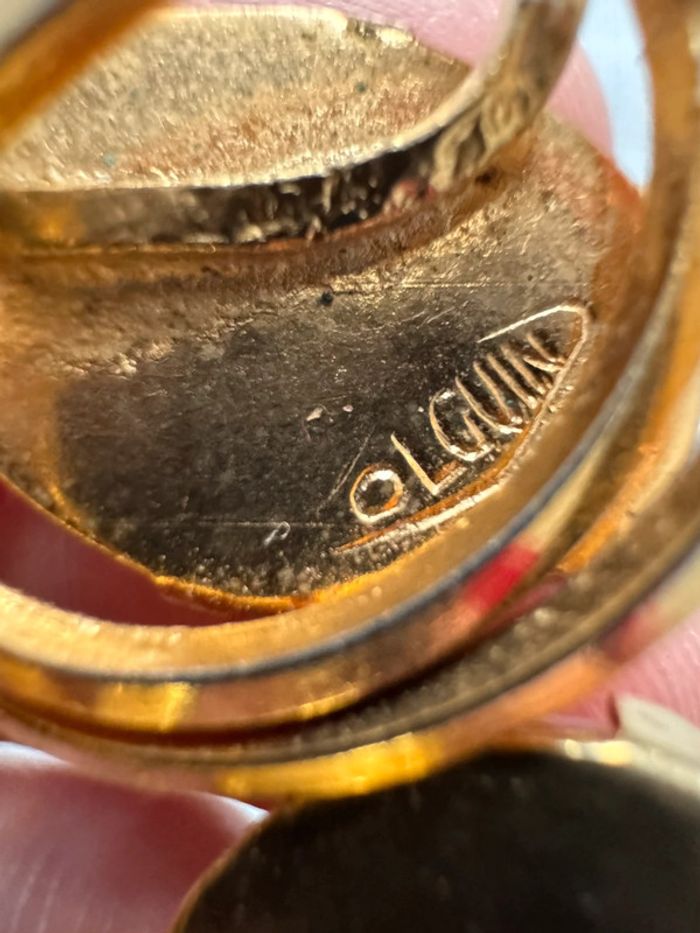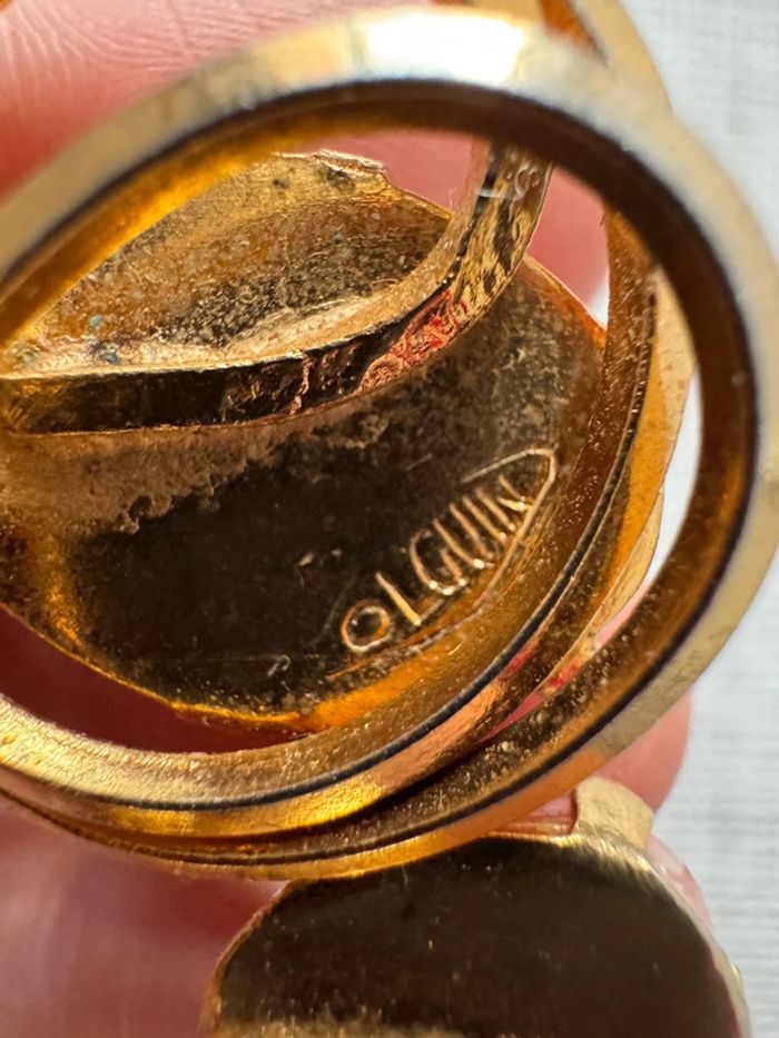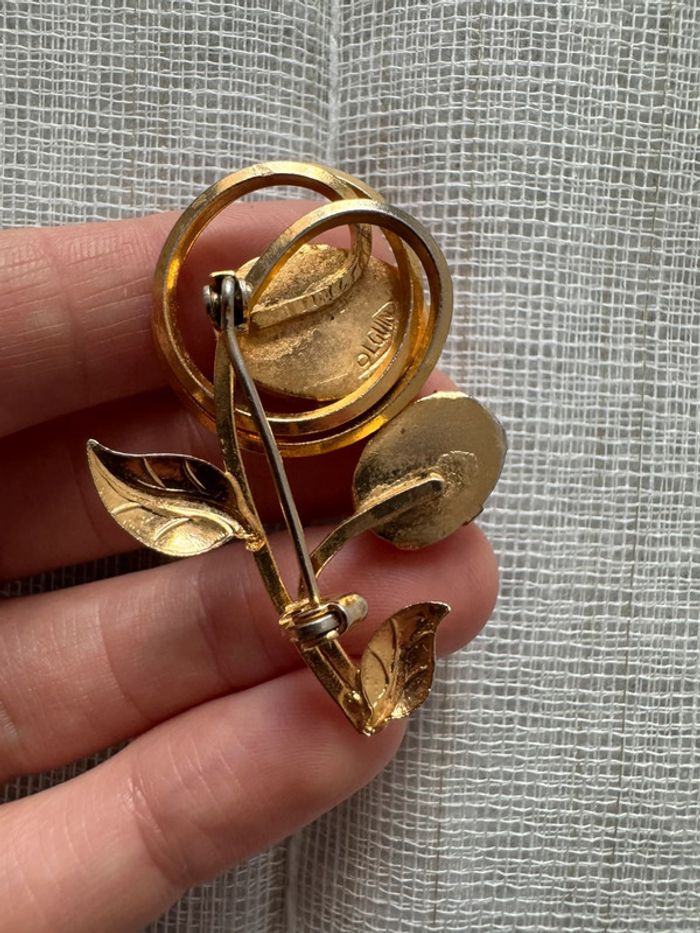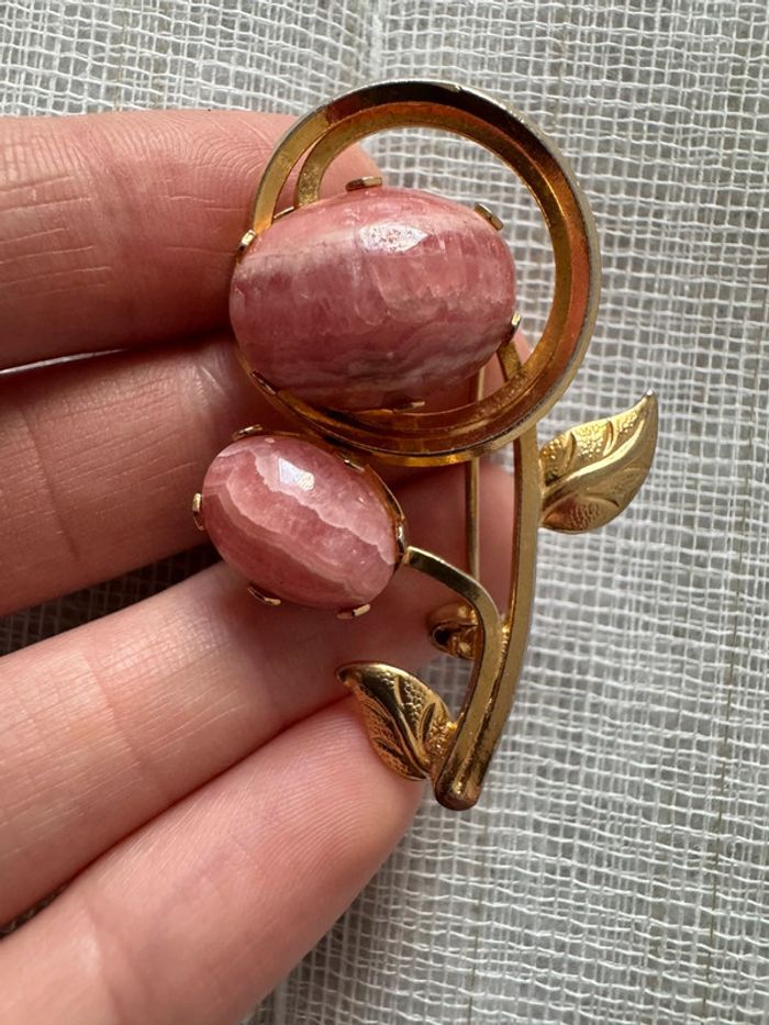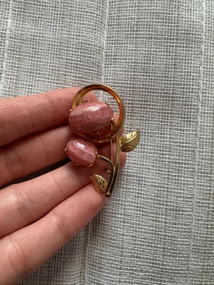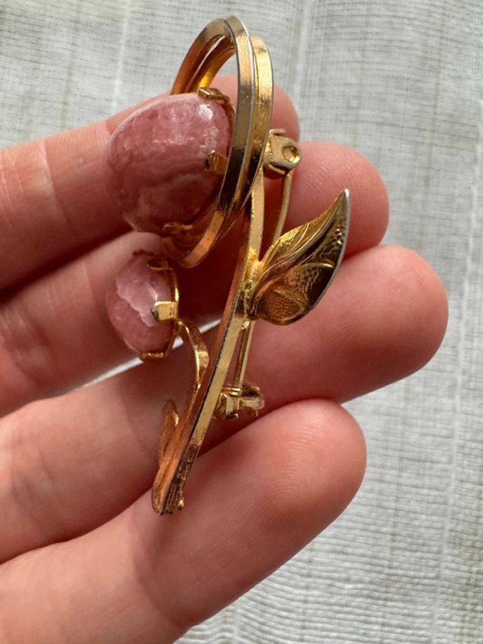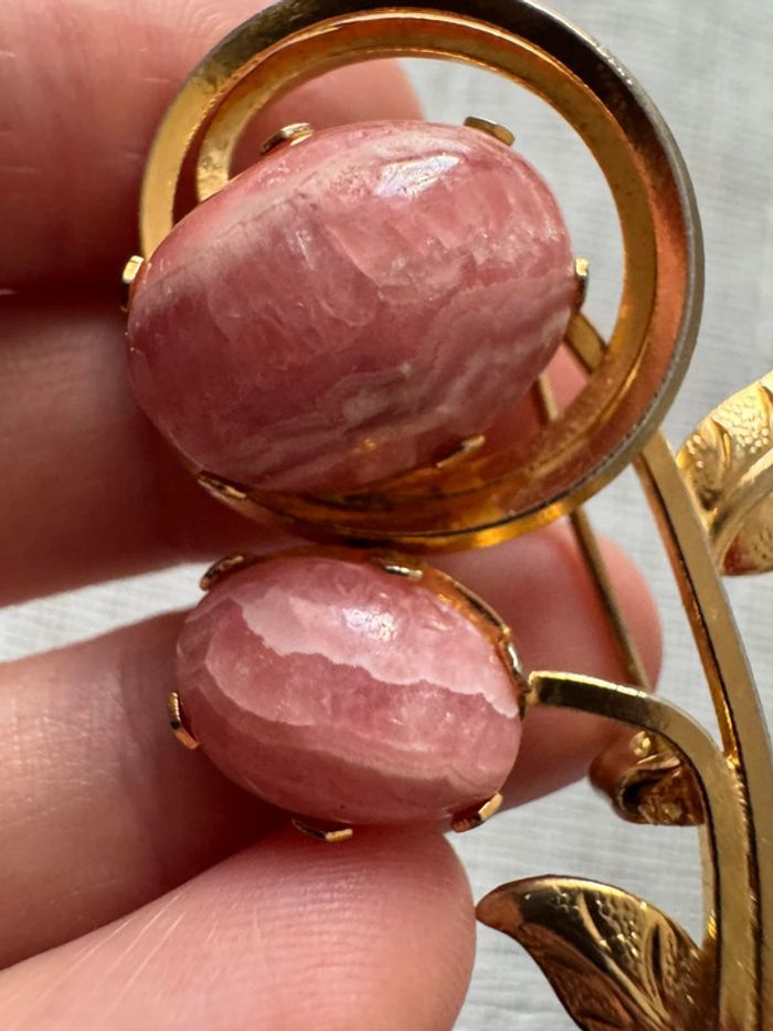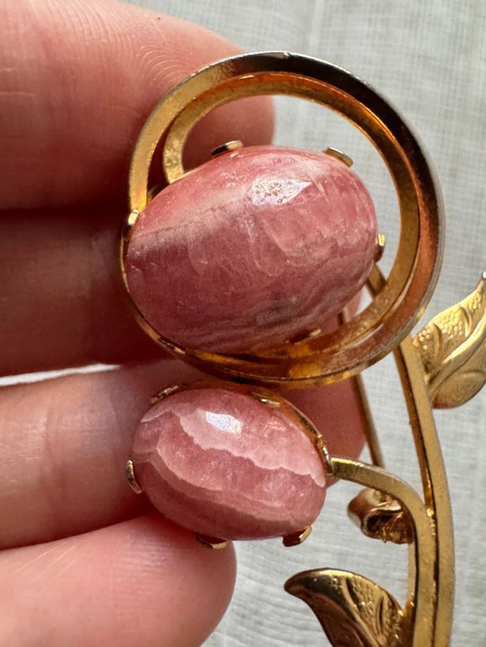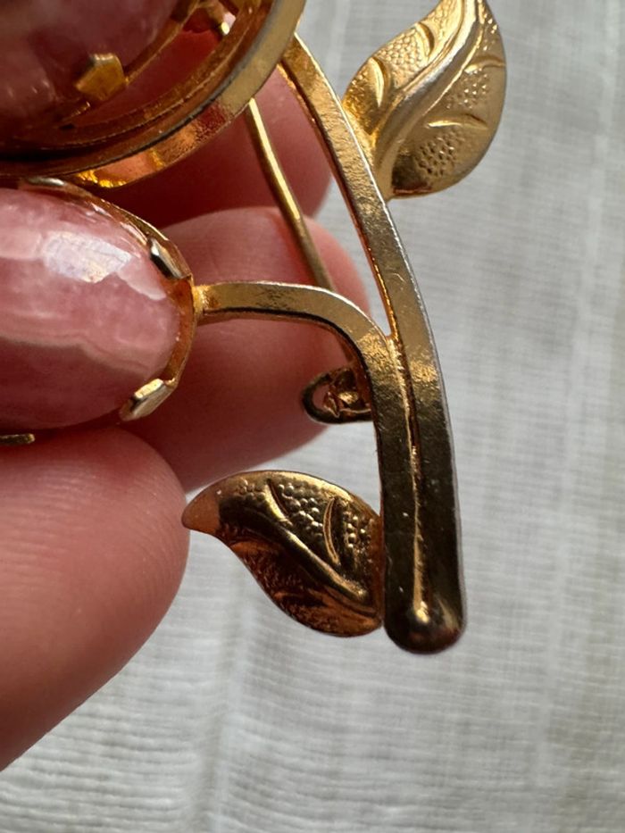 Broche vintage dorée signée Olguin, représentant une fleur stylisée avec deux pierres roses sculptées. Élégant design rétro, parfait pour une touche de raffinement.