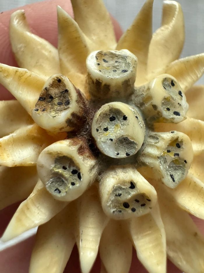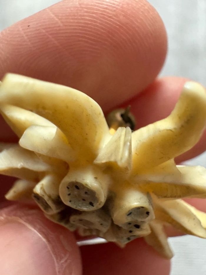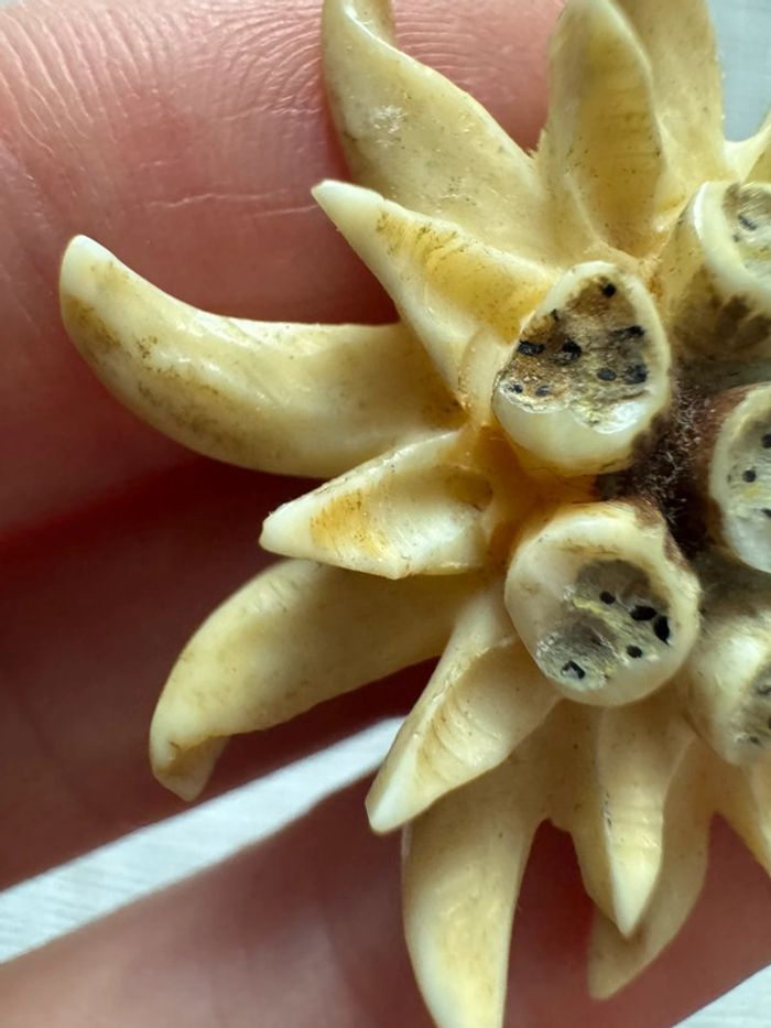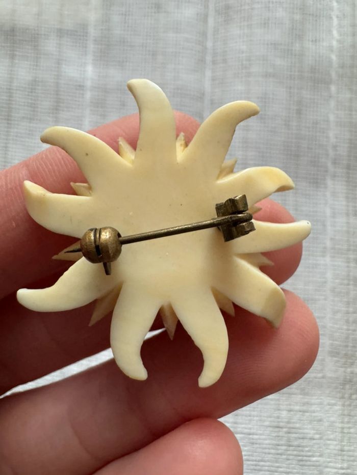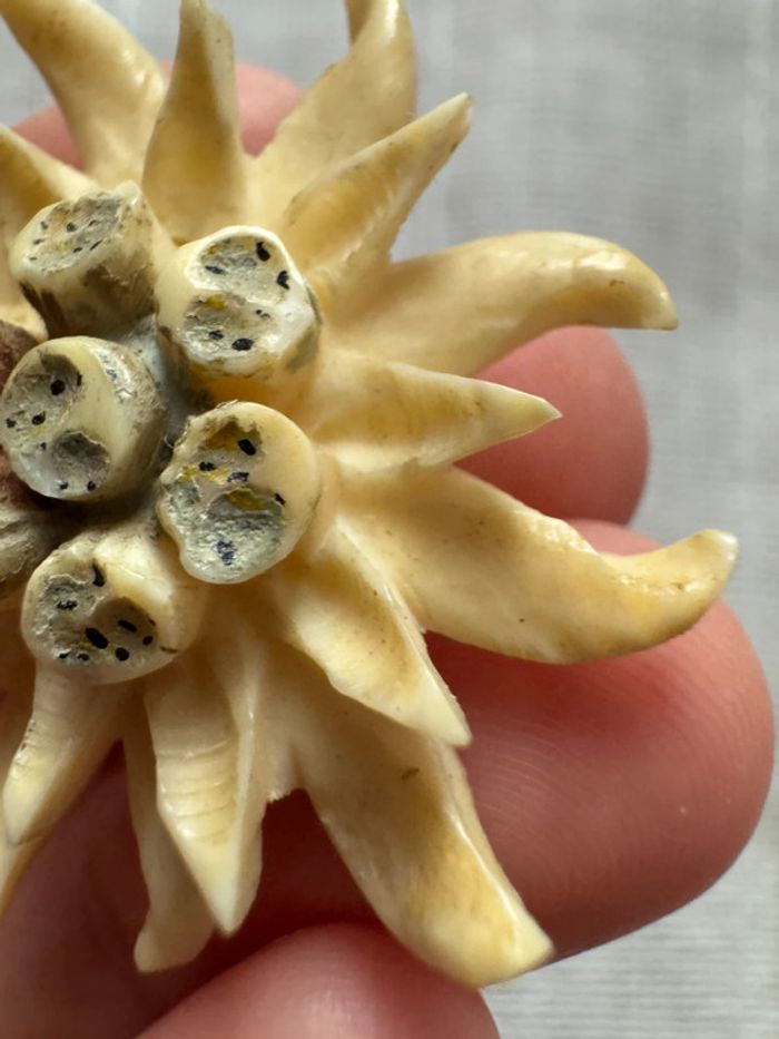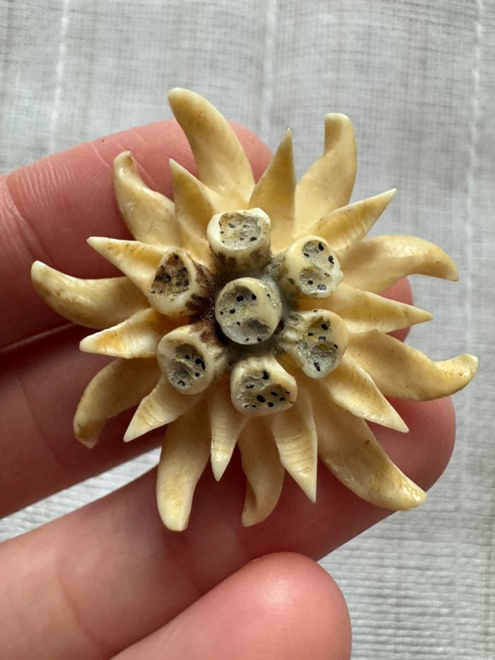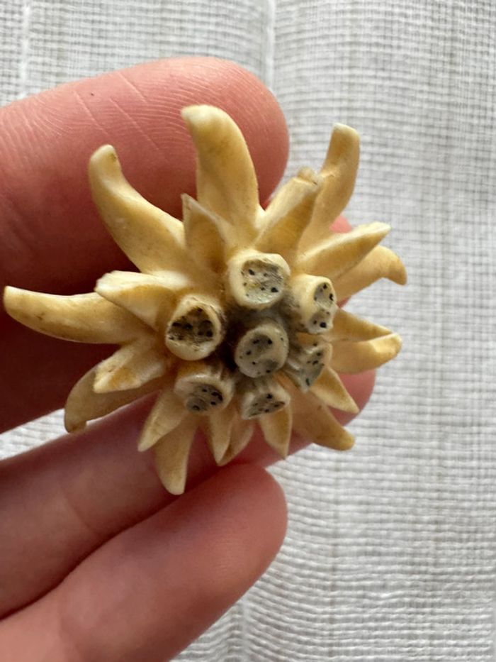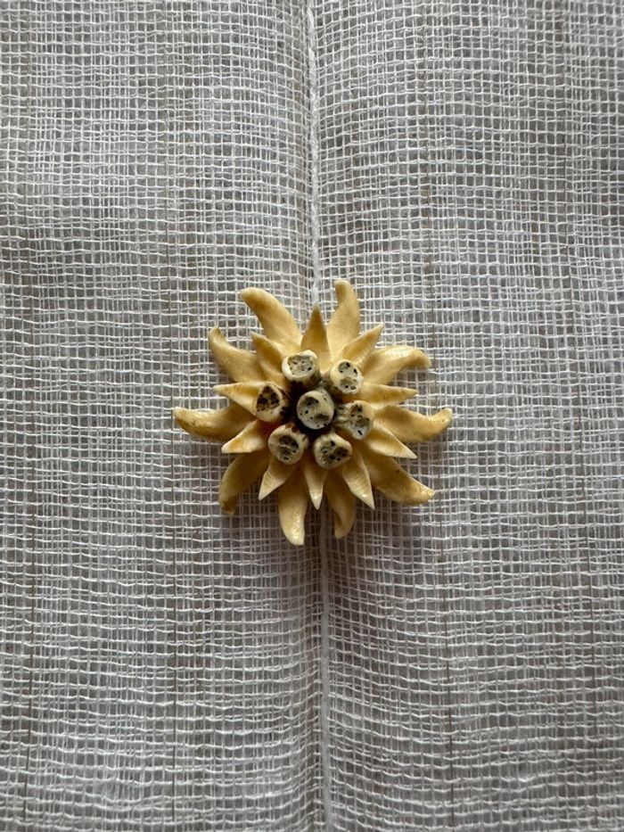 Ancienne broche en forme de fleur d’Edelweiss, sculptée à la main dans de l’os ou de la corne de teinte blanc crème. Cet artisanat alpin traditionnel, réalisé par les montagnards européens durant l’hiver, représente l’Edelweiss, une fleur rare des sommets réputée pour porter bonheur. La broche est équipée d’une épingle en métal fonctionnelle.