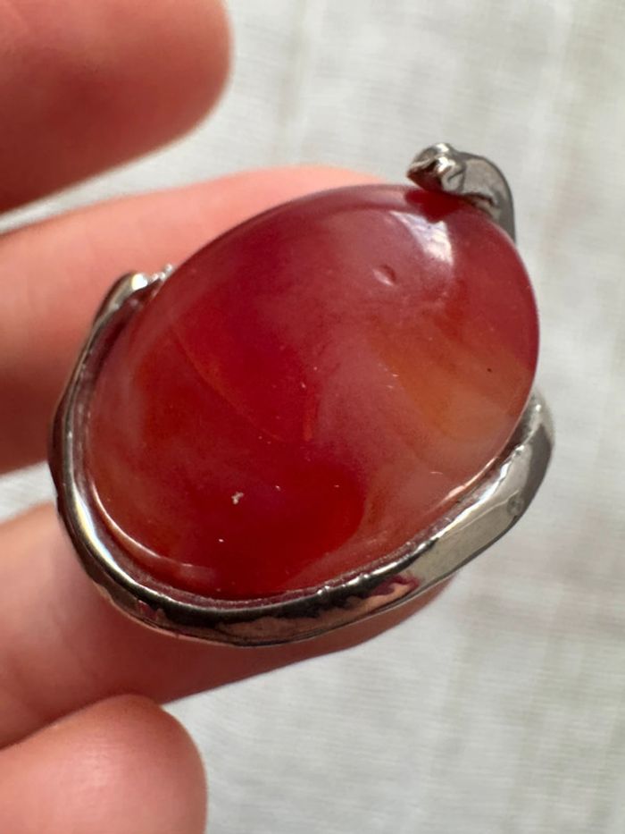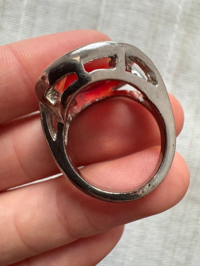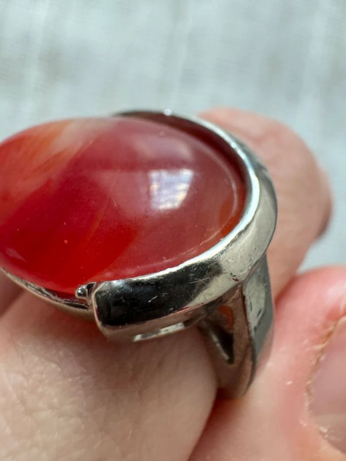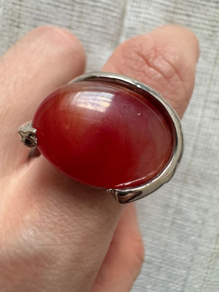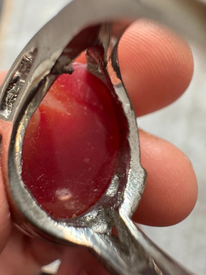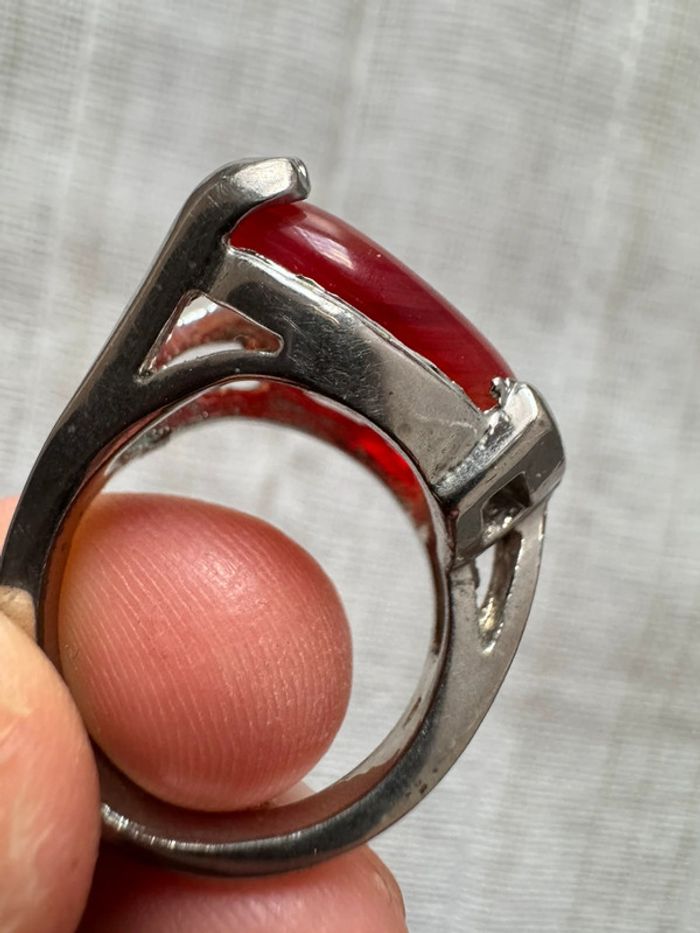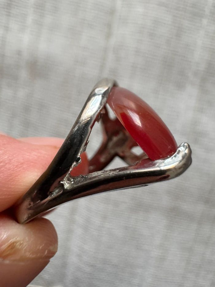 • Matériau : Métal argenté (probablement plaqué ou alliage, à confirmer), avec une belle patine vintage. • Pierre centrale : Cabochon rouge en forme ovale, à l’apparence naturelle mais probablement une pierre synthétique (vérification nécessaire). • Gravure/poinçon : Un poinçon semble être présent à l’intérieur de l’anneau (nécessite une analyse pour identifier la provenance ou le métal). • Taille : Environ 17 mesurée sur baguier). • Style : Design solide avec des motifs ajourés à la base, conférant un aspect élégant et rétro. • État : Satisfaisant, avec quelques traces d’usure visibles sur le métal, compatibles avec son âge.