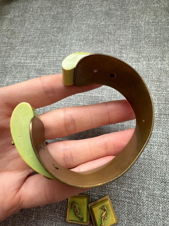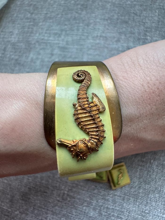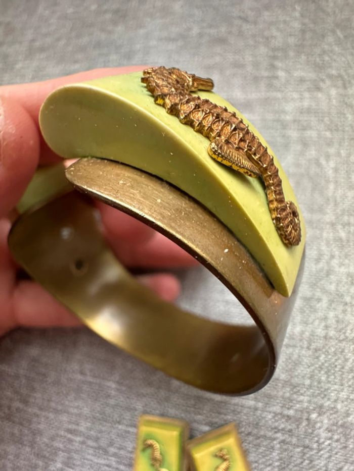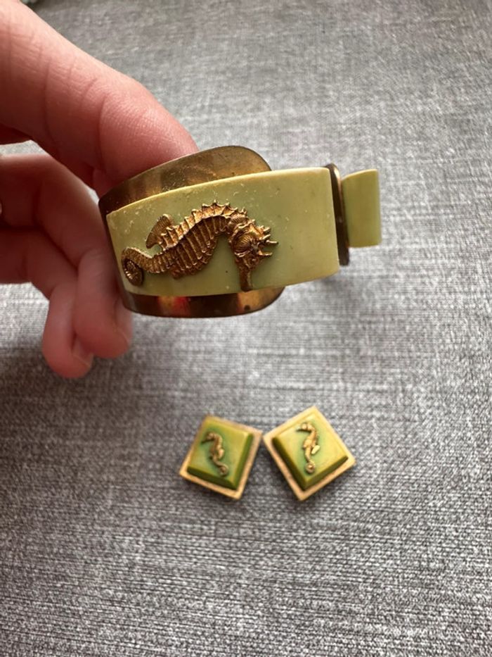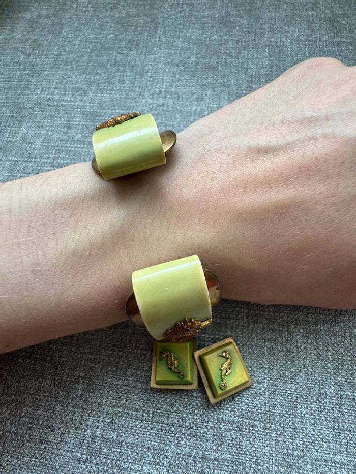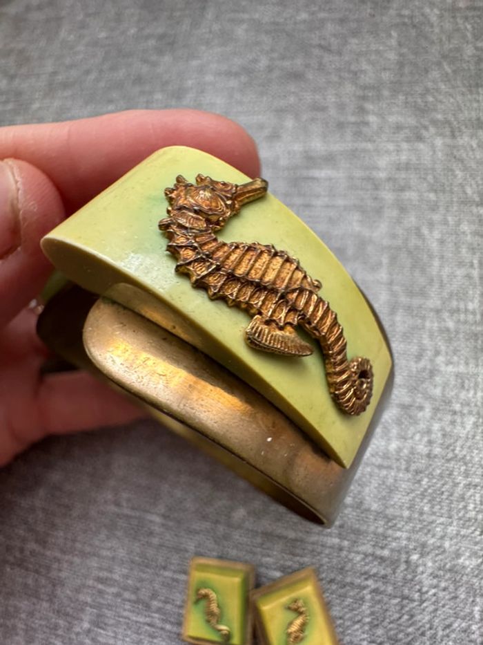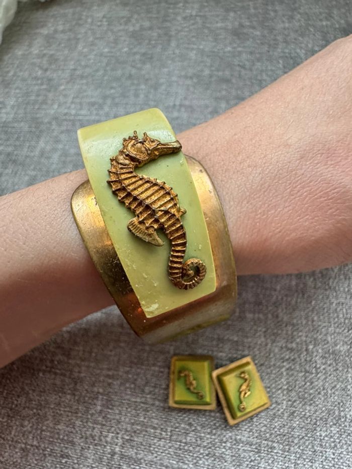 Ensemble vintage composé d’un bracelet rigide en métal doré orné de résine verte et d’hippocampes en relief, accompagné de boucles d’oreilles à clips assorties. Design unique et thématique marin, typique des bijoux fantaisie des années 1940-1960.