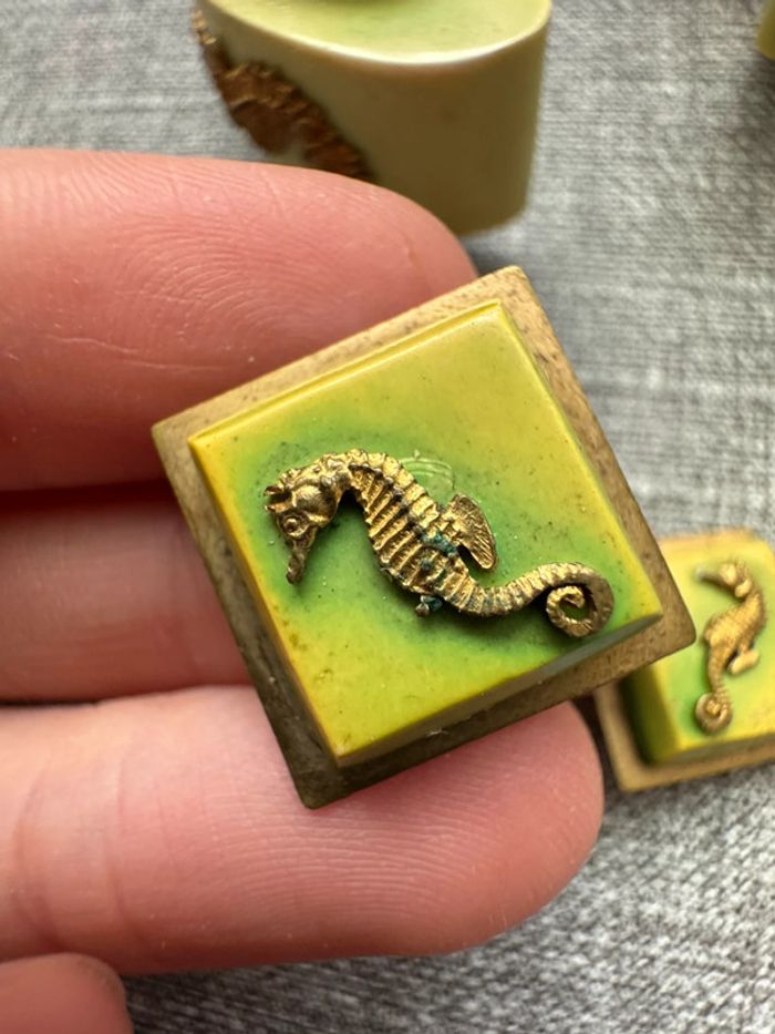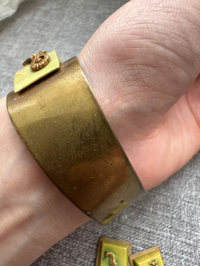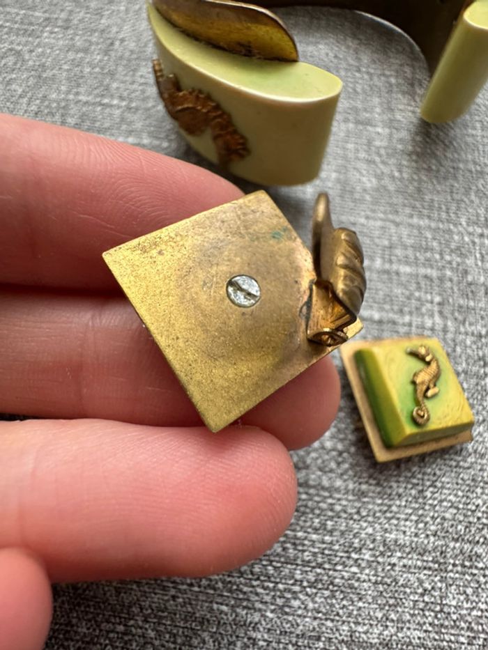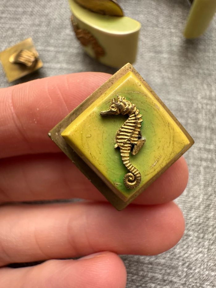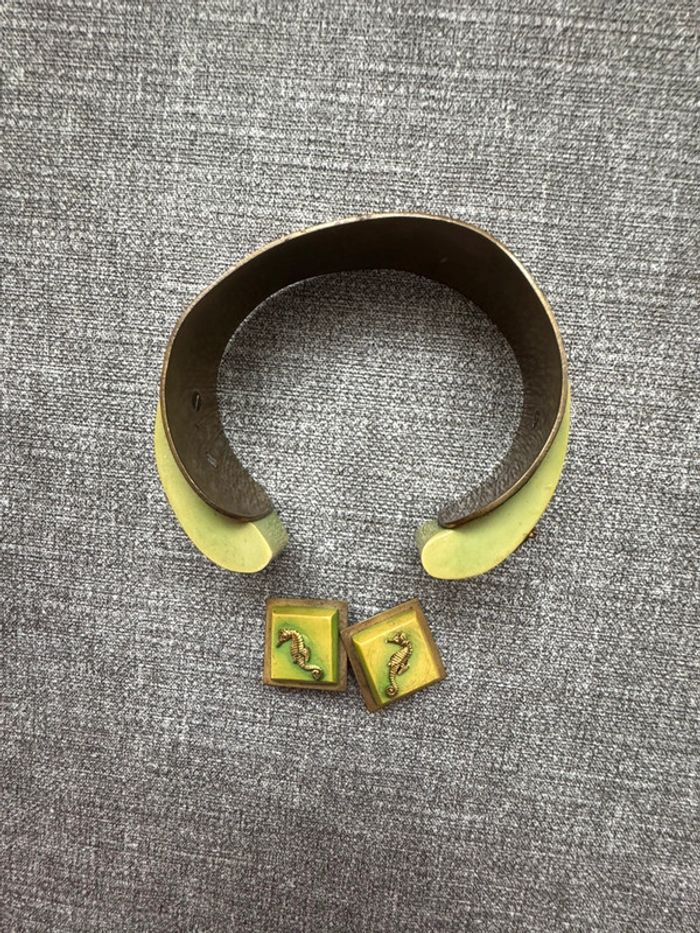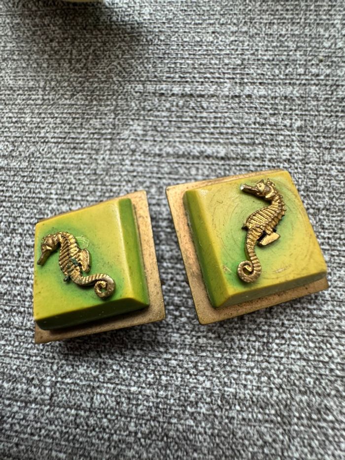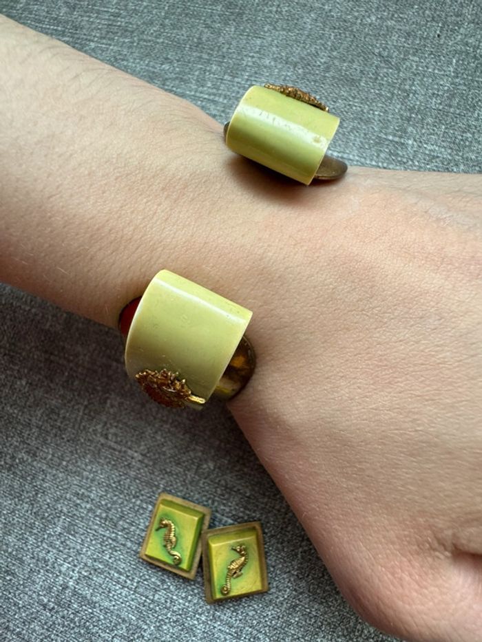 Ensemble vintage composé d’un bracelet rigide en métal doré orné de résine verte et d’hippocampes en relief, accompagné de boucles d’oreilles à clips assorties. Design unique et thématique marin, typique des bijoux fantaisie des années 1940-1960.