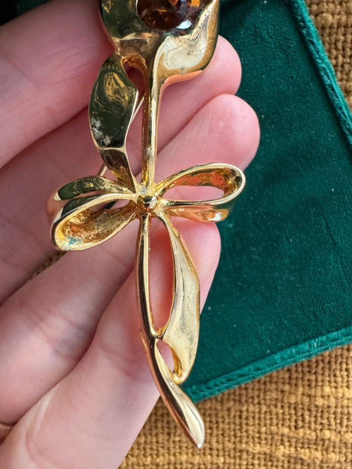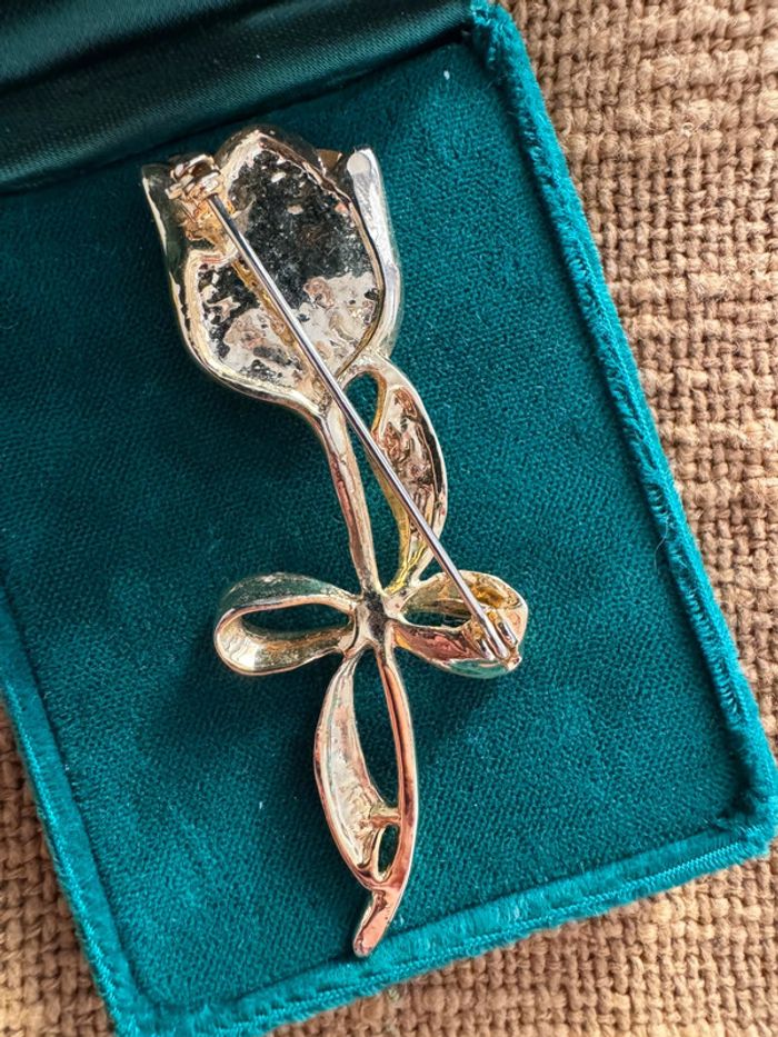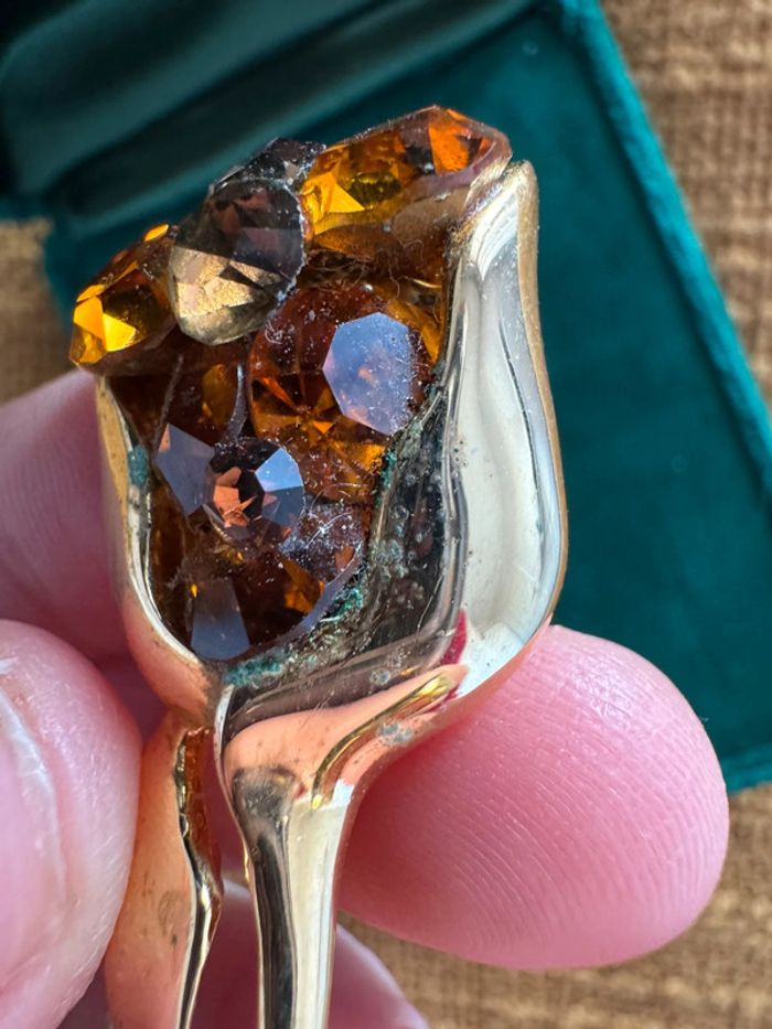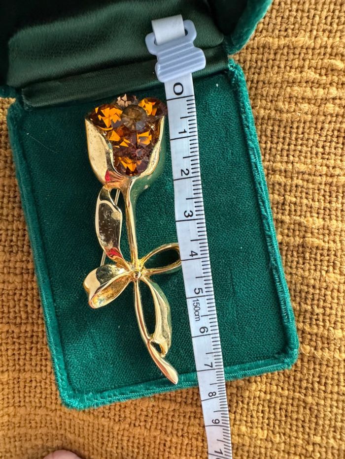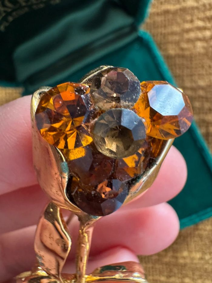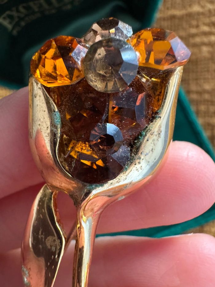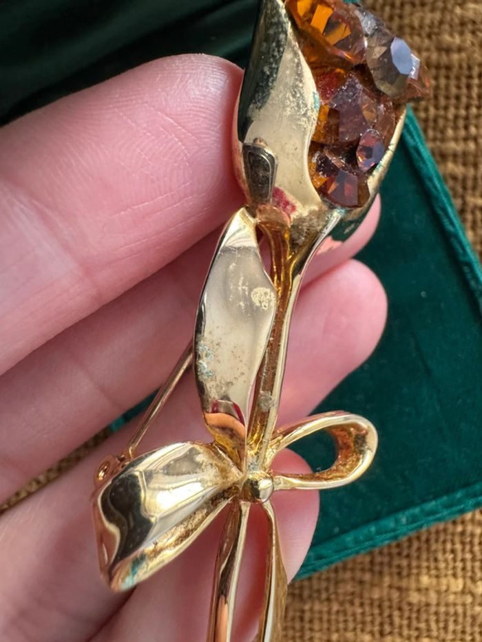 Élégante broche en métal doré en forme de fleur tulipe, décorée de strass scintillants dans les tons ambre et brun. Mesure environ 7 cm. Une belle pièce rétro à porter ou à collectionner. État : quelques traces d’oxydation visibles et marques d’usure (voir photos). Les strass sont tous présents, bien fixés, mais un peu ternis avec le temps.