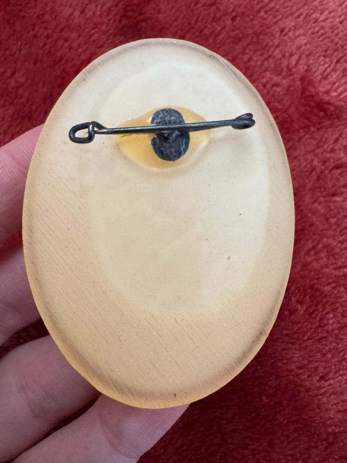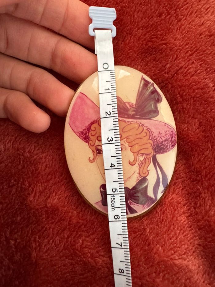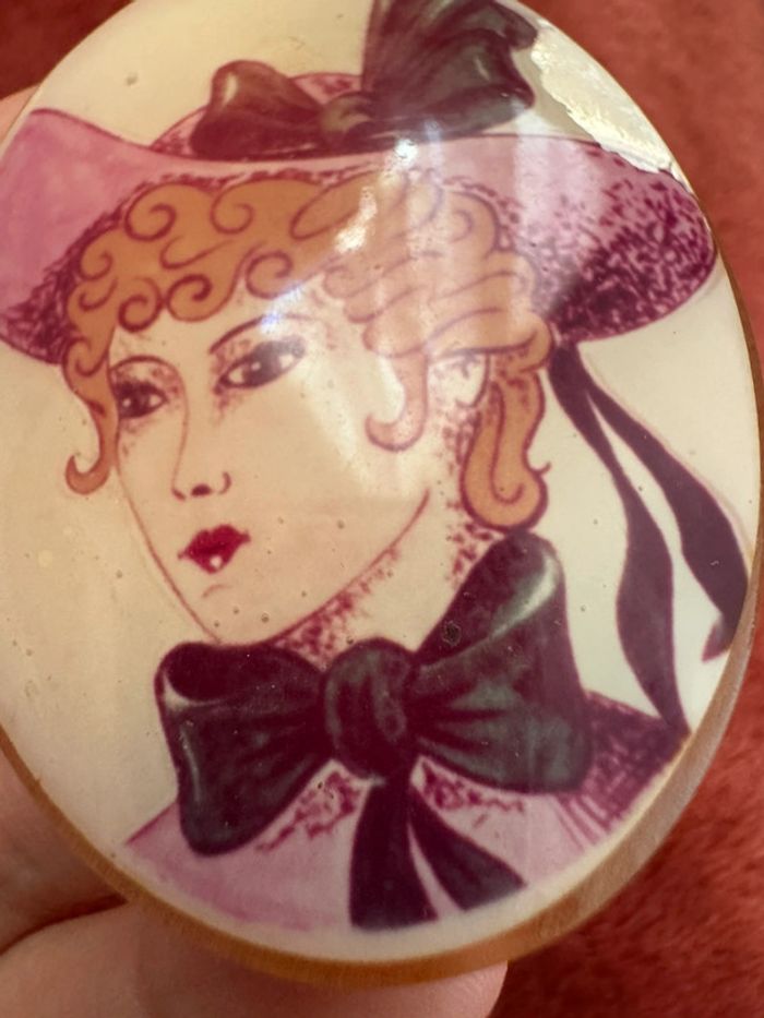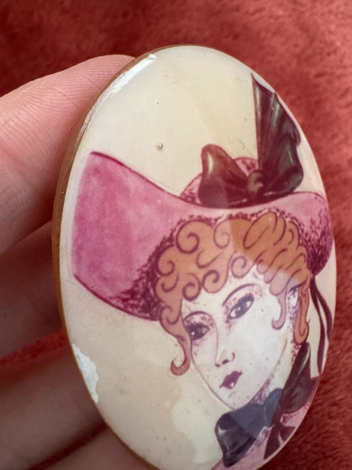 Grande broche ovale (env. 7 cm) représentant une femme élégante au chapeau rose et ruban noir, dans un style rétro romantique. Fixation par épingle à l’arrière. Quelques marques du temps visibles (voir photos), mais plein de charme !