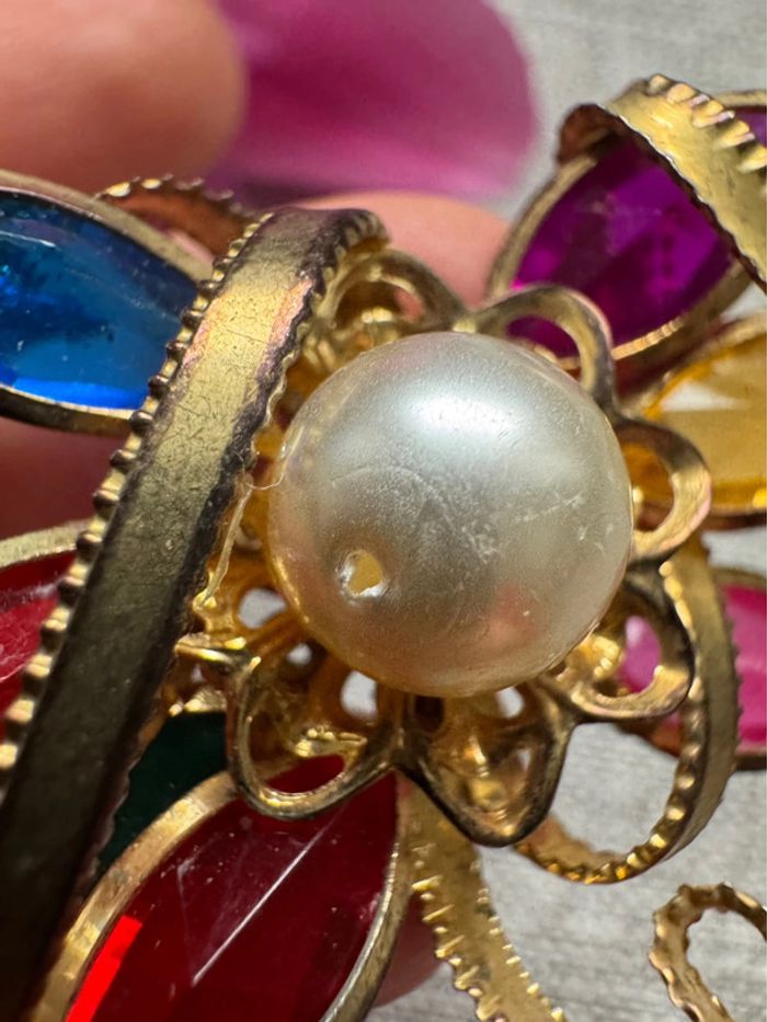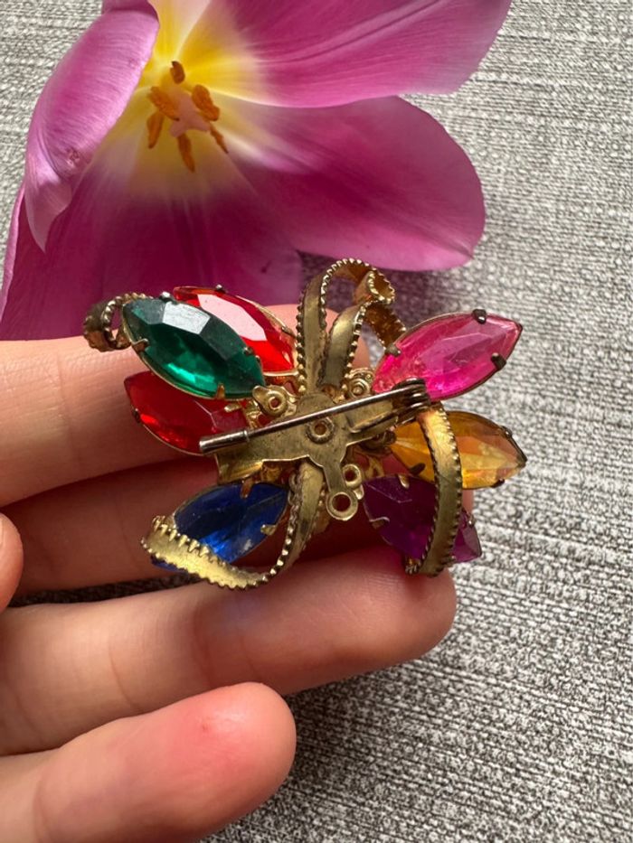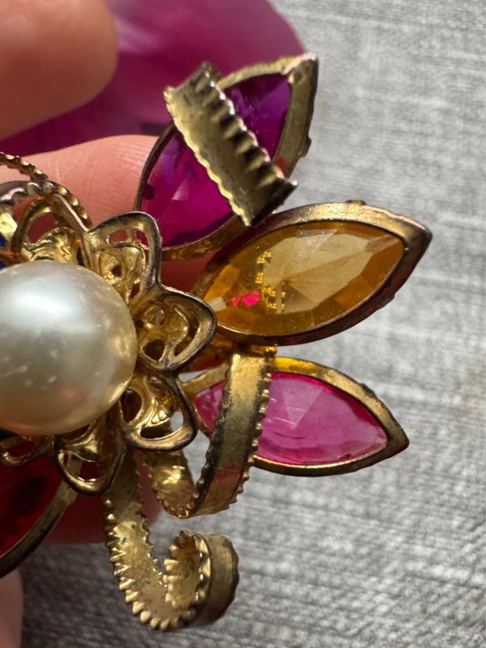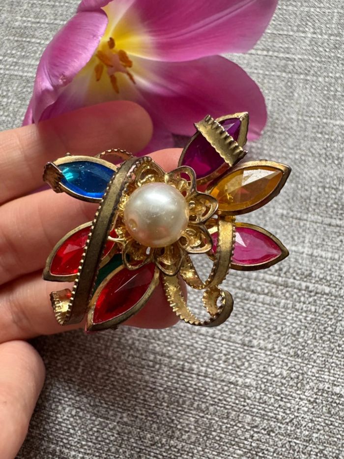 Broche vintage florale multicolore Magnifique broche vintage en métal doré, ornée de strass colorés en forme de pétales et d’une perle centrale. Son design fleuri et ses pierres éclatantes en font un bijou élégant et unique, parfait pour apporter une touche rétro à vos tenues