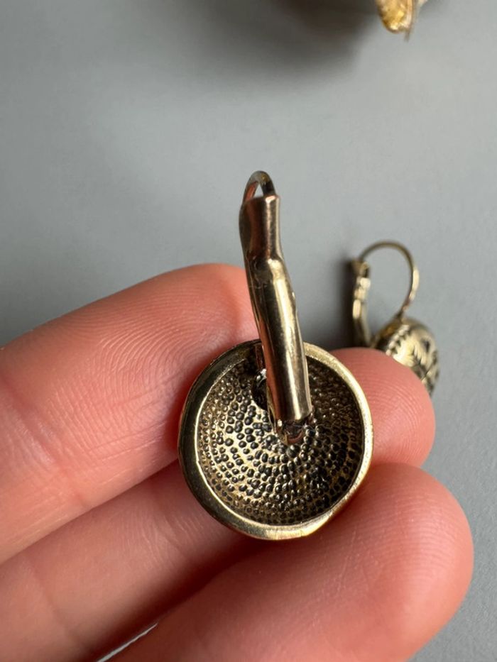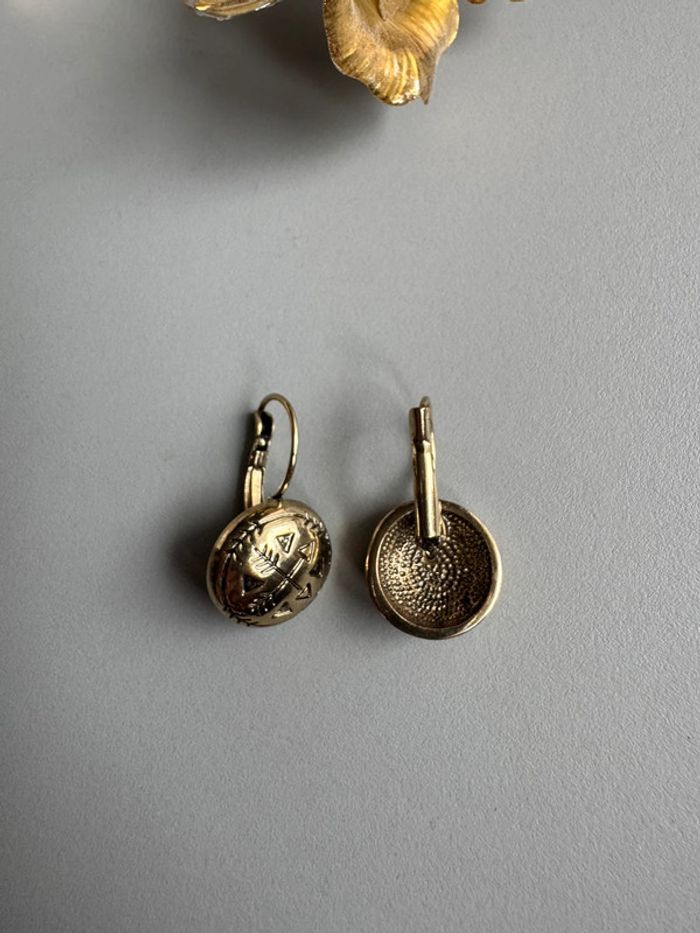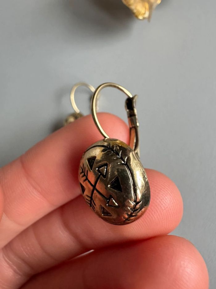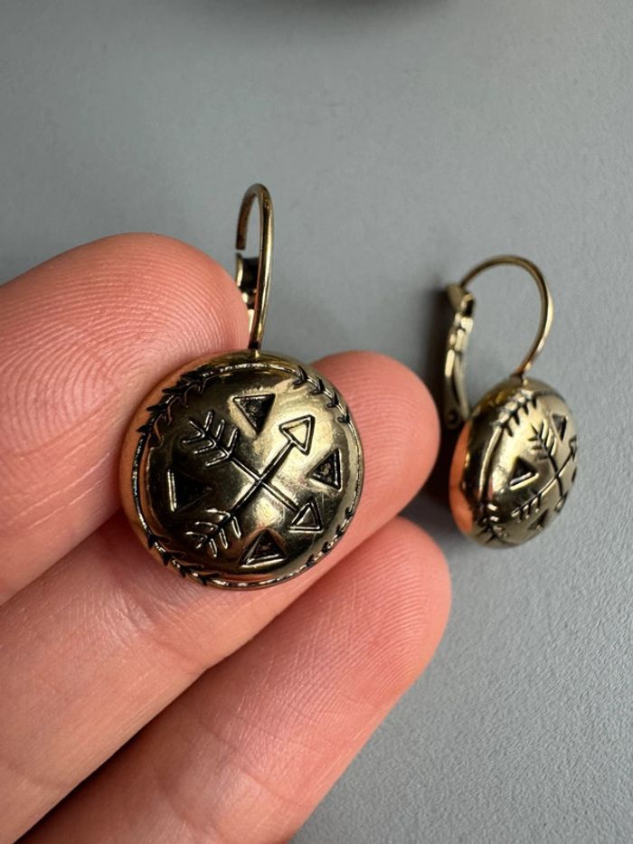 Boucles d’oreilles anciennes en métal doré, de style vintage, avec un motif gravé représentant des flèches croisées et des triangles. Elles ont un fermoir à levier et un design légèrement bombé, donnant un aspect artisanal et ethnique.