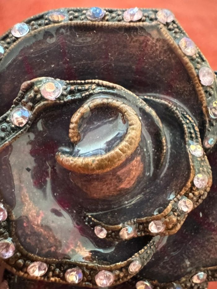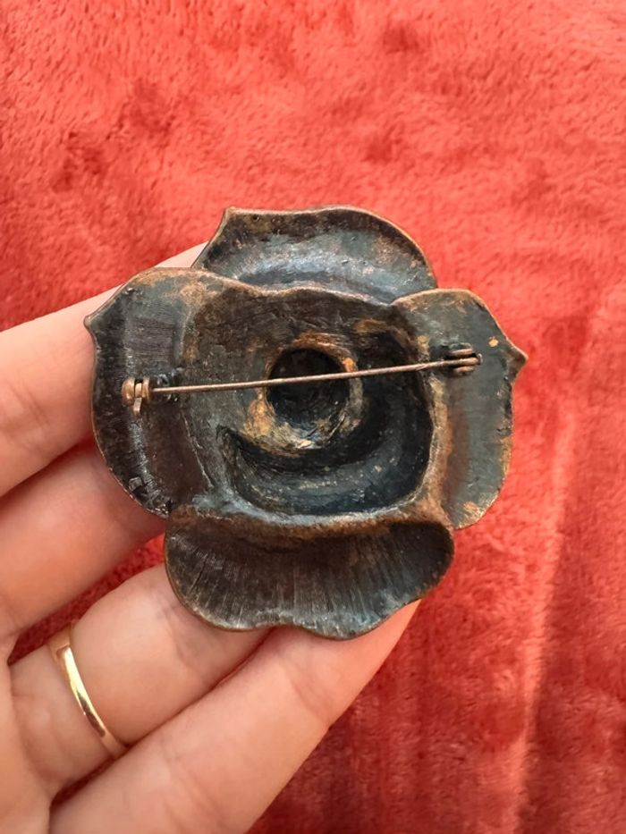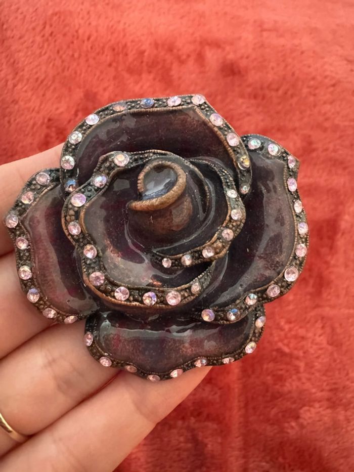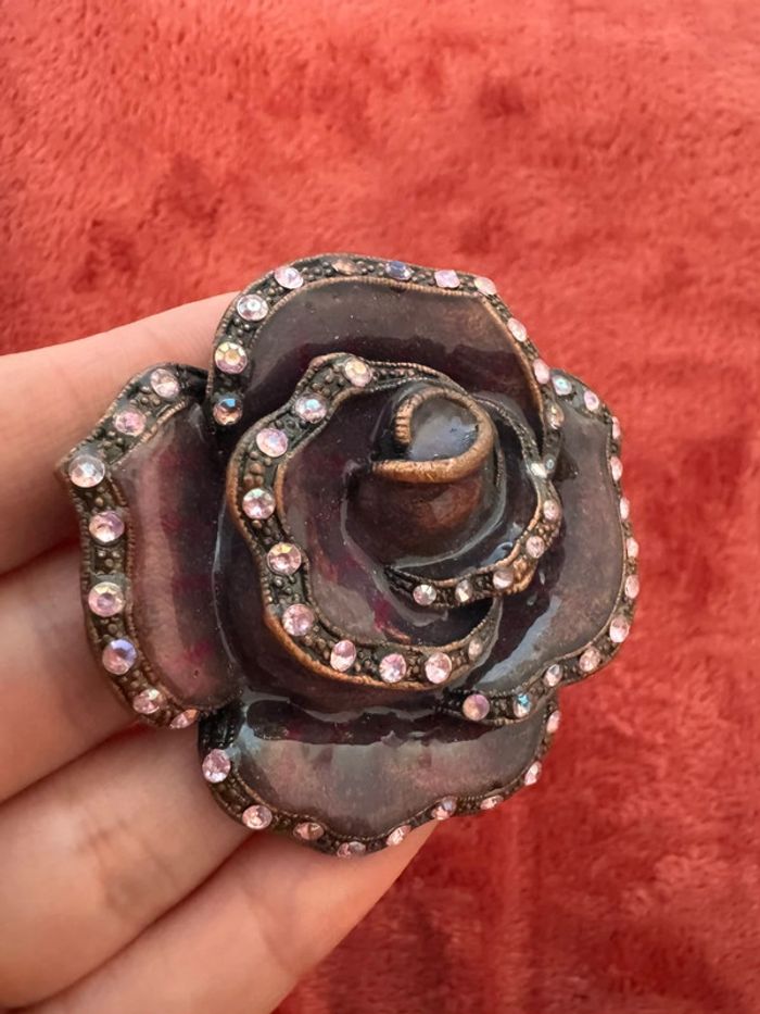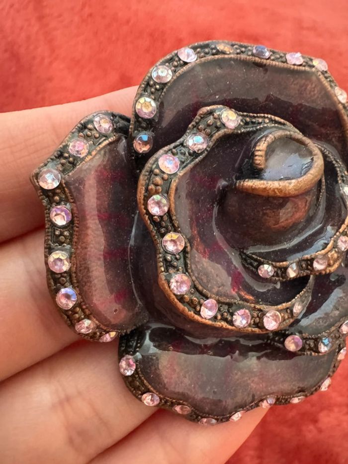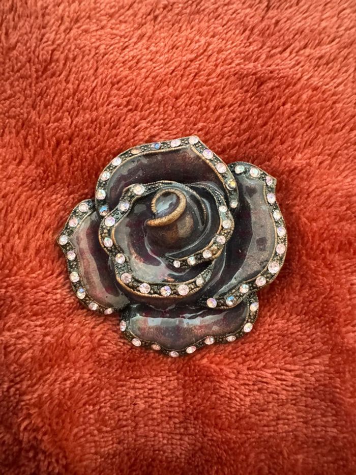 Charmante broche en forme de rose, décorée de strass brillants sur un support effet vieilli bronze. Parfaite pour accessoiriser vos tenues ou sublimer un chapeau, sac ou foulard. Un bijou au charme rétro, idéal pour les amateurs de pièces uniques.