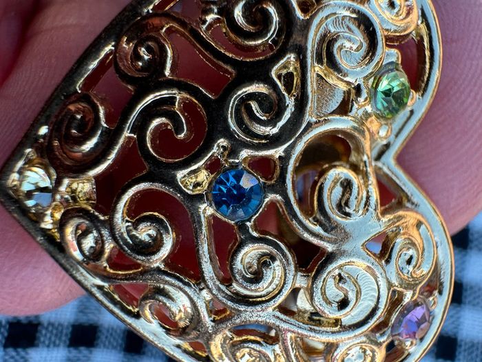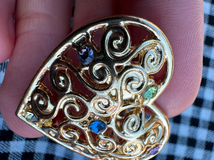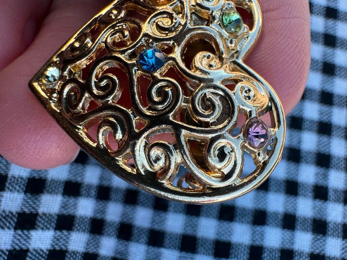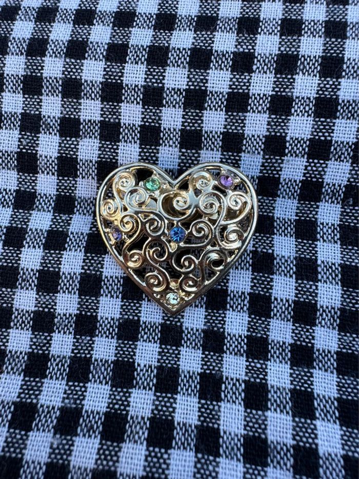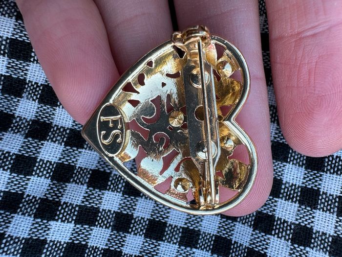 Broche vintage des années 80 forme coeur Ajouré en métal doré serti de cinq pierres, signée FS.
