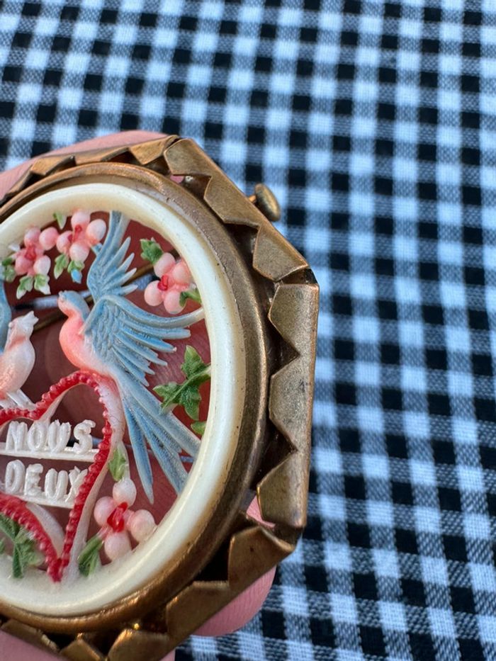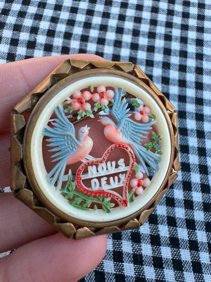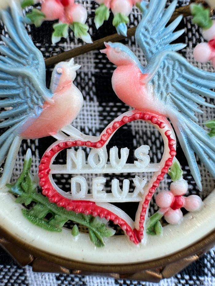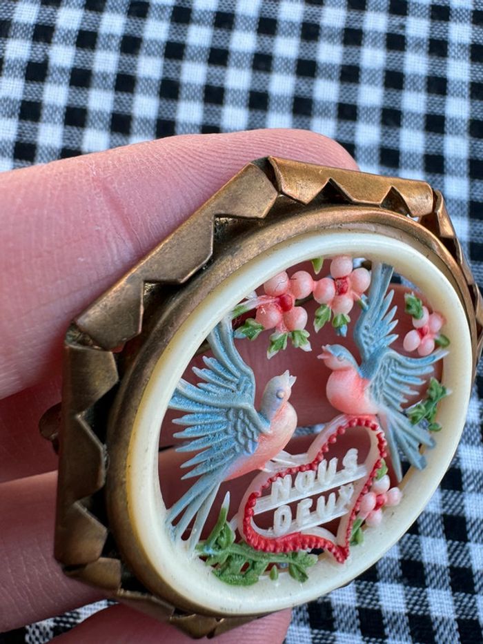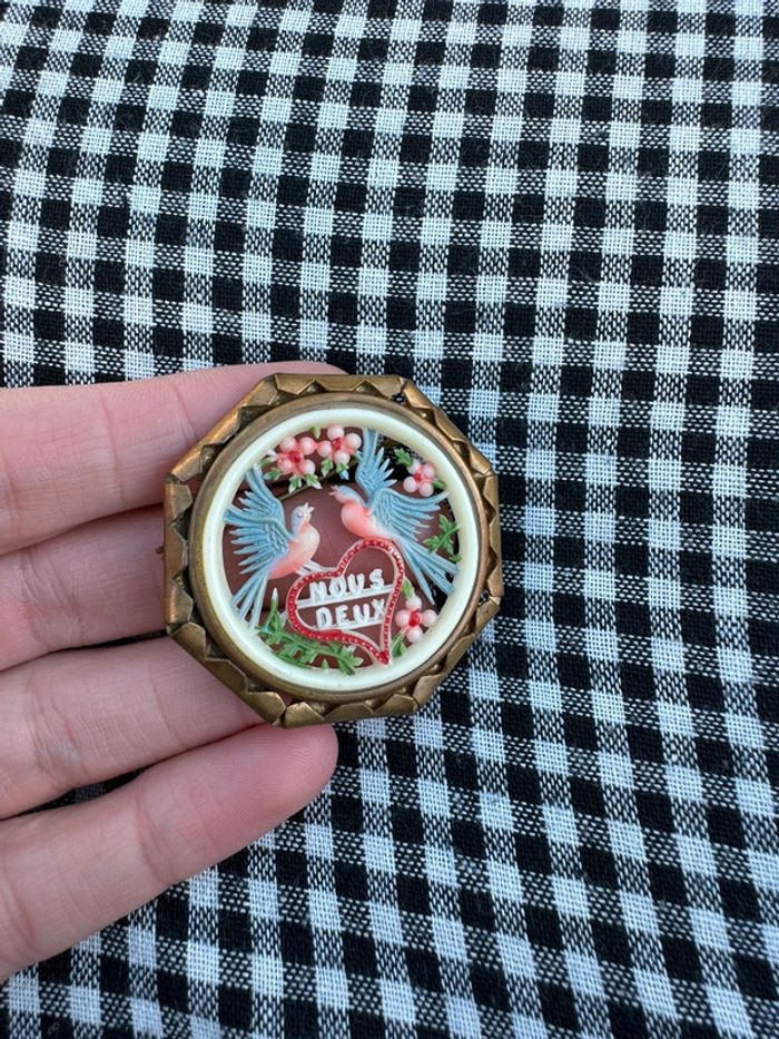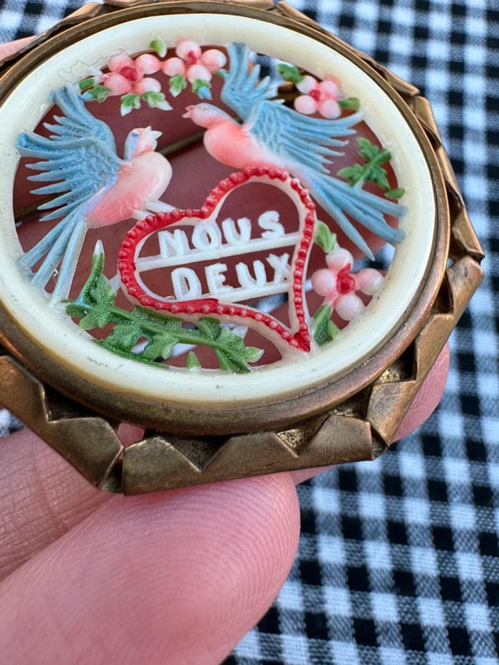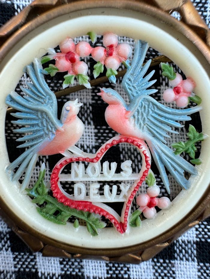 Broche en celluloïd sculpté. Nous Deux signifiant « nous deux » Tourtereaux avec fleur de myosotis. Designer - Non signé. Diamètre juste en dessous de 1,75" Trésor antique. Pièce rare.