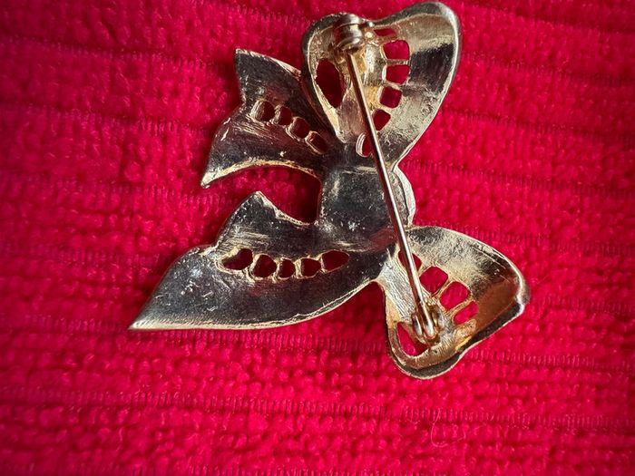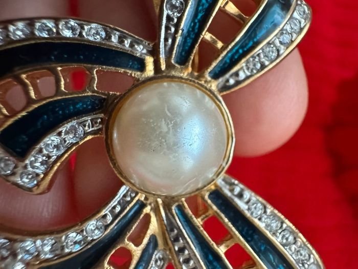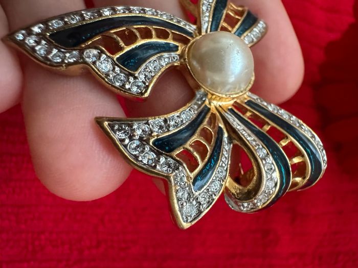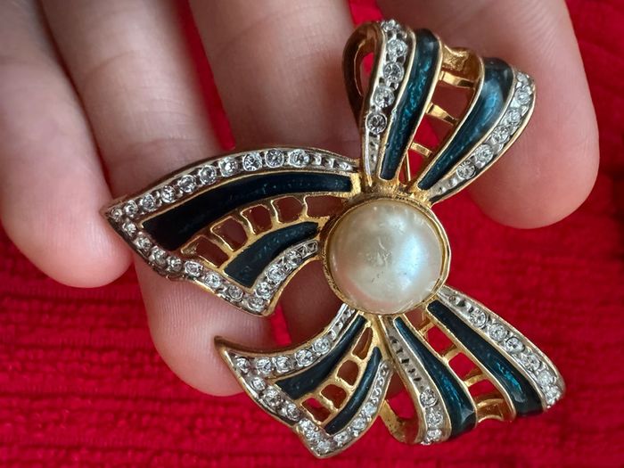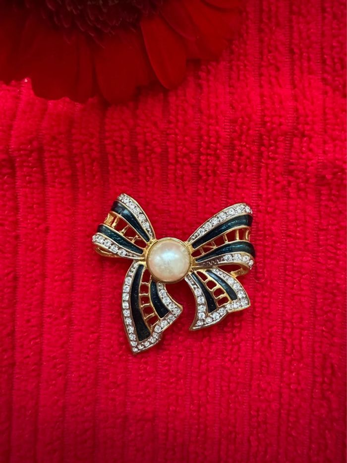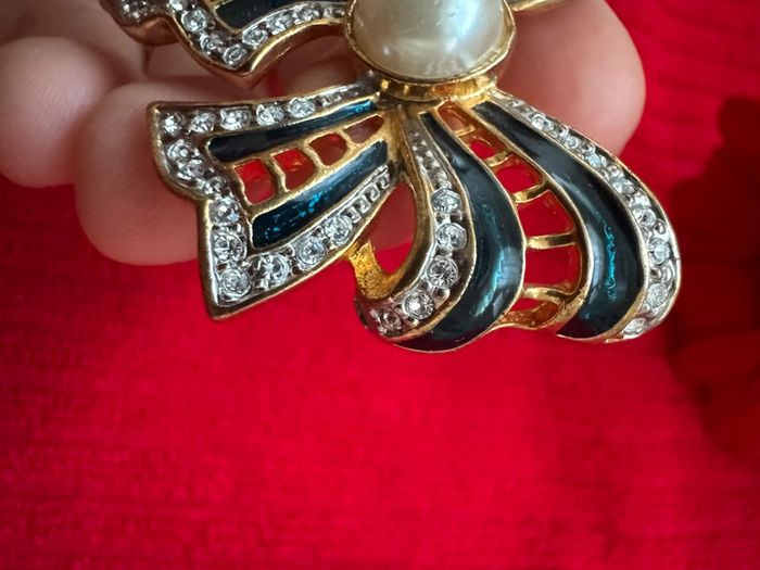 Cette jolie petite broche a tout pour plaire... Le métal doré est rehaussé d'émail noir, de strass et d'une fausse perle au centre ! Elle est parfaite pour un revers de veste ou un col, ou pour attacher une écharpe, et elle trouvera certainement une place de choix dans votre garde-robe de bijoux ! Tous les broches et autres articles sont d'occasion et certains sont très anciens, ils peuvent donc présenter des signes d'usure ou d'utilisation et sont tous vendus tels quels. J'essaierai de signaler tout défaut, mais veuillez vous satisfaire en utilisant les images, ce que vous voyez est ce que vous obtenez. Les images font partie de la description - veuillez les inspecter à l'aide du zoom - tout défaut majeur sera indiqué dans la description. Je comprends à quel point il est important de se sentir heureux et confiant lors d'un achat en ligne, donc je serai toujours heureux de répondre à toutes les questions que vous pourriez avoir ou envoyer des photos supplémentaires