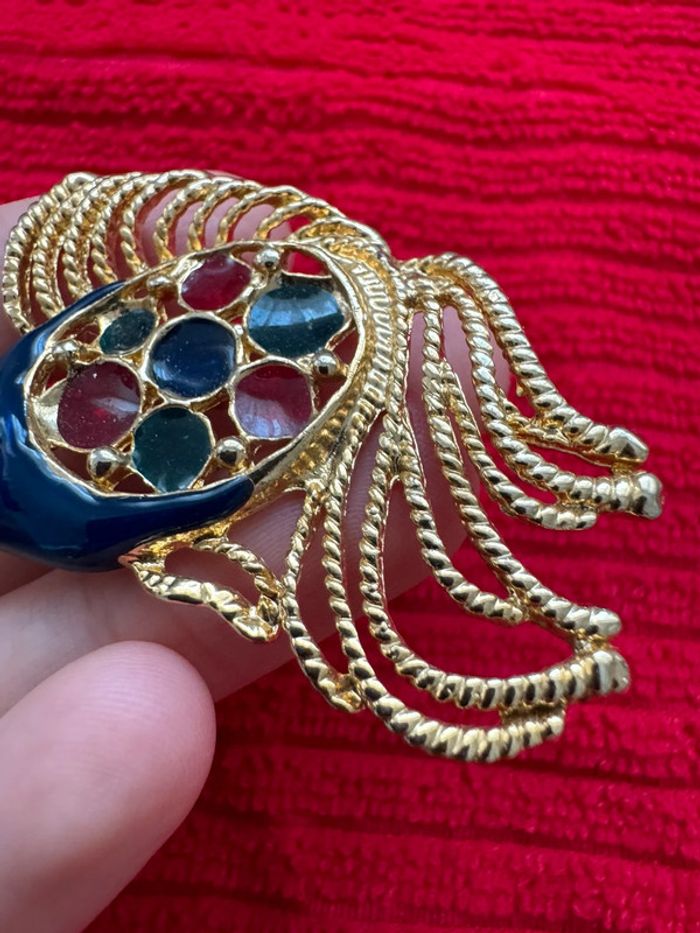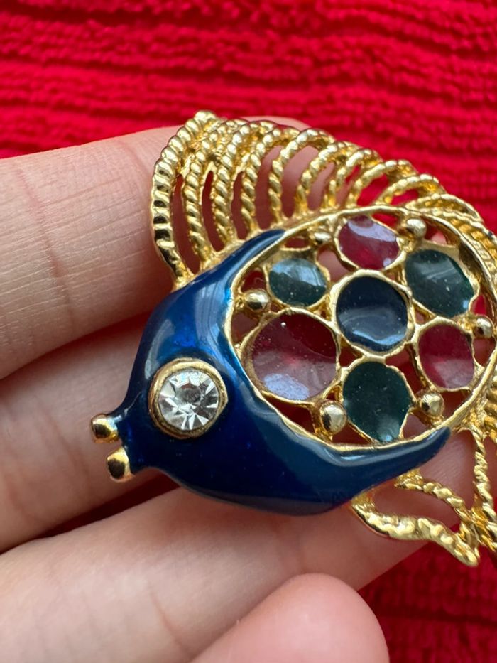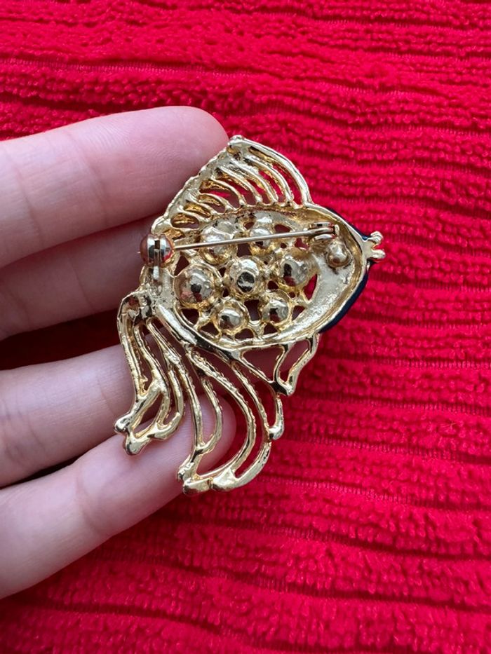broche rétro en métal couleur or poli brillant en forme de poisson en relief ajouré avec émail en couleur et son œil en cristal diamant dimension 4 cm x 5.5cm poids 20 grammes