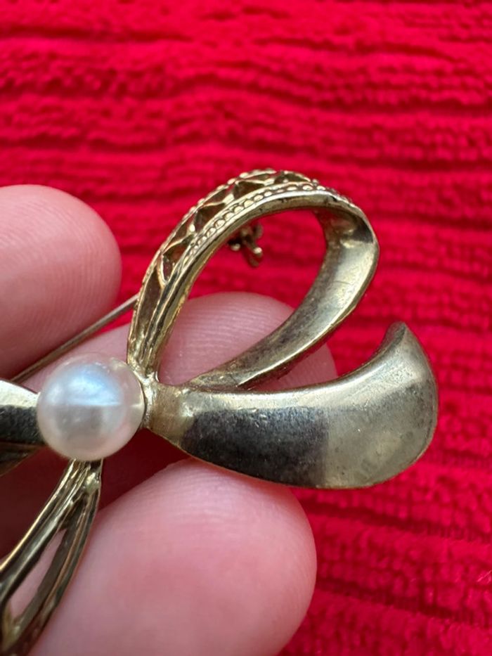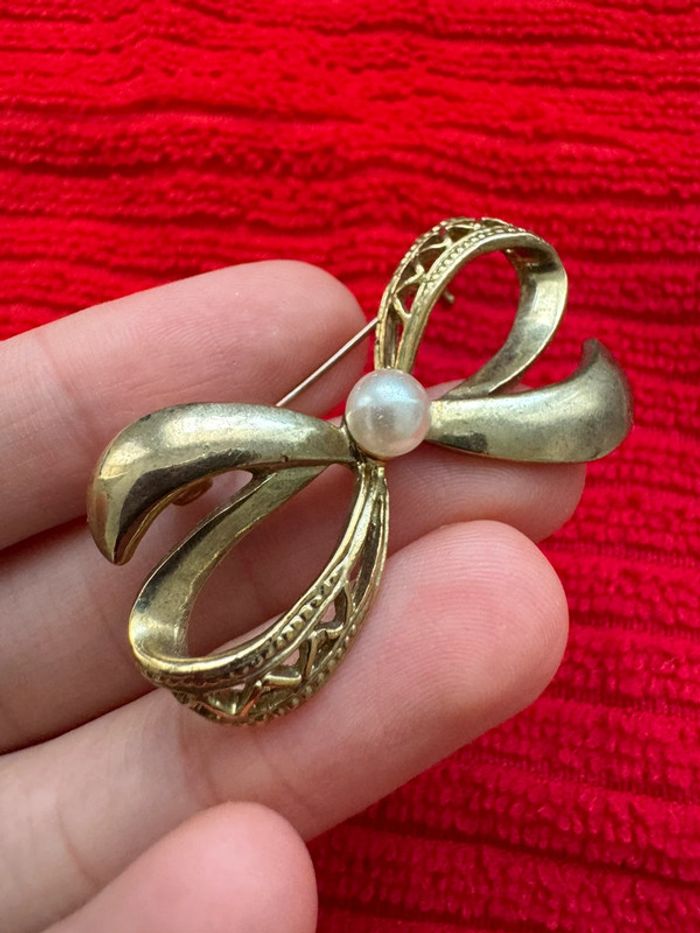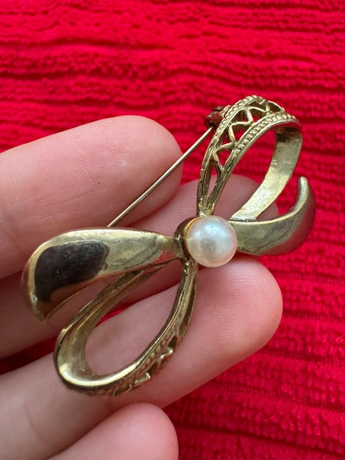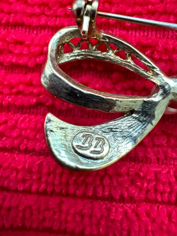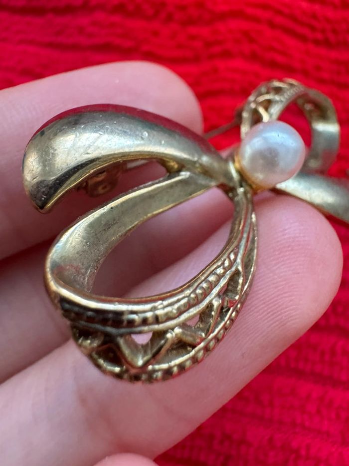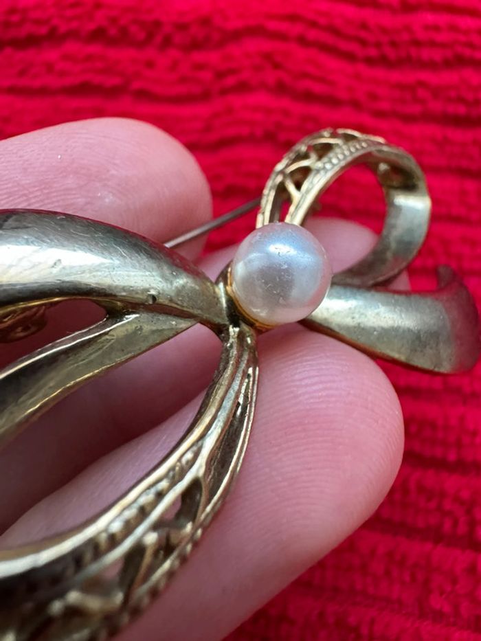 Élégante broche vintage française,noeud avec motif sculpté en creux, petite perle artificielle blanche au centre. Au dos de la broche, il y avait un soupir « BB ». Taille : 4,5 cm de diamètre, 2,3 cm de hauteur. Plaqué or.