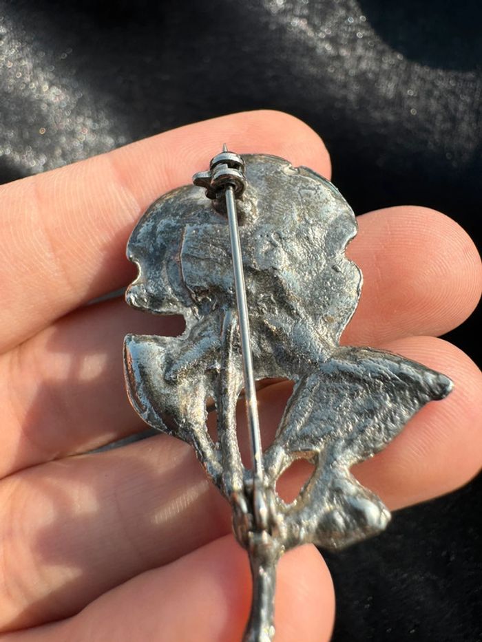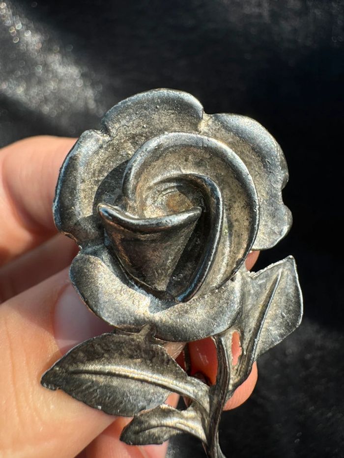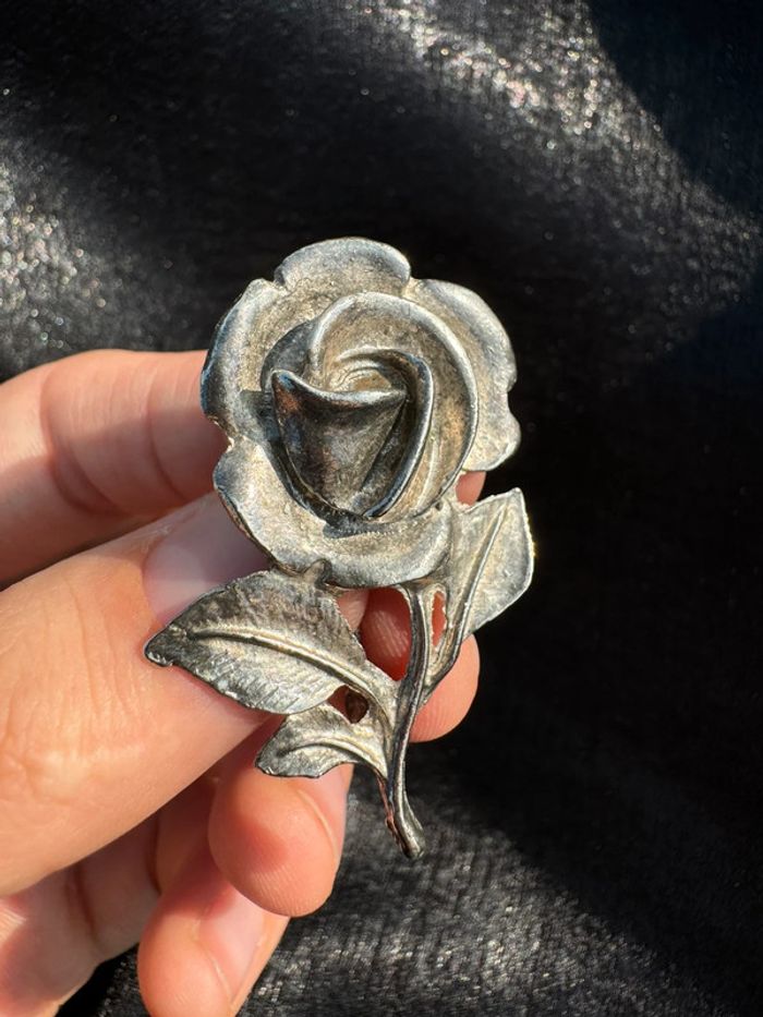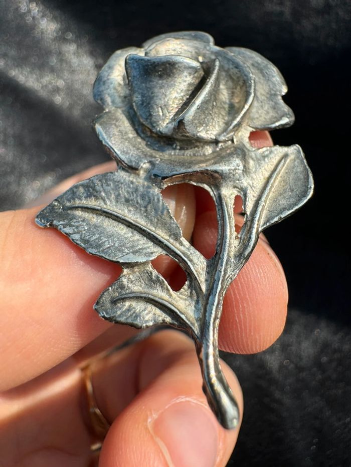 broche vintage couleur argent poli brillant en forme de fleur en relief