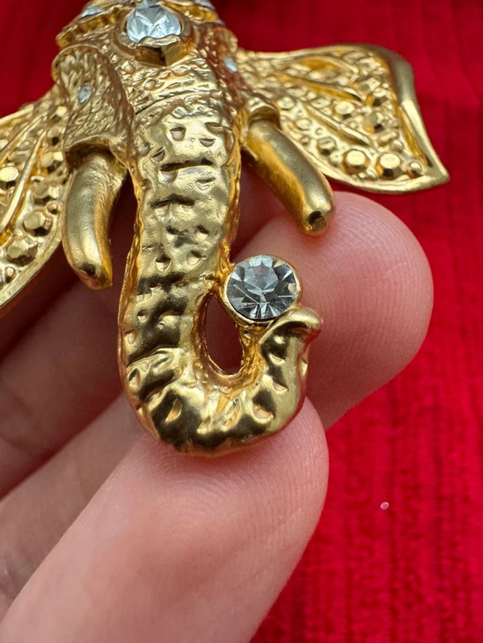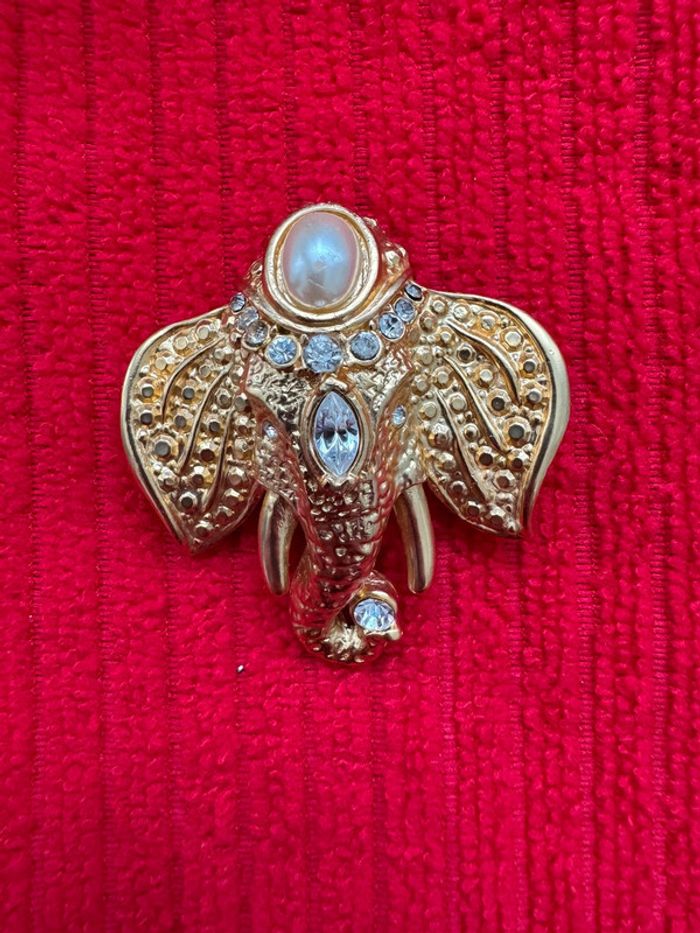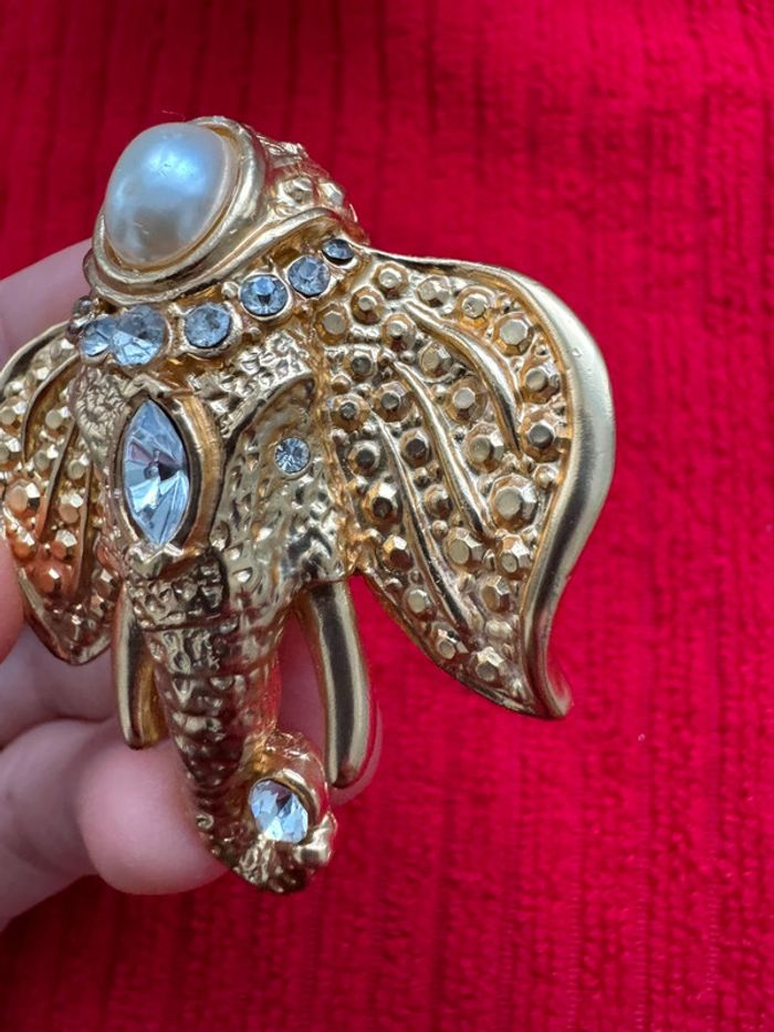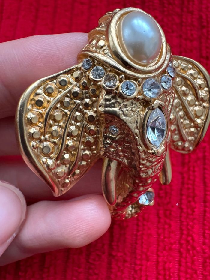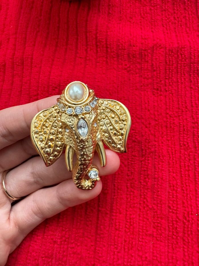 Superbe grande broche éléphant dorée avec de fausse perle et des ornements en strass transparents