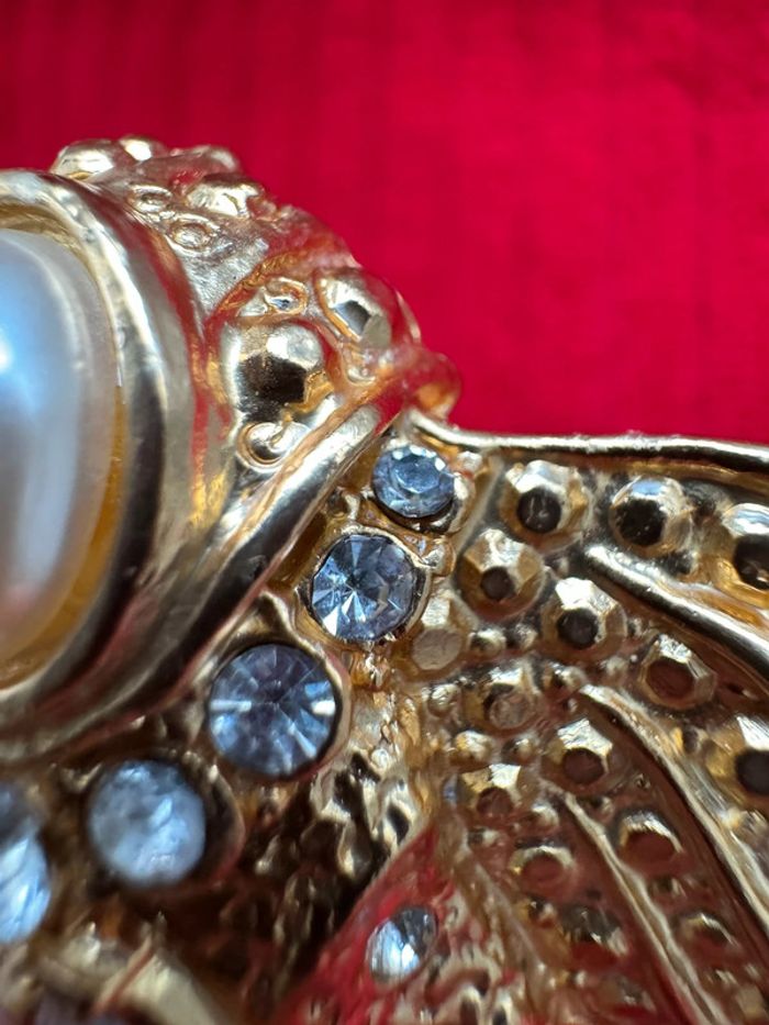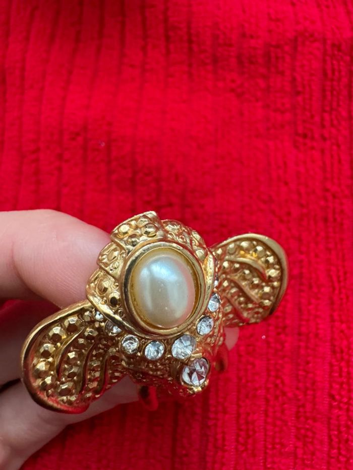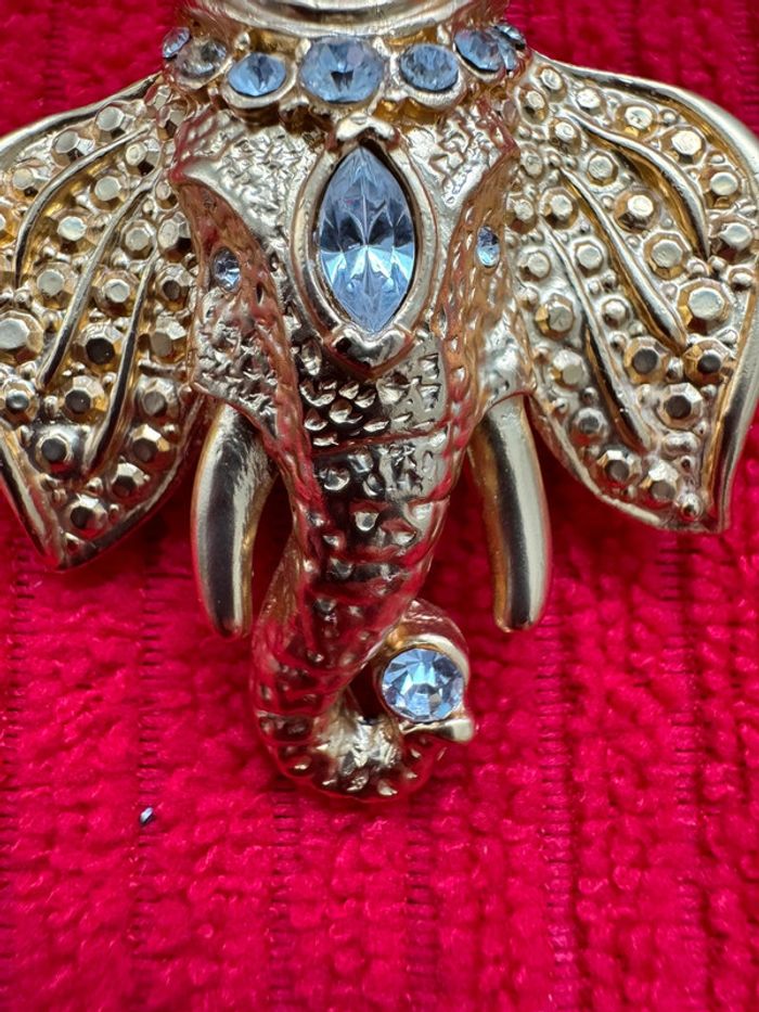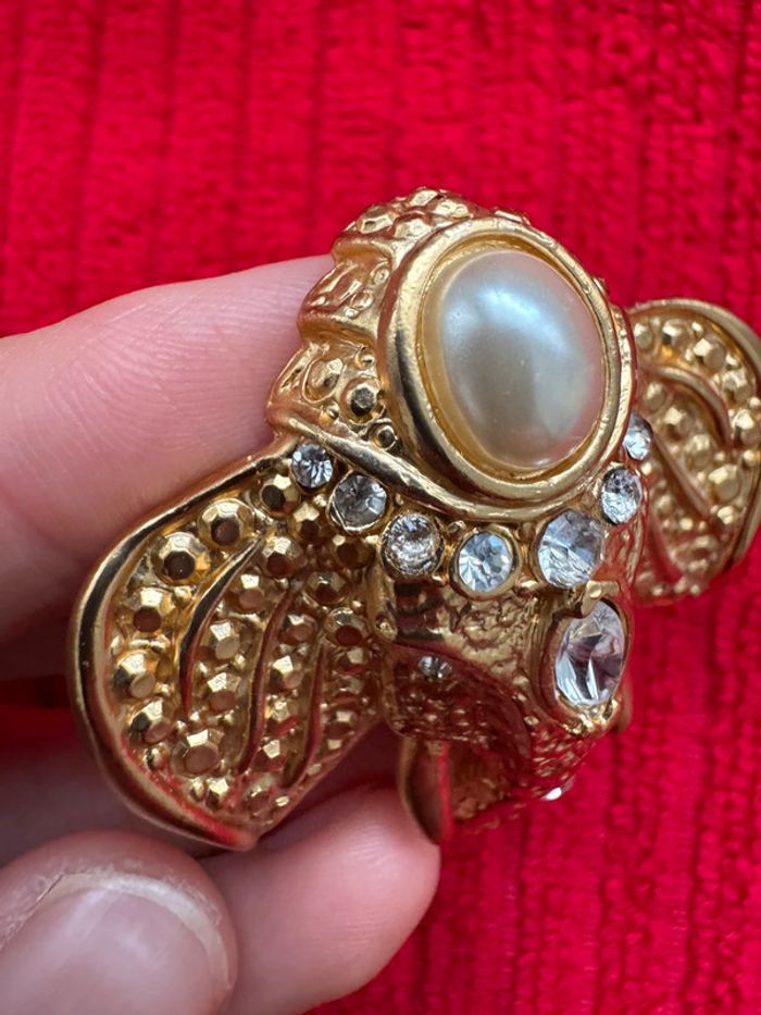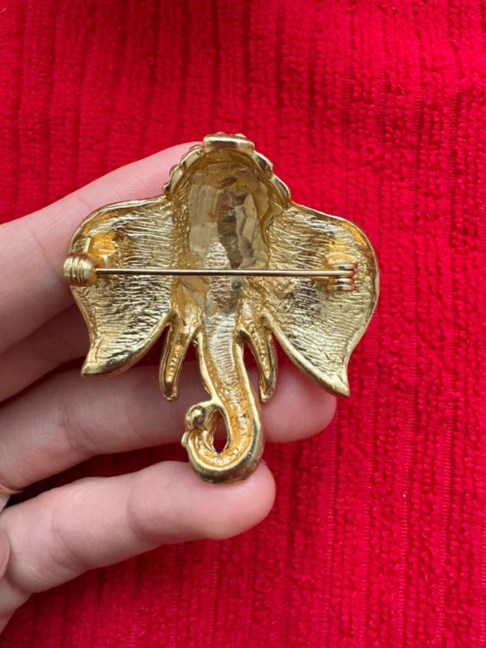 Superbe grande broche éléphant dorée avec de fausse perle et des ornements en strass transparents