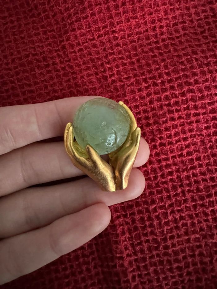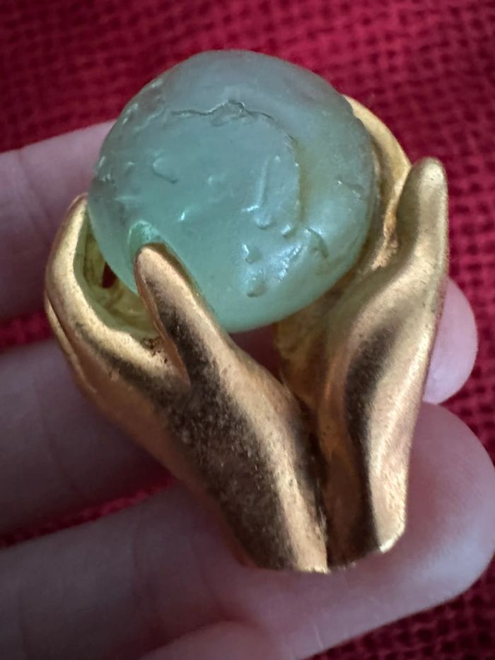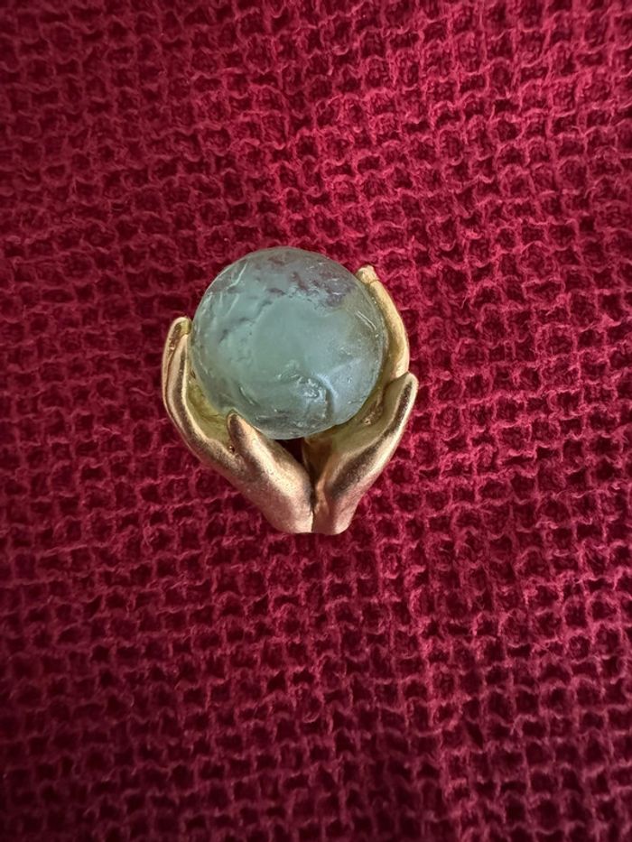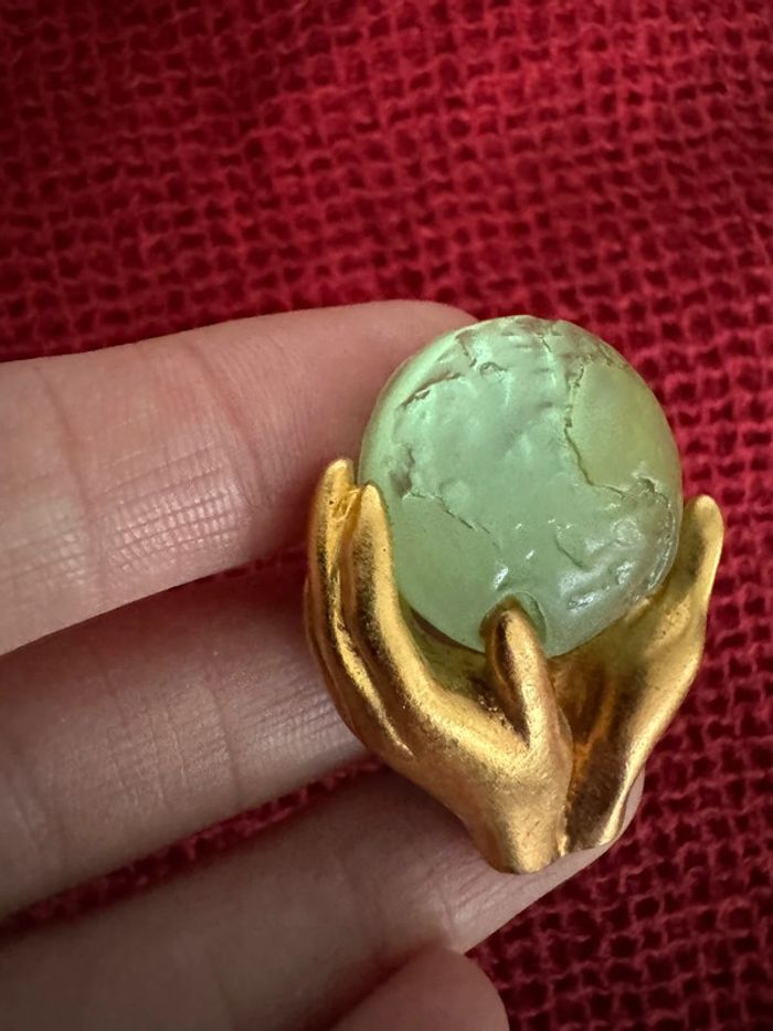 Broche Découvrez l'élégance redéfinie avec cette exquise broche de bijoutier français représentant des mains tenant délicatement le monde, réalisée en verre dépoli. Cette pièce d'apparat étonnante incarne la sophistication et l'allure mondiale.