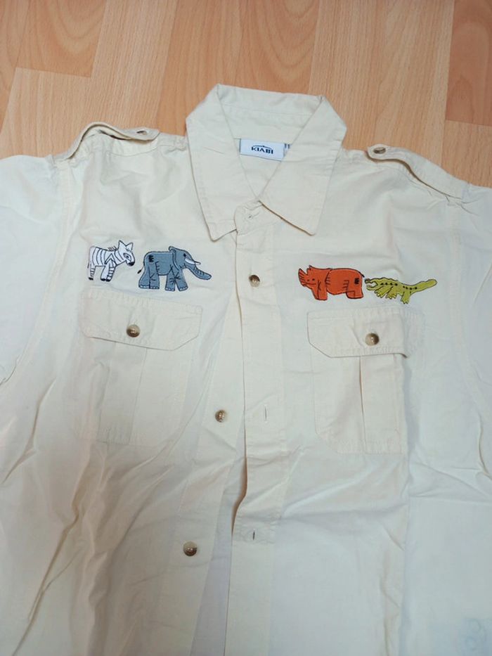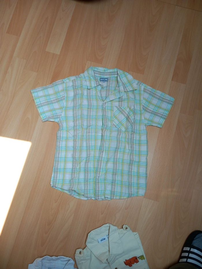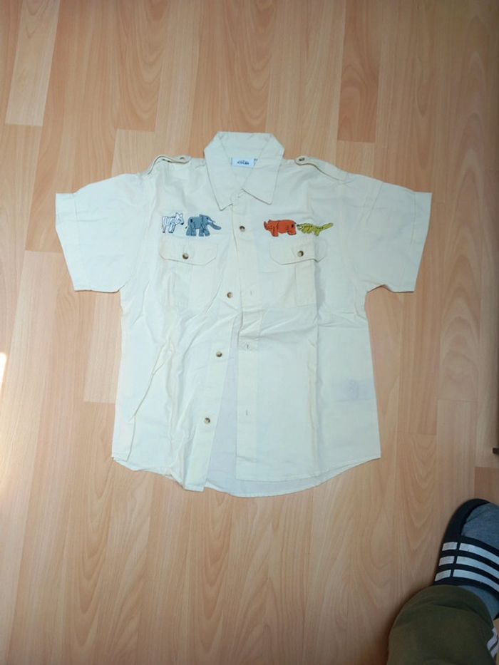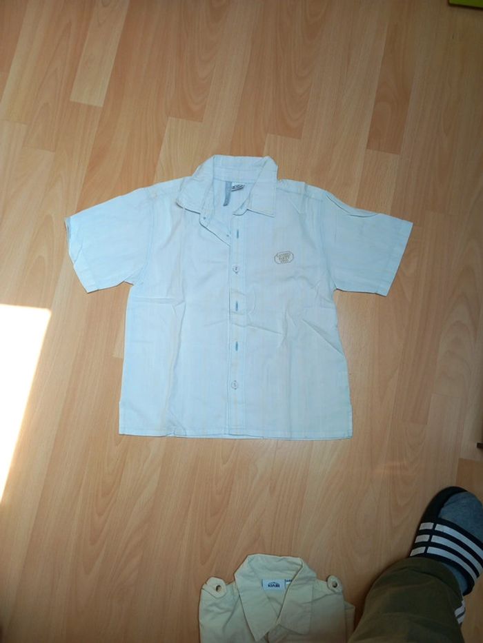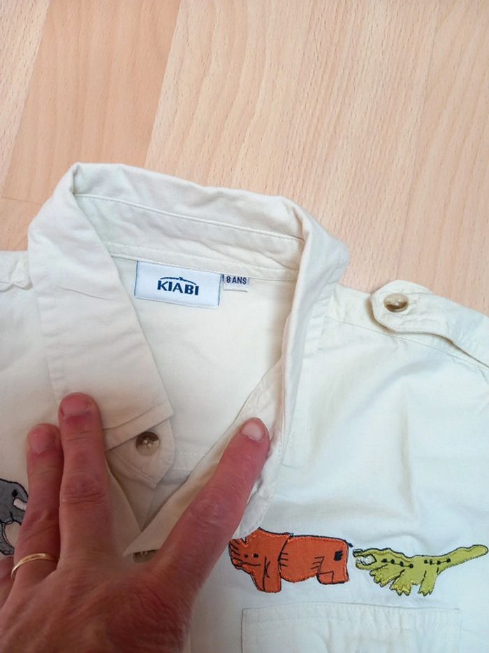 Vends lots de 3 chemises garçons manche courte comprenant : une chemise blanche ,vert et marron "best Way" taille 8 ans - une chemise blanche rayée bleu clair et jaune (coloris très pâle) "Tout compte fait". Taille 8 ans Un légère tâche à l'avant. (Photo 9) - une chemise crème avec motifs animaux à l'avant. NEUVE, jamais portée "Kiabi" Taille 8 ans
