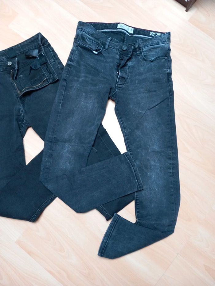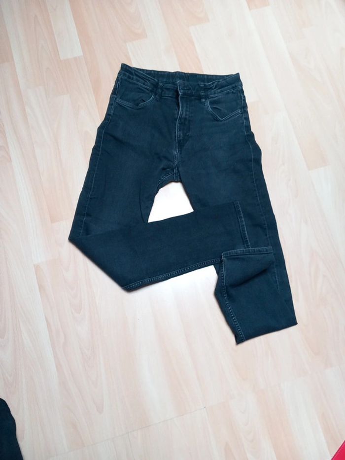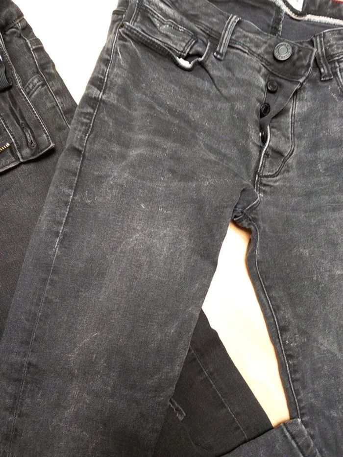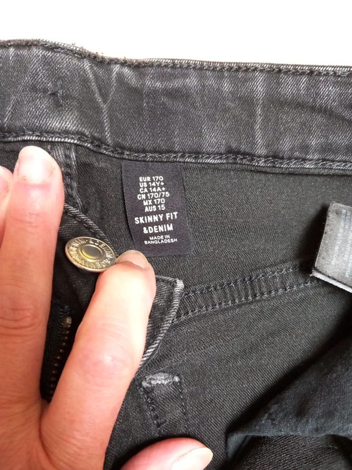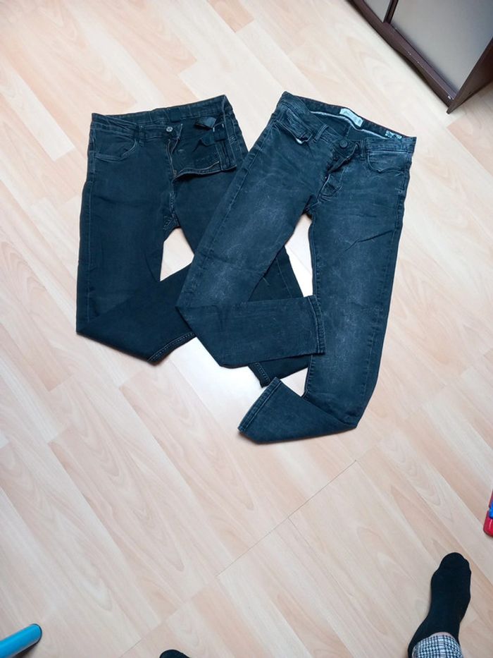 Taille 14 ans environ. - Un noir délavé avec fermeture boutons. Porter que 2 fois. - Un noir fermeture et taille réglable par un élastique. Celui ci a été porté. La couleur est légèrement défraîchie. Aucun trous sur les deux. Jean skinny fit les deux 8€ les deux