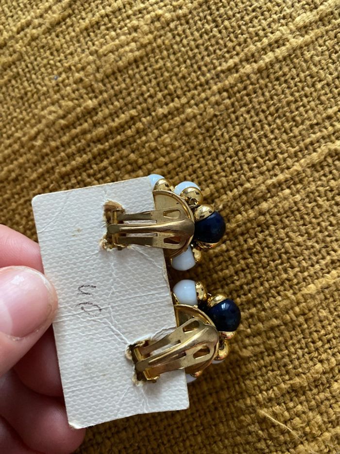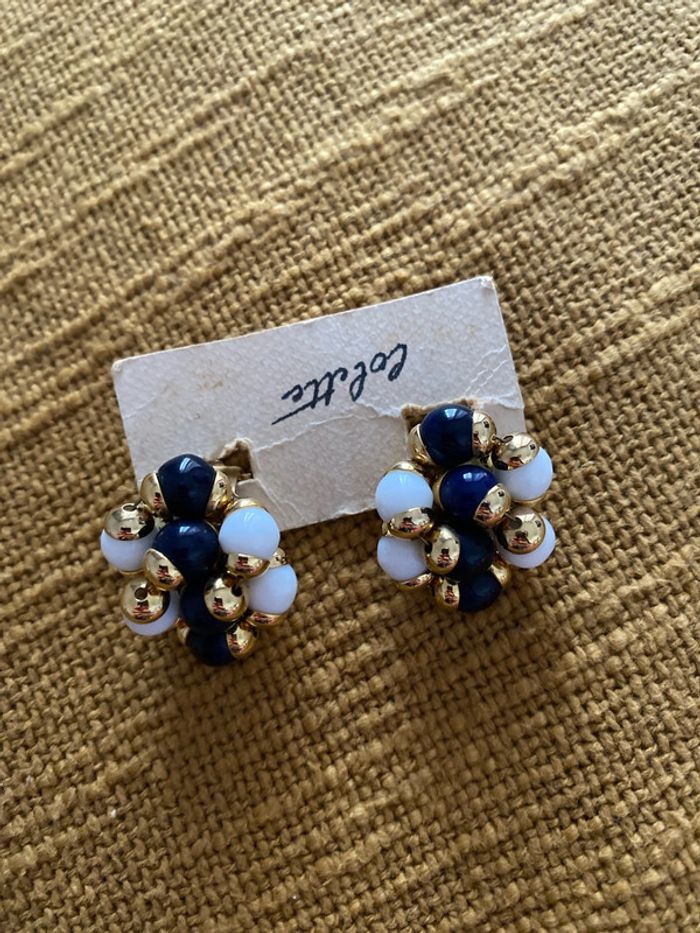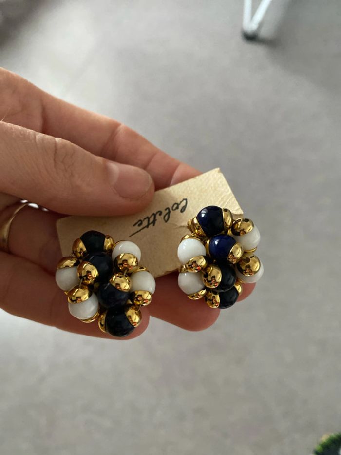 BOUCLES D'OREILLES OLIVE VINTAGE De superbes pièces de collection, pour les adeptes de fantaisies ! Couleur : Doré,blanc,marine Matière : Métal Fermeture : Clips Etat : très bon état Fabrication : Made in France