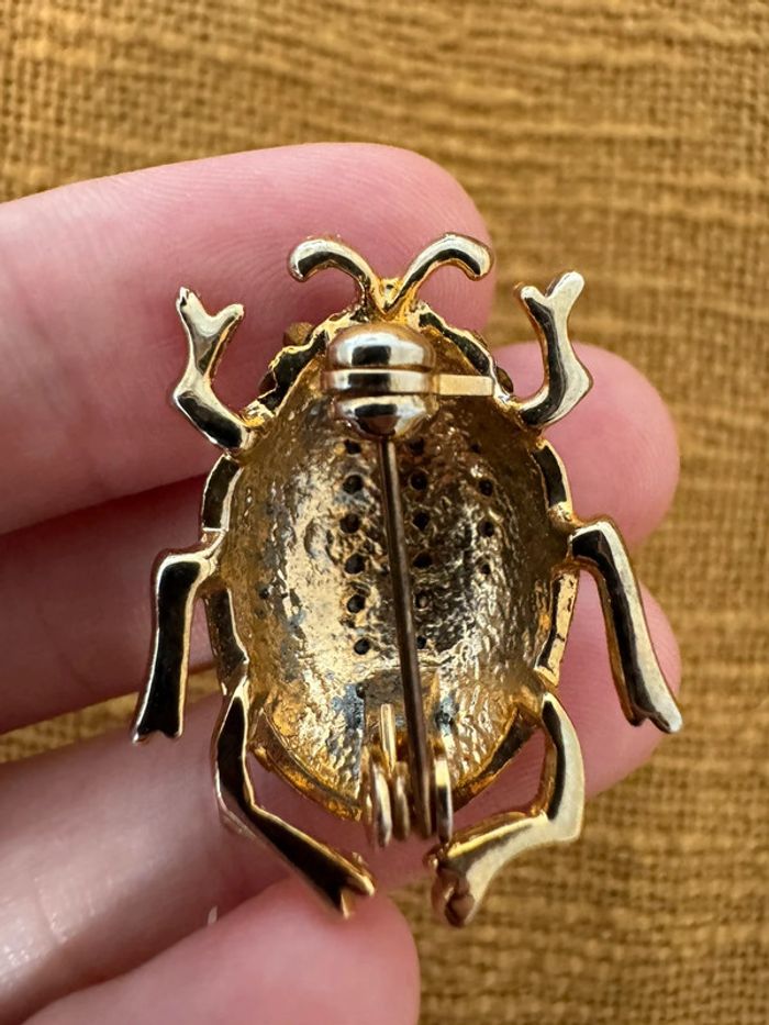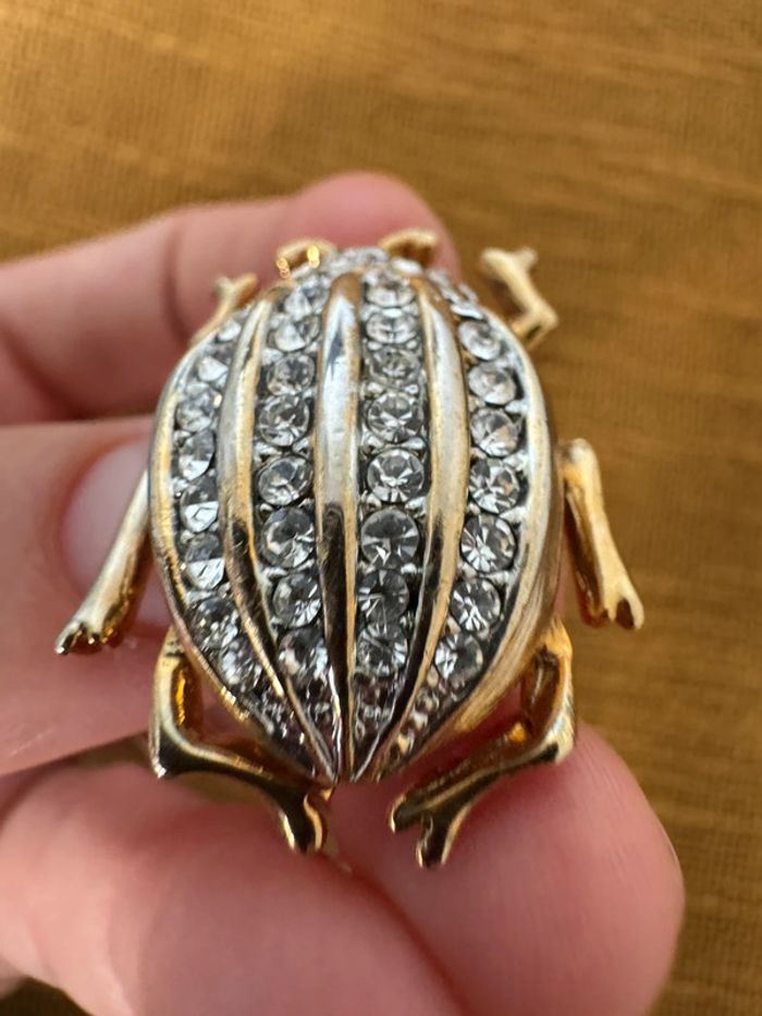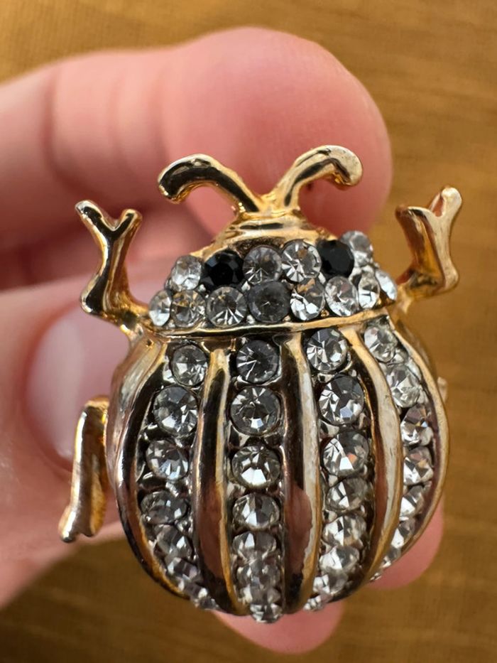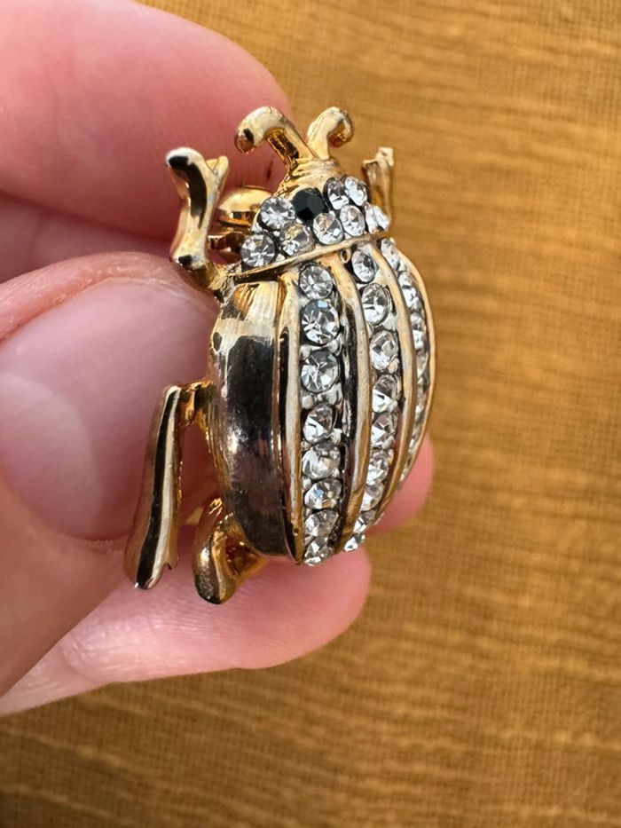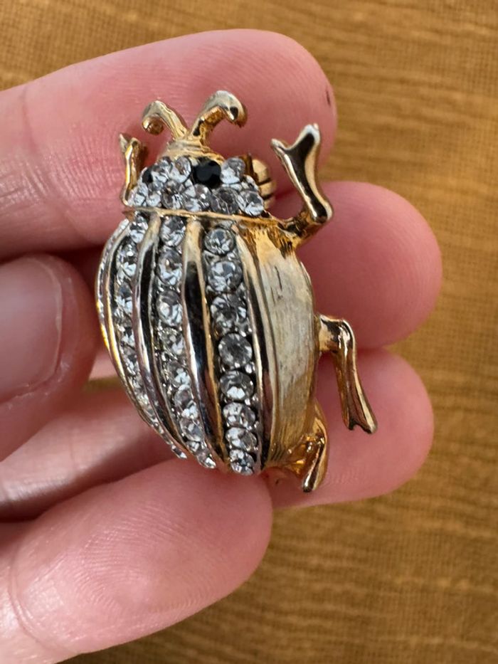 Broche ancienne scarabée Dorée avec strass argenté et noir