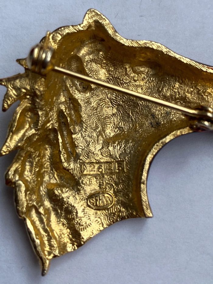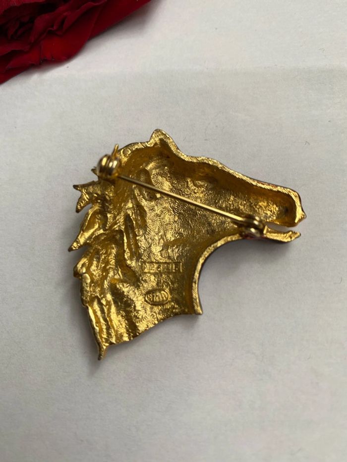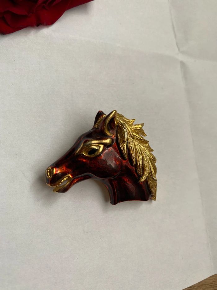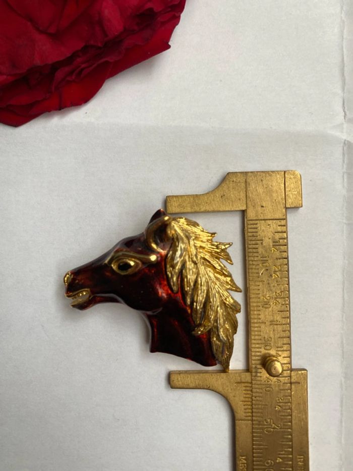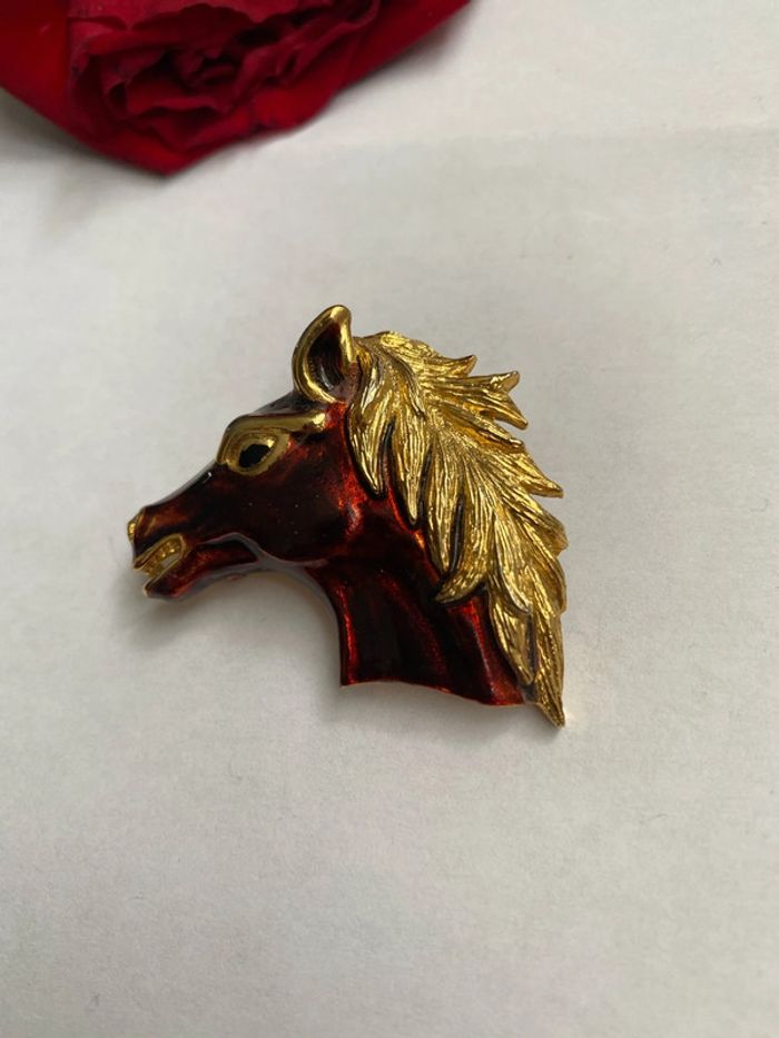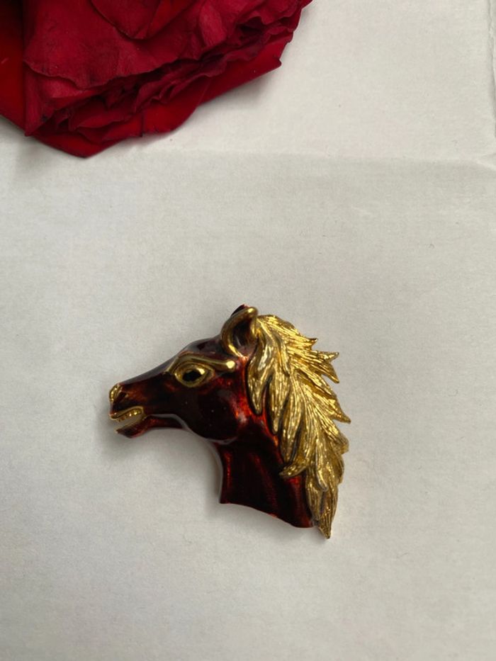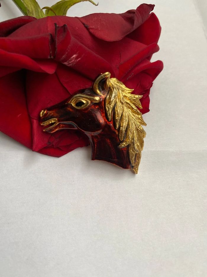 Très belle broche dorée représentant la tête d'un cheval, crinière au vent ! La tête est émaillée brun rouge alors que la crinière, les oreilles, paupières, narines et bouche sont dorées.